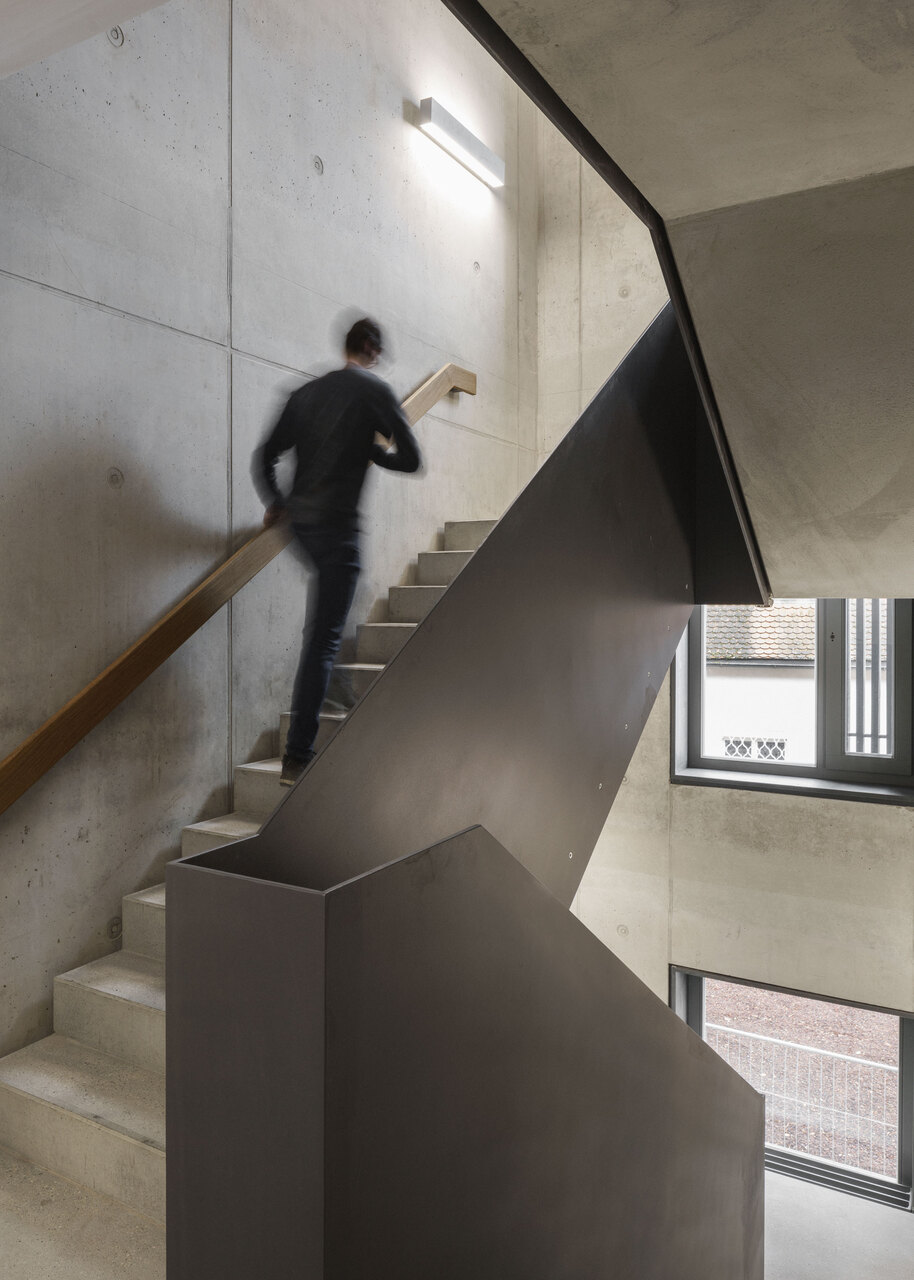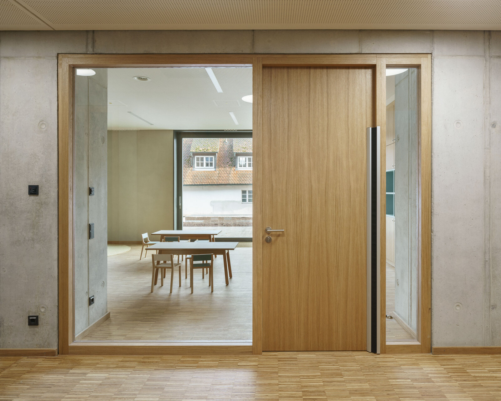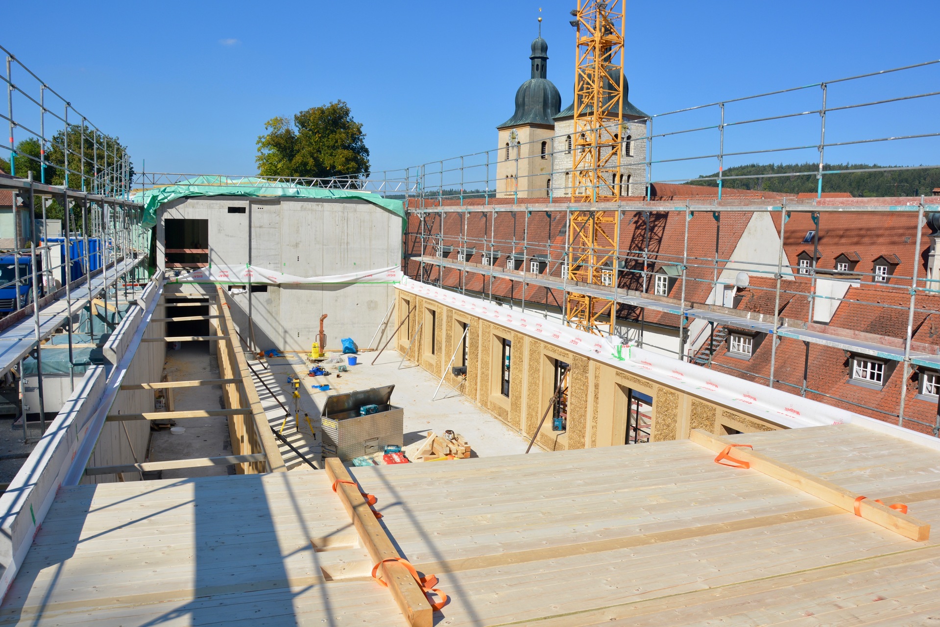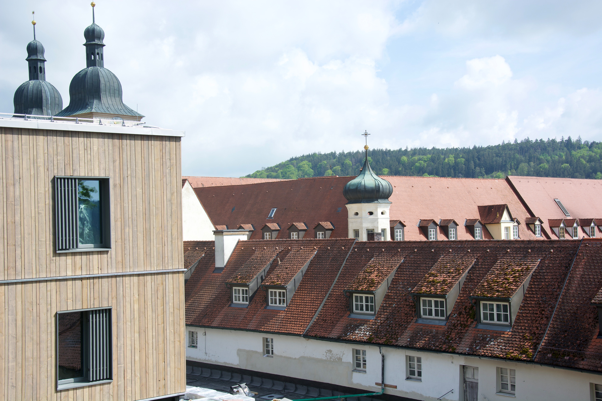 Herstellung zur Verwendung. Durch die gezielte Auswahl von dauerhaften, gut alternden Materialien lässt sich der Lebenszyklus der Gebäude verlängern, der Betrachtungszeitraum für die CO2-Bilanz erweitert sich dementsprechend. Die im Klosterwald geschlagenen und im Sägewerk gesägten Baumstämme wurden nach deren Trocknung von einer nahegelegenen Zimmerei abgebunden und verarbeitet. In Rückgriff auf die im historischen Bestand vorhandenen Mann-an-Mann-Decken wurden vorgefertigte, 3,35 m breite Deckenelemente aus nebeneinanderliegenden, miteinander verdübelten Deckenbalken eingebaut. Um Spannweiten von über 10 m zu ermöglichen wurden die Decken mit Aufbeton versehen und als Holz-Betonverbundecken ausgeführt. Neben den ökologischen Vorteilen der Konstruktion erzeugen die Balken mit ihren Kernen und Rissen eine sehr schöne Deckenuntersicht. Zur Verwendung kamen insgesamt 500 massive Balken, die Wertschöpfung verbleibt so zum größten Teil bei den ausführenden regionalen Firmen.