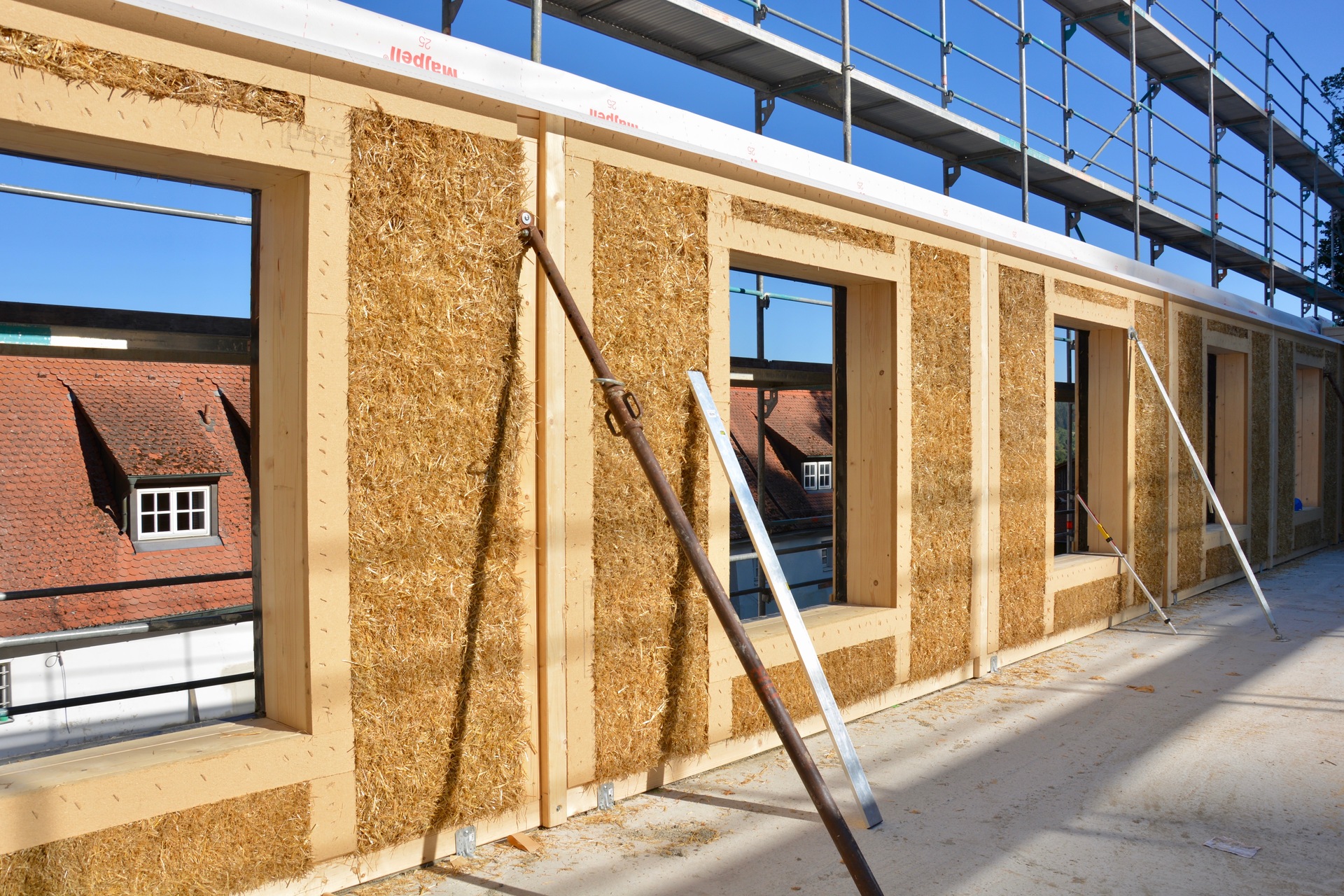 Für die Verwendung in Baustrohballen kam möglichst goldgelbes, langhalmiges Getreidestroh aus Weizen und Roggen zum Einsatz. Im Wachstum entzieht das Stroh der Atmosphäre CO2. Die Herstellung der Strohdämmballen verbraucht nur minimale Energiemengen, dämmt hervorragend und lagert für die gesamte Nutzungsdauer CO2 im Gebäude ein. Sie bildet keine Flächenkonkurrenz zum Anbau von Nahrungsmittelpflanzen, und entsteht „nebenbei“ im ablaufenden landwirtschaftlichen Ernteprozess. Zudem wächst es jährlich nach. Ein weiterer Vorteil des Strohs ist der einfache Rückbau durch Kompostierung. Stroh speichert zudem Wärme und bewirkt so einen guten sommerlichen Wärmeschutz.