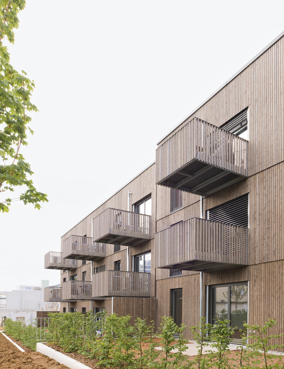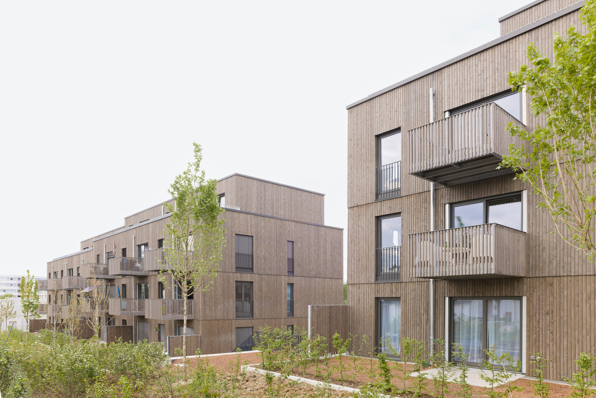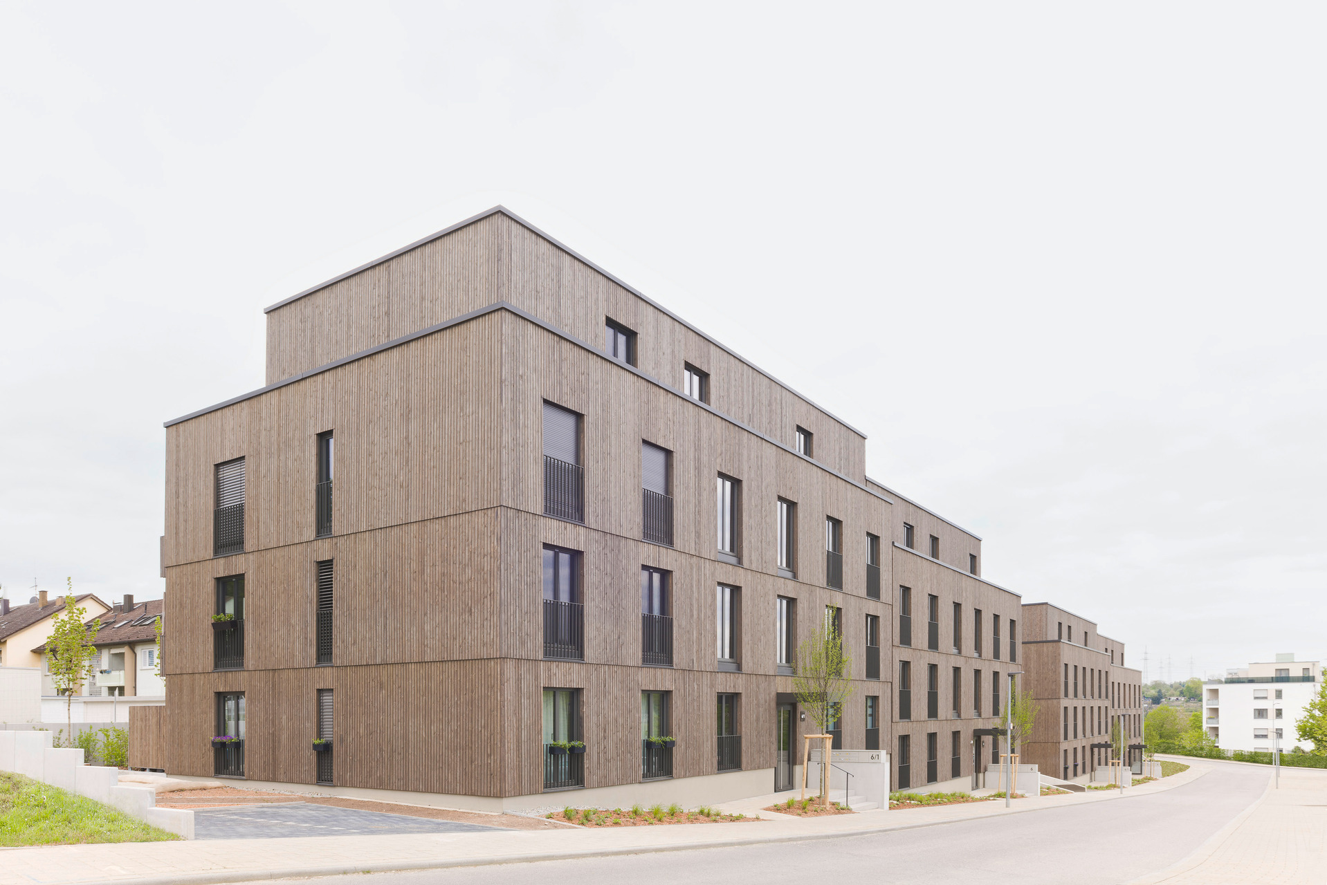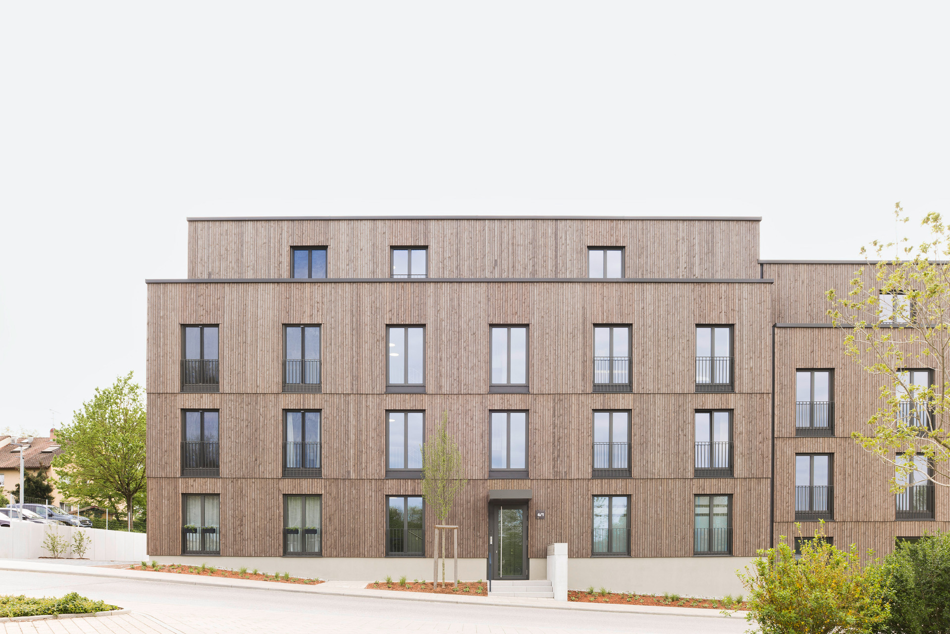 Ausgeführt sind die vier Baukörper in nahezu CO2-neutraler Holzständerbauweise mit Brettsperrholzdecken. Die Fassadenbekleidung aus einer sich geschossweise überlappenden, vertikalen Holzschalung aus vorgegrauten Holzbrettern verdeutlicht die ökologische Haltung des Projekts. Tragwerk und Hülle basieren auf einer durchdachten, durchgängigen und klaren geometrischen Ordnung und wenigen, nachvollziehbar eingesetzten Materialien. So ließen sich die hohen Anforderungen hinsichtlich Wirtschaftlichkeit, Brand- und Schallschutz einhalten und eine hohe Aufenthalts- und Wohnqualität herstellen.