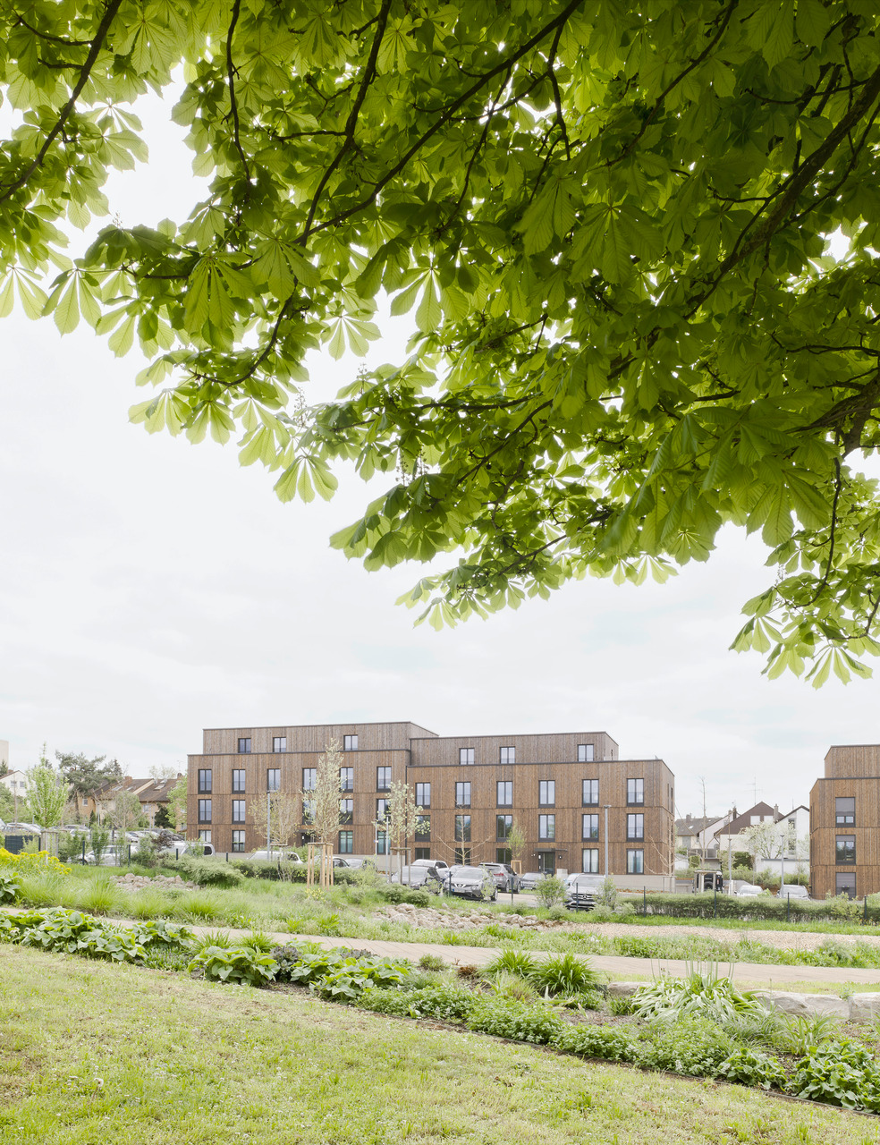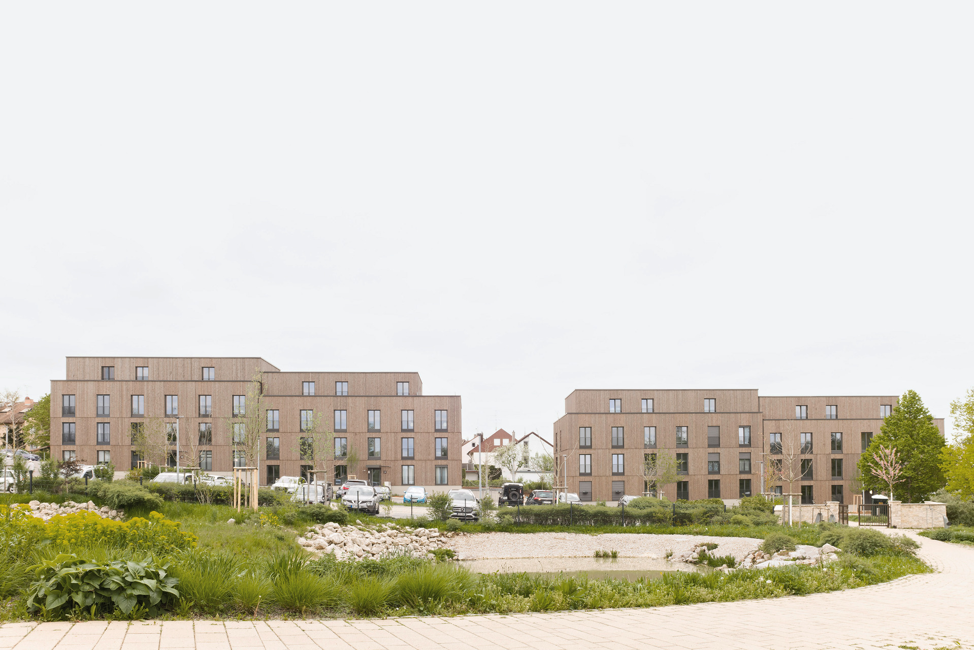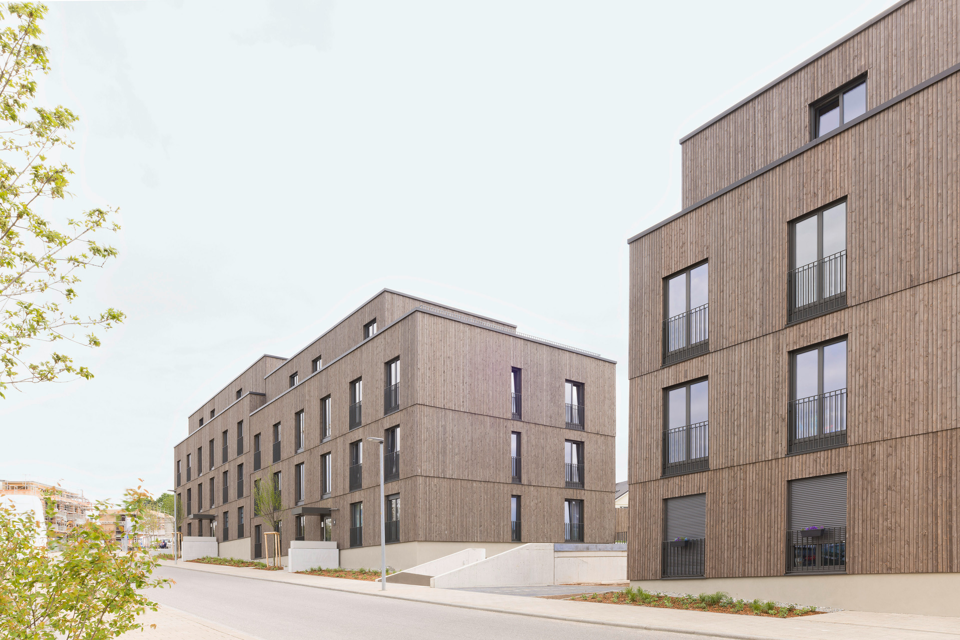 Den Auftakt zum Wohngebiet bilden die vier viergeschossigen, in Holzständerbauweise errichteten Mehrfamilienhäuser, die mit 37 zukunftsfähig, flexibel und nachhaltig gedachten Wohnungen dringend benötigten, kostengünstigen Raum zum Leben bieten.