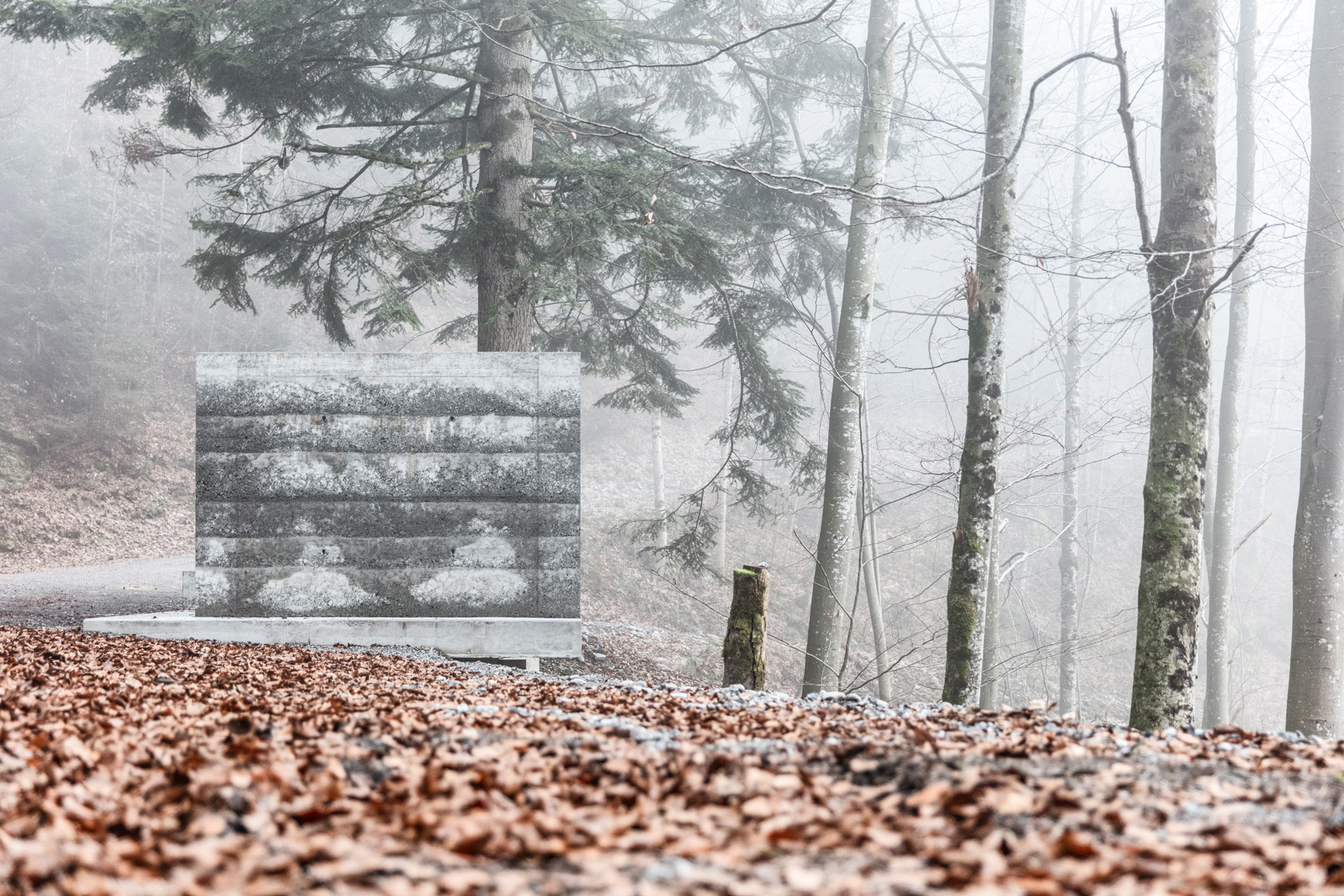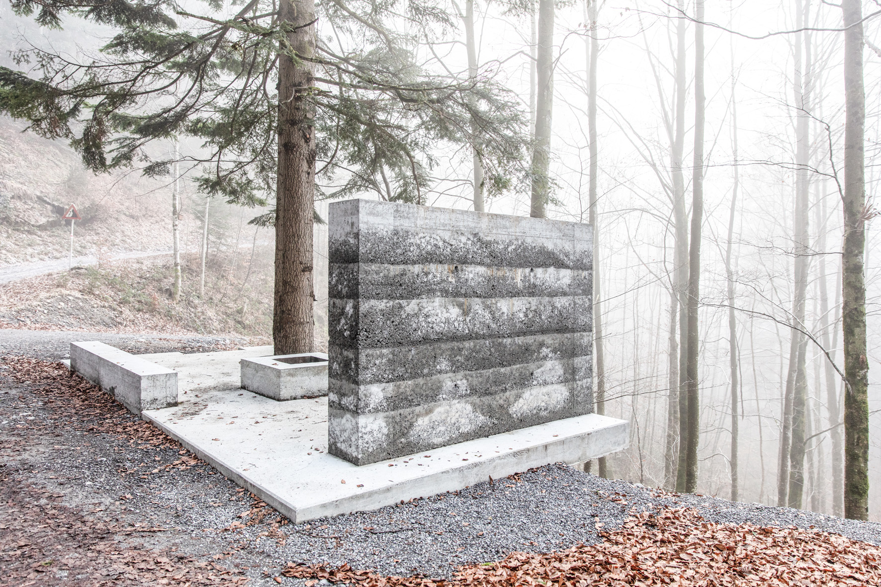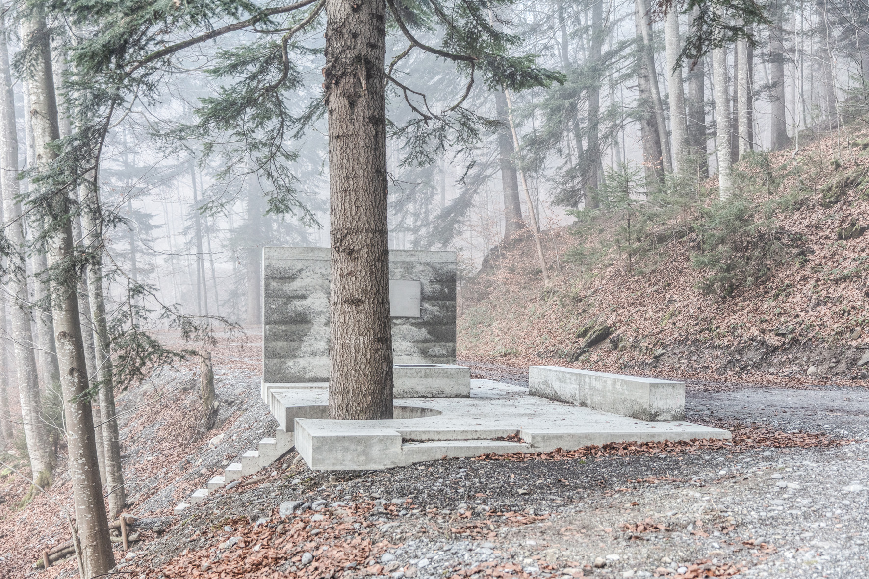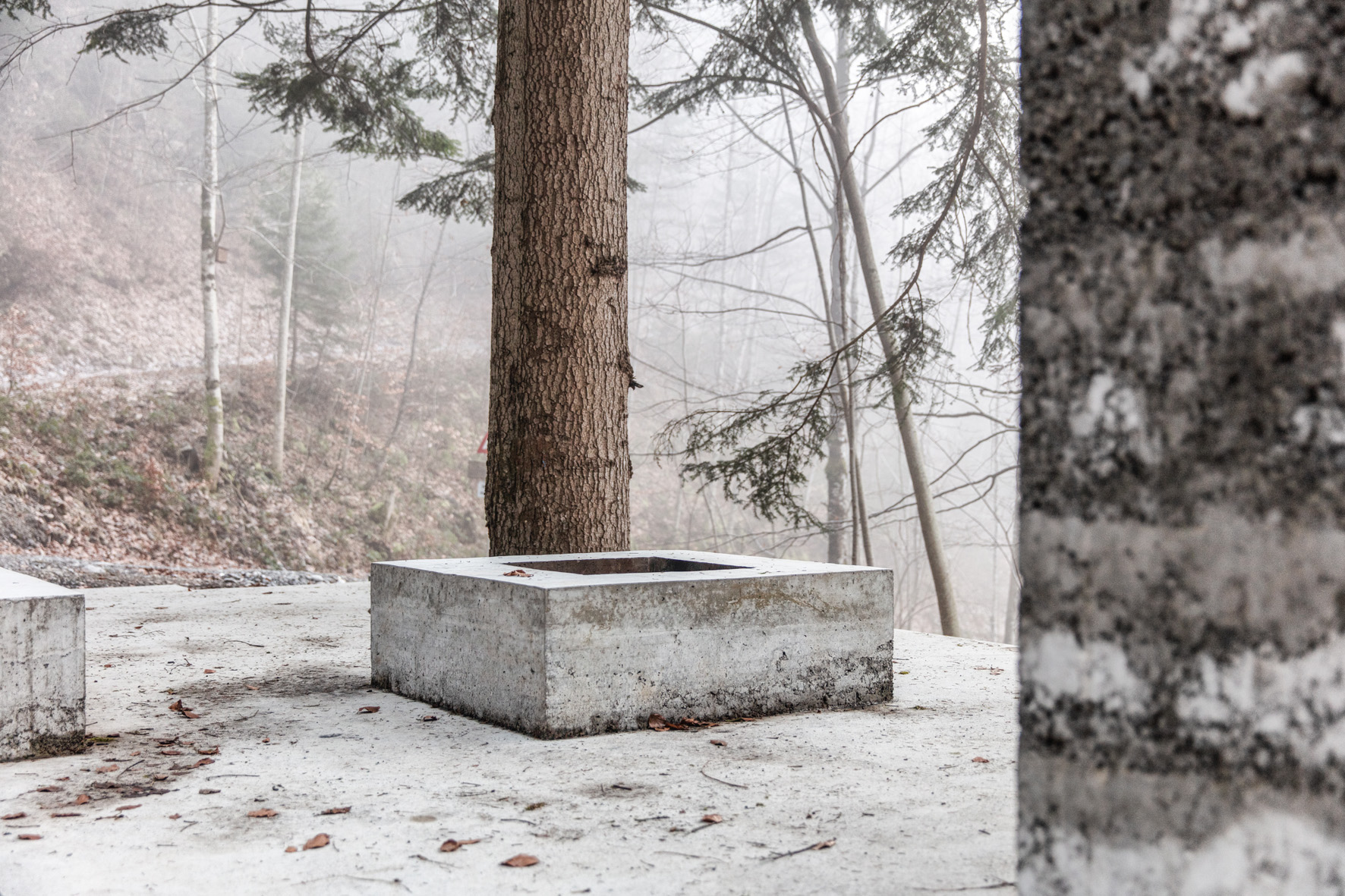 Zwei harte, nahezu unverwüstliche Materialien – Beton und Chromstahl – speichern im abstrahierten Raumansatz die zu verblassen drohende Erinnerung an schneereiche Winter, harten körperlichen Einsatz von Tier und Mensch, Entbehrung und Einfachheit des Lebens. Die Komposition der räumlichen Figur umschreibt eine scheinbar in die Luft gezeichnete Vorstellung der ehemaligen Winterherberge. Analog zu den imaginierten, durch Kälte gestockten Bewegungen fügen sich Fragmente zu einem neuen Ganzen: von der Wandscheibe aus haptischem Stampfbeton und der trogartigen Feuerstelle über die Bodenplatte mit Aussparungen bis zu einem Teil der umlaufenden Sitzbank. Einer der Einschnitte umfasst eine Tanne und integriert sie ins Ensemble. Der Tiefwurzler schraubt das Objekt symbolisch in den Waldboden, er verankert den räumlichen Winkel gewissermaßen mit dem Masellarücken. Der andere Ausschnitt reagiert auf einen schmalen, steilen Waldweg und erleichtert den Einstieg über eine entsprechend kleine Treppe.
