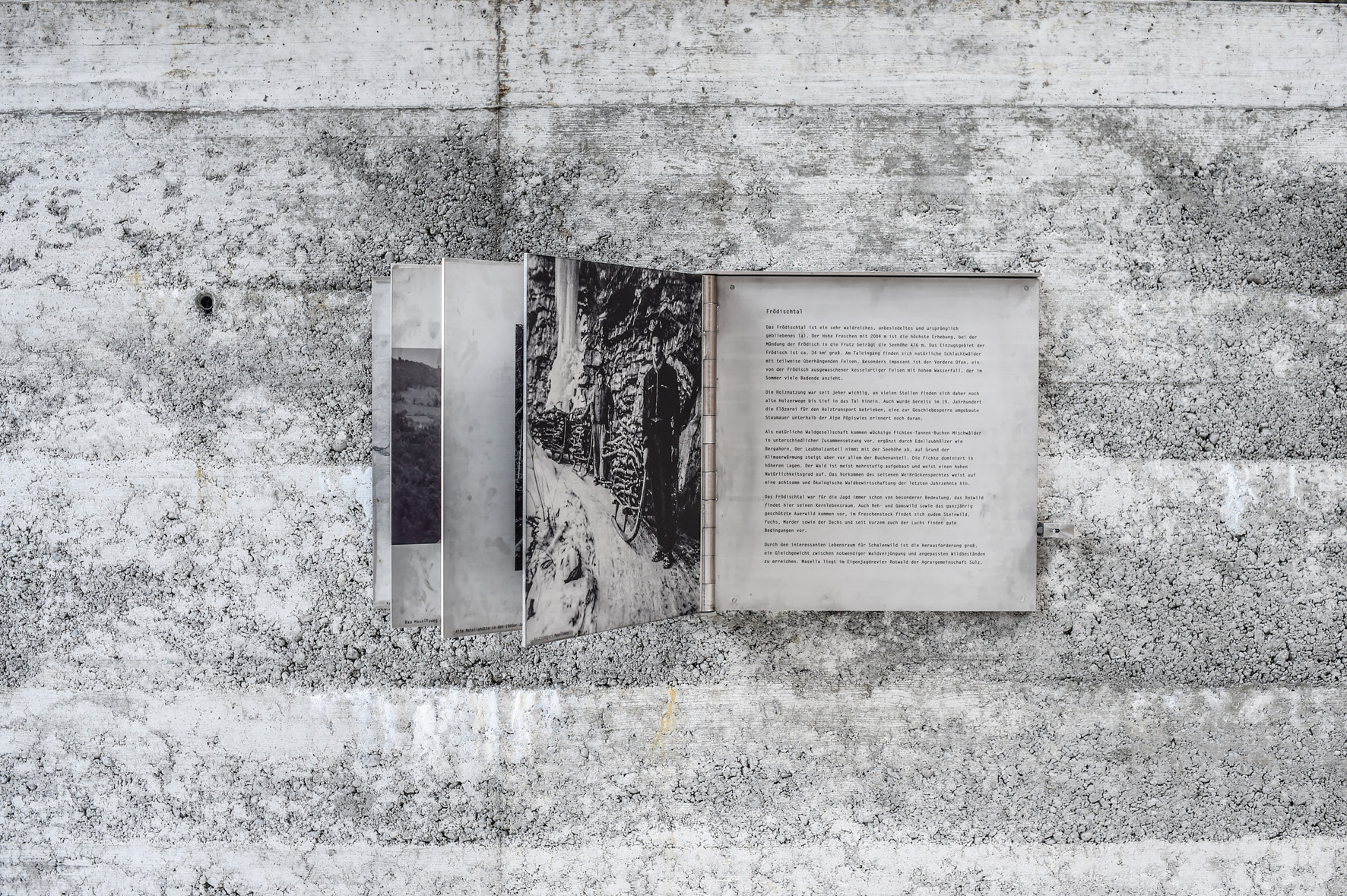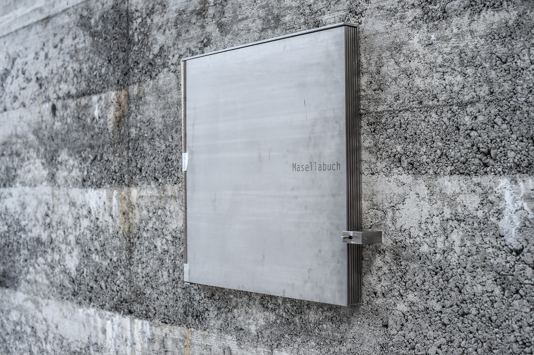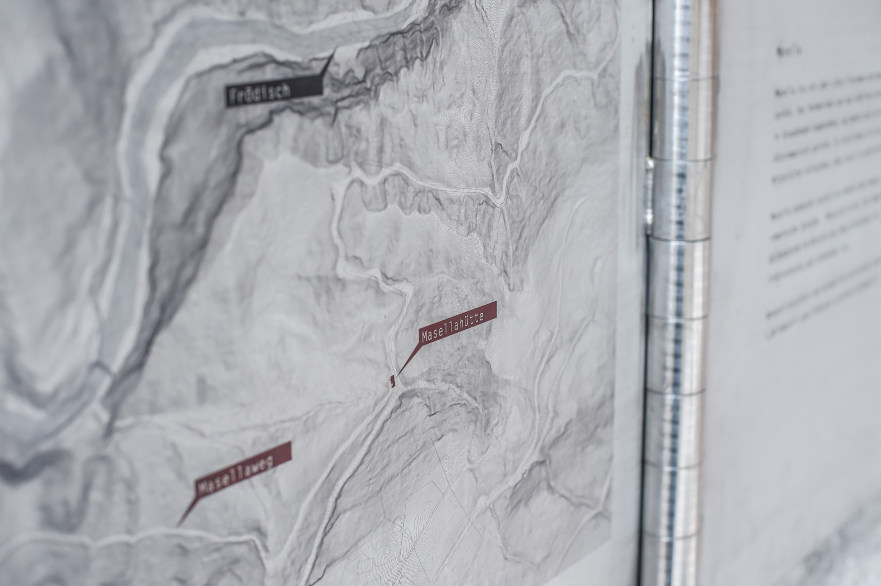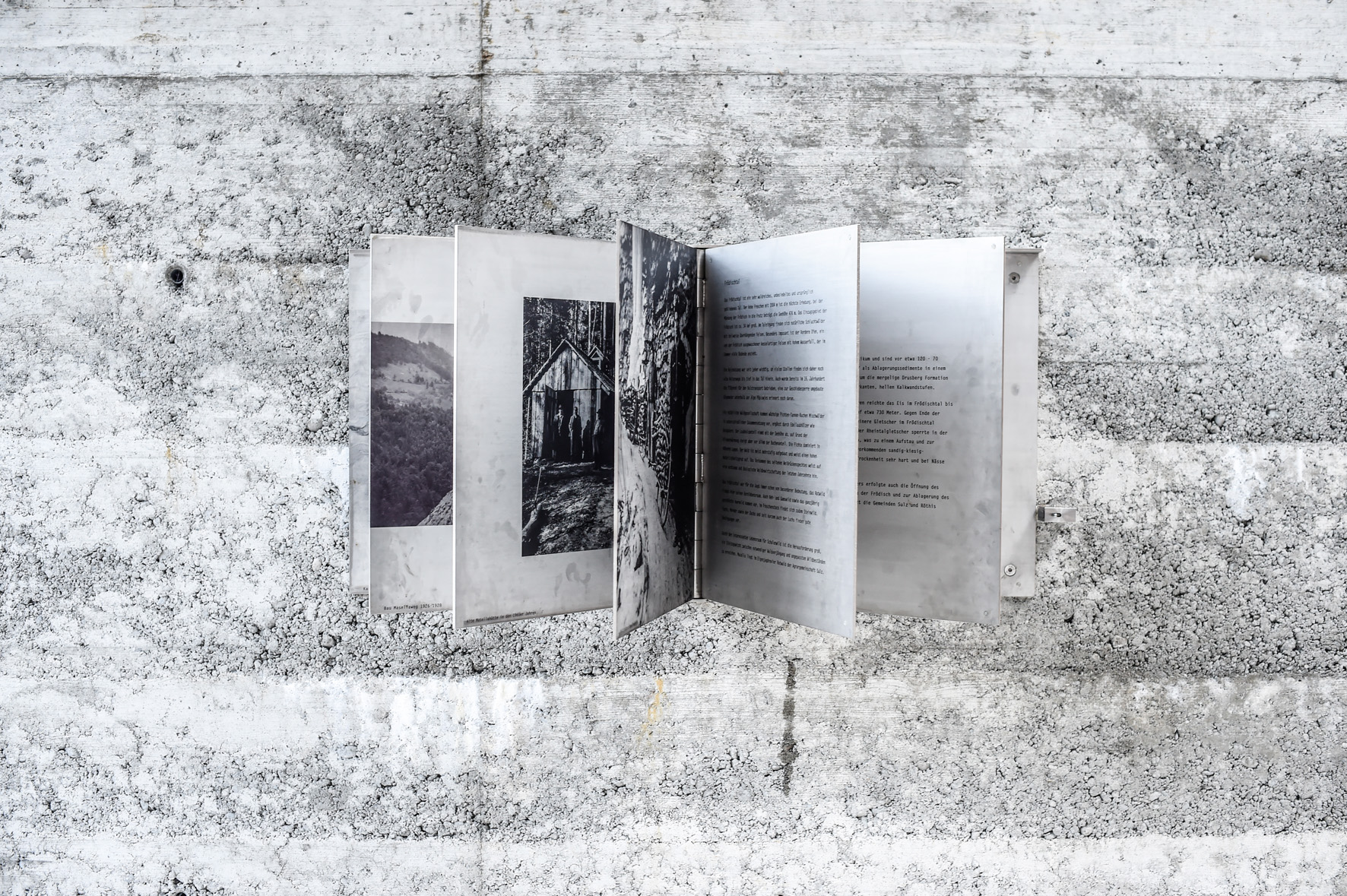 Was es sonst noch auf sich hat mit dem Ort und der Masellahütte erfahren die Wanderer im kunstvoll gefertigten Masellabuch – Erläuterungstexte und Fotos sind auf dicke Chromstahlplatten graviert, Ausführung und Detaillierung verleiten zur umsichtigen Handhabung. Die Fotografien illustrieren die damaligen Arbeitsumstände, zeigen Kleider und Leute zu Zeiten prekärer Lebensumstände. Ohne Romantisierung, jedoch in wertschätzendem Ton und mit großem Gespür für die Abstraktion von Form und Inhalt, erzählt der neu definierte Ort seine erinnerungswürdige Geschichte. (Text: Marina Hämmerle)