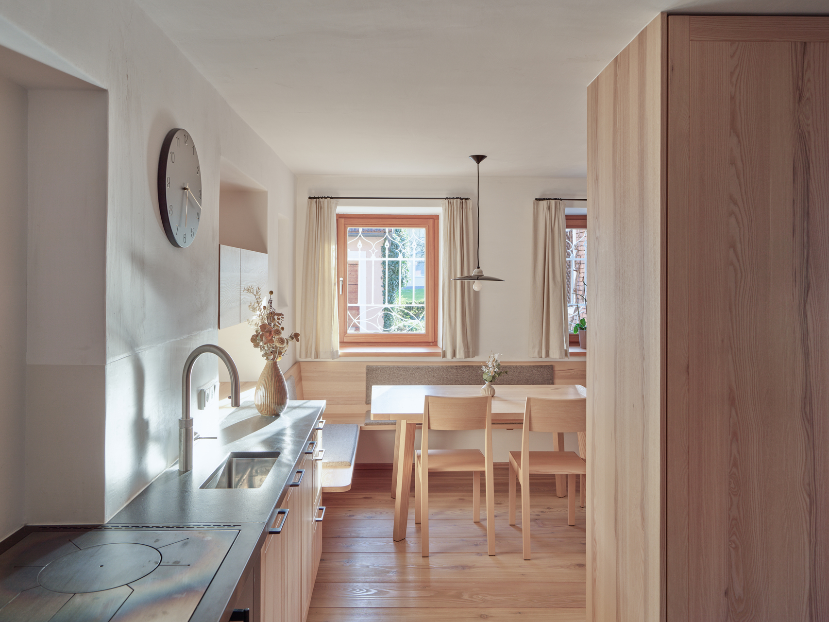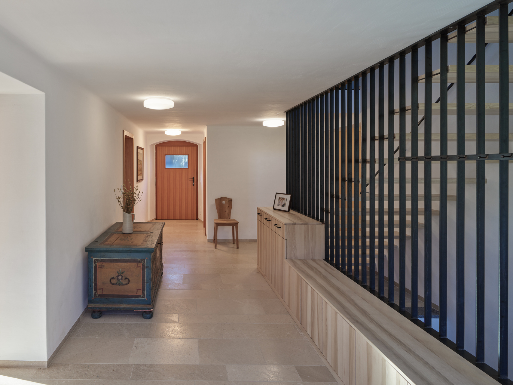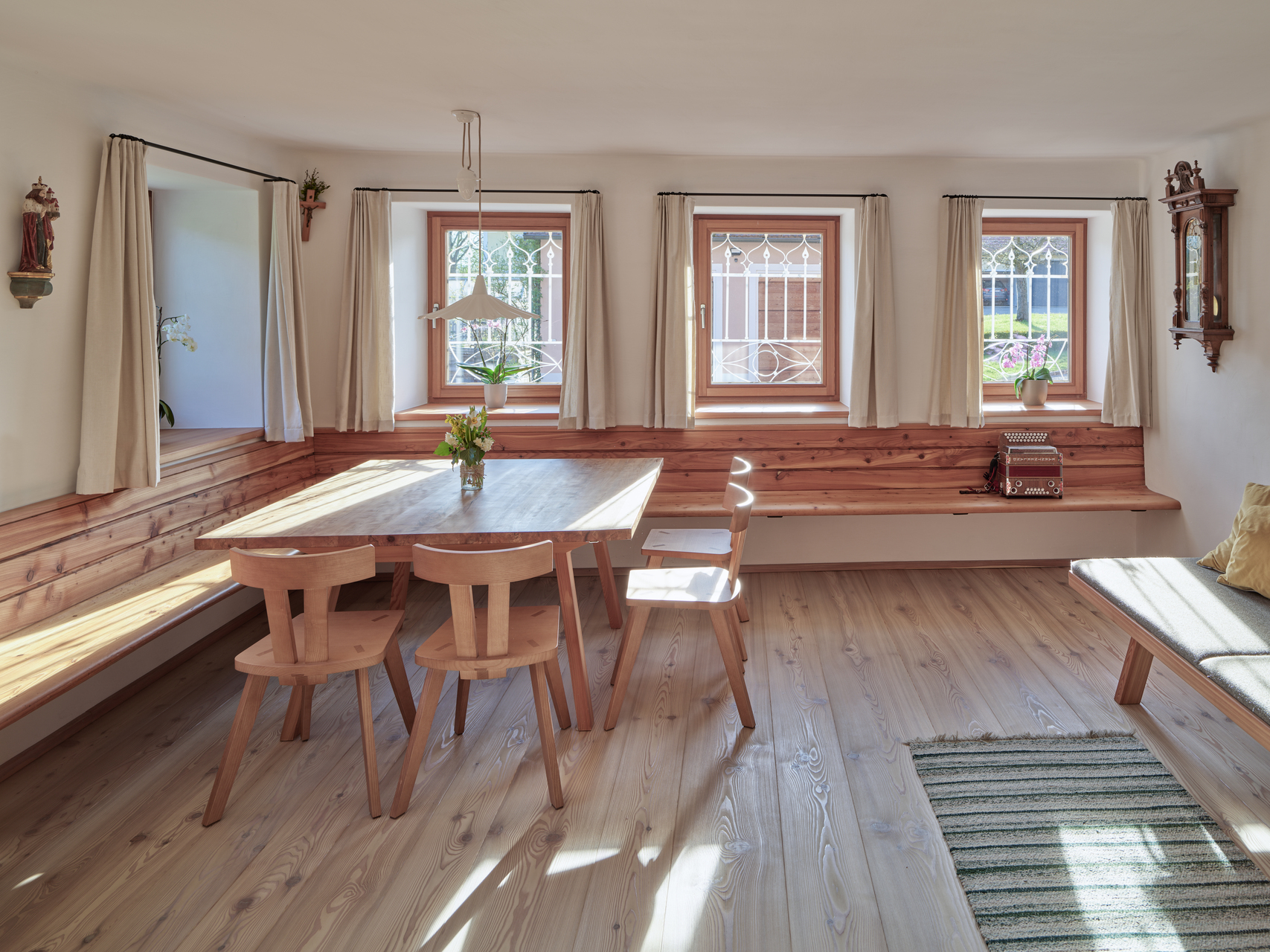Im Stüberl neben der Küche findet das Alltagsleben der Familie statt. Auch hier kamen Möbel und der Klosterdielenboden aus massiver Lärche zum Einsatz. Im Durchhaus wurde der Fliesenboden aus den 1970er-Jahren durch einen Kalksteinboden ersetzt. Die Garderobe und der Stiegenaufgang wurden neu gestaltet. In der Diele im oberen Stock kamen ebenfalls Kalk an den Wänden und breite Lärchendielen zum Einsatz. Die Türen wurden auch hier nach einem alten, in der Scheune aufgefundenen Türmuster neu gefertigt. (Text: Architekt:innen, bearbeitet)