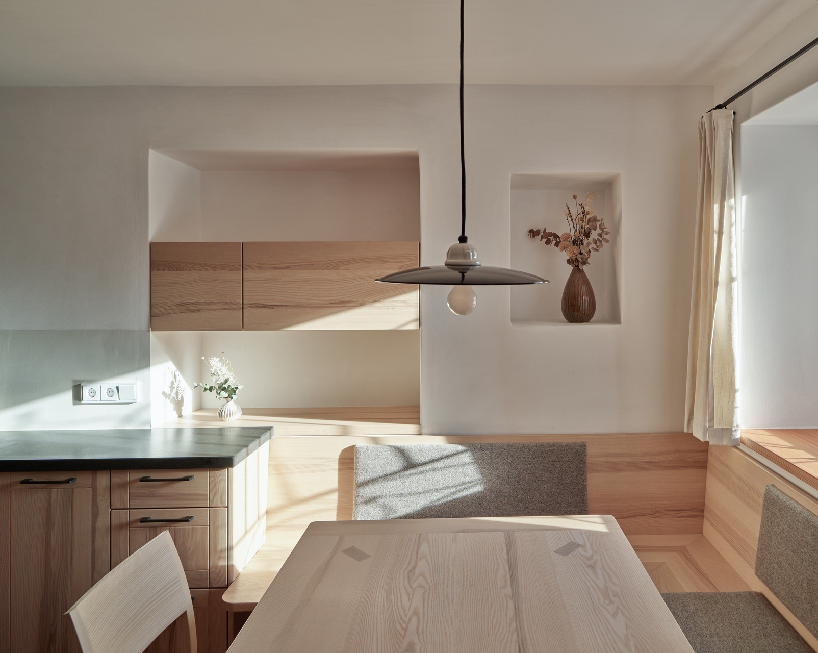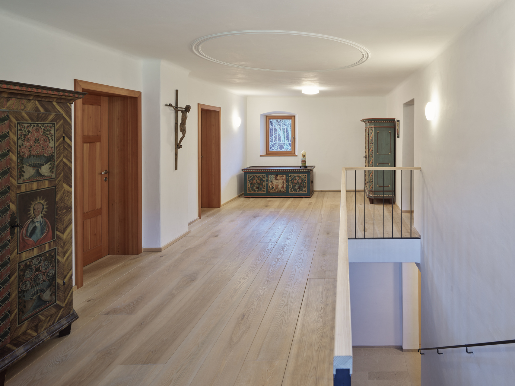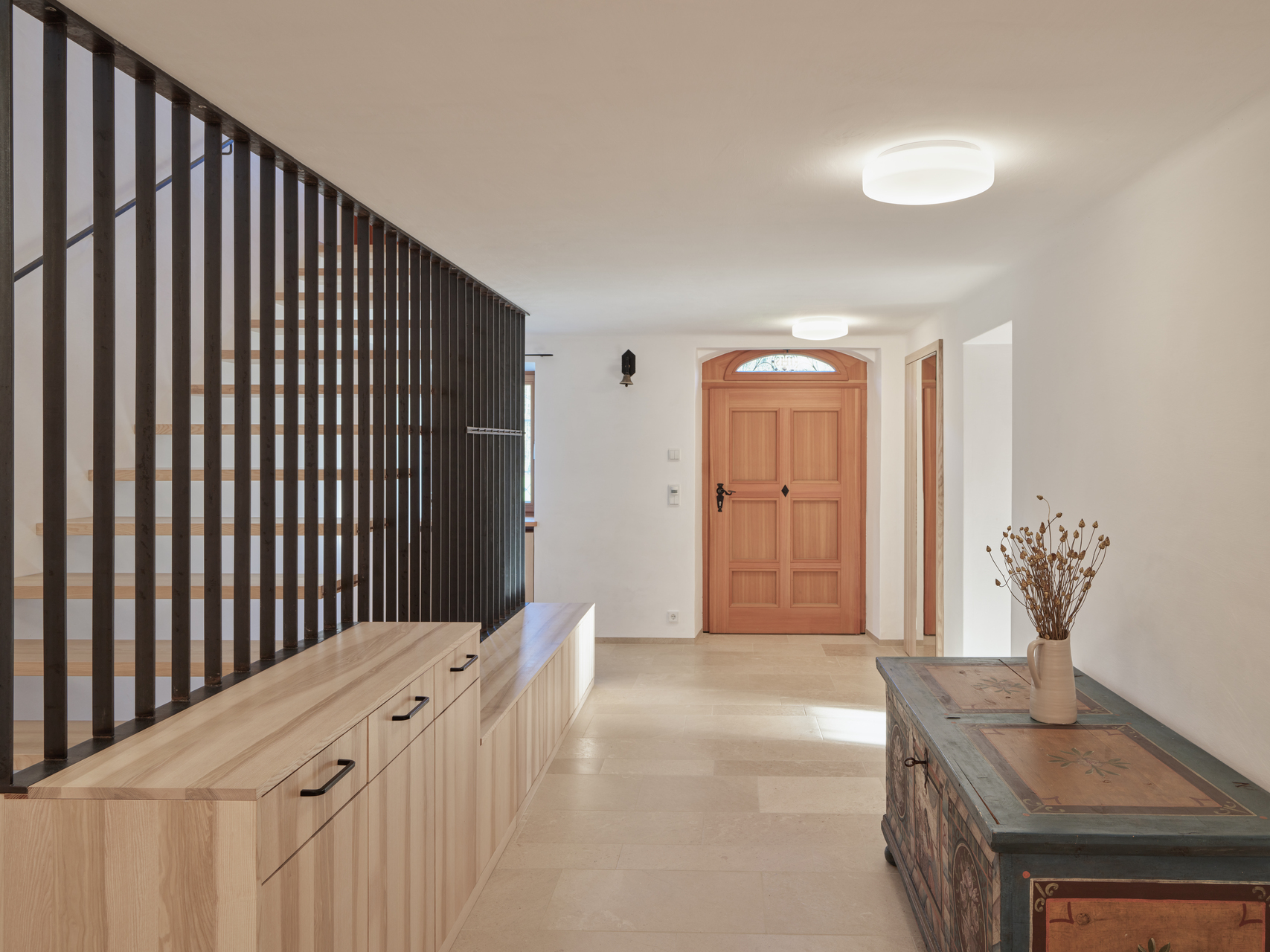 Im Stüberl neben der Küche findet das Alltagsleben der Familie statt. Auch hier kamen Möbel und der Klosterdielenboden aus massiver Lärche zum Einsatz. Im Durchhaus wurde der Fliesenboden aus den 1970er-Jahren durch einen Kalksteinboden ersetzt. Die Garderobe und der Stiegenaufgang wurden neu gestaltet. In der Diele im oberen Stock kamen ebenfalls Kalk an den Wänden und breite Lärchendielen zum Einsatz. Die Türen wurden auch hier nach einem alten, in der Scheune aufgefundenen Türmuster neu gefertigt. (Text: Architekt:innen, bearbeitet)