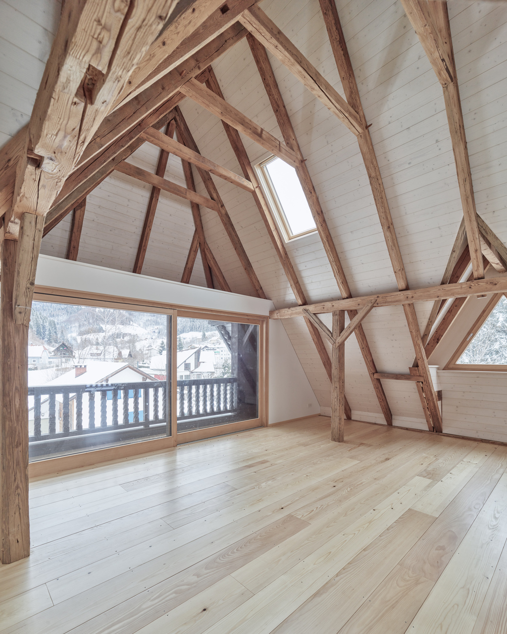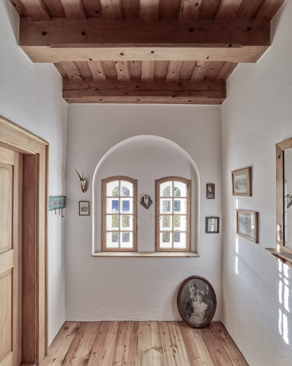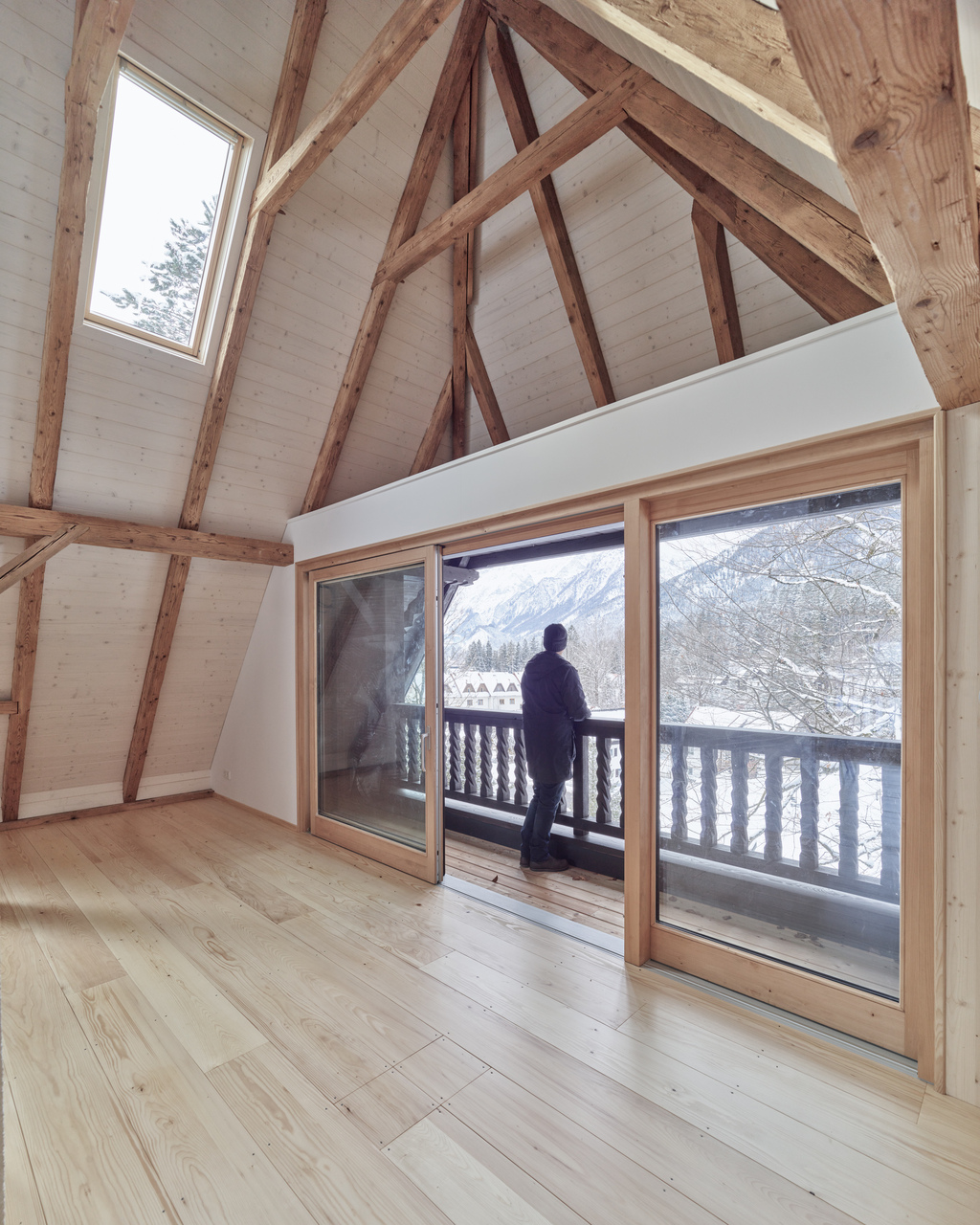 Besonderes Augenmerk galt dem Dachboden, der saniert und ausgebaut wurde und nun als Wohnzimmer und „Spielwiese“ für die Kinder genutzt wird. Zwei Loggien erweitern den neuen Raum ins Freie und öffnen das Panorama in die umliegende Bergwelt. Die alte Gaupe bekam ein neues Dreiecksfenster, die historischen Sparren wurden sandgestrahlt und, wo erforderlich, um neue Bauteile aus Altholz ergänzt. Die Gestaltung der neuen Balkonbrüstungen orientiert sich am Bestand.