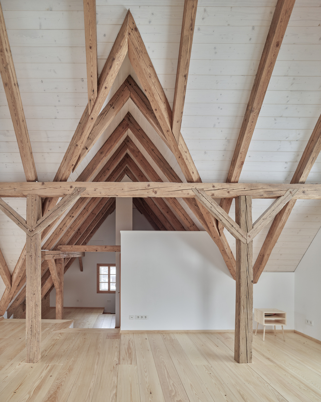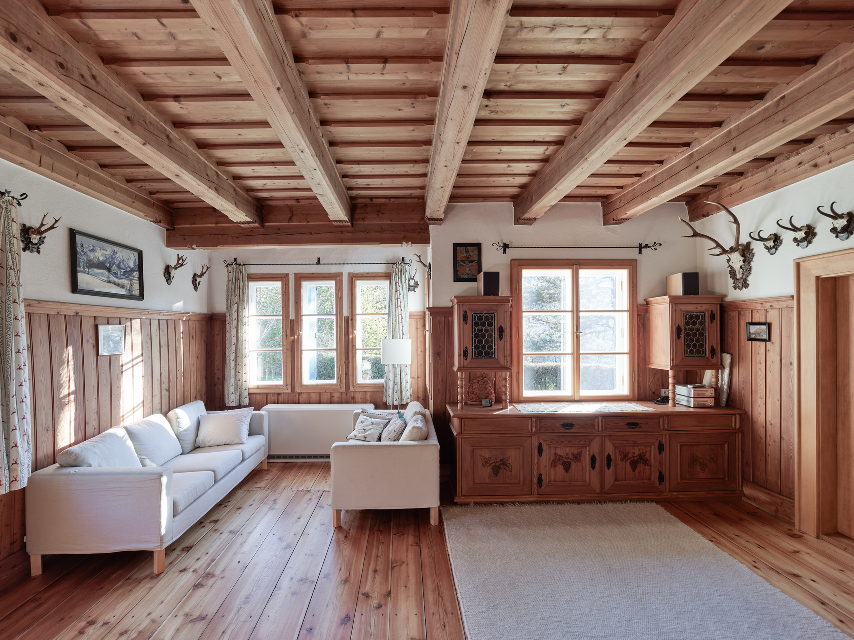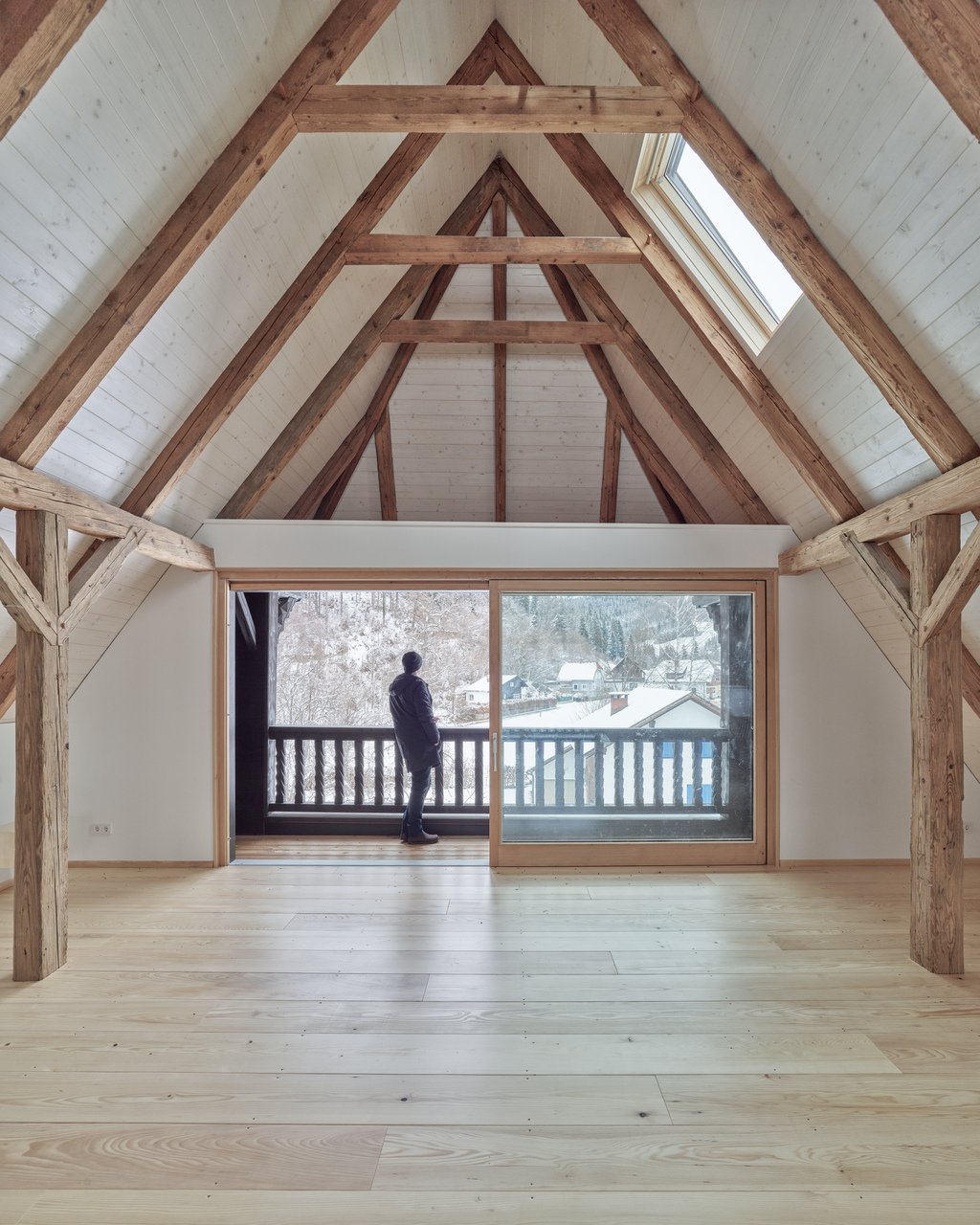 Besonderes Augenmerk galt dem Dachboden, der saniert und ausgebaut wurde und nun als Wohnzimmer und „Spielwiese“ für die Kinder genutzt wird. Zwei Loggien erweitern den neuen Raum ins Freie und öffnen das Panorama in die umliegende Bergwelt. Die alte Gaupe bekam ein neues Dreiecksfenster, die historischen Sparren wurden sandgestrahlt und, wo erforderlich, um neue Bauteile aus Altholz ergänzt. Die Gestaltung der neuen Balkonbrüstungen orientiert sich am Bestand.