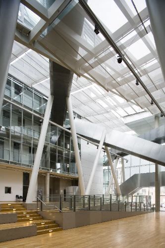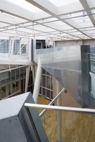 Die Eingangshalle versprüht den industriellen Charme einer Ruhrgebietszeche mit ihren charakteristischen Förderbändern. Blechtunnel durchstossen die Wände, durchziehen kreuz und quer den Lichthof des Foyers und verschwinden wieder in den gegenüberliegenden Geschossebenen. Dabei werden die kastenförmigen Stege von massiven, windschief stehenden Rundpfeilern abgestützt und versperren damit die mögliche Nutzung der Halle für Veranstaltungen. Wer dem Stiegenhaus folgt, vorbei an tief liegenden Fensterschlitzen, an Künstlerateliers und bestechenden Ausblicken auf den Akademiepark sowie die Münchner Kirchen, erreicht über dem Glasdach des Lichthofs die Panorama-Terrasse mit den Gästeappartements. Ein Steg führt hinab auf einen metallenen Gitterboden, inmitten einer chaotischen Dachlandschaft.
