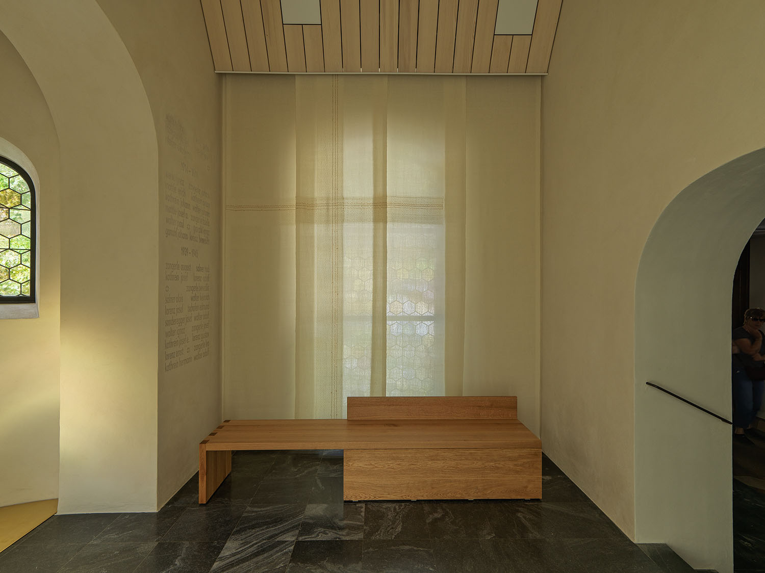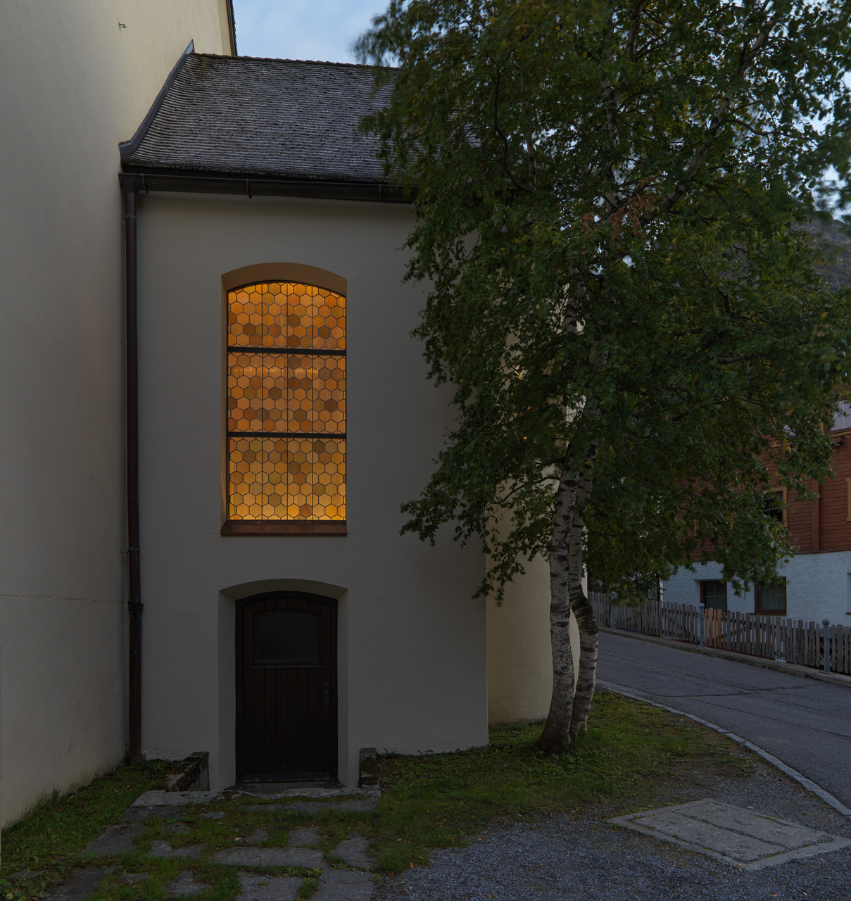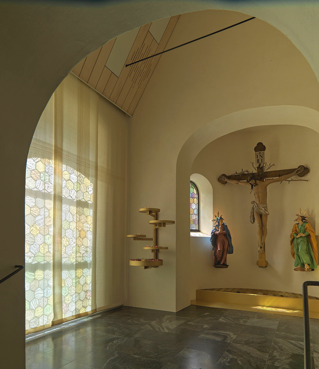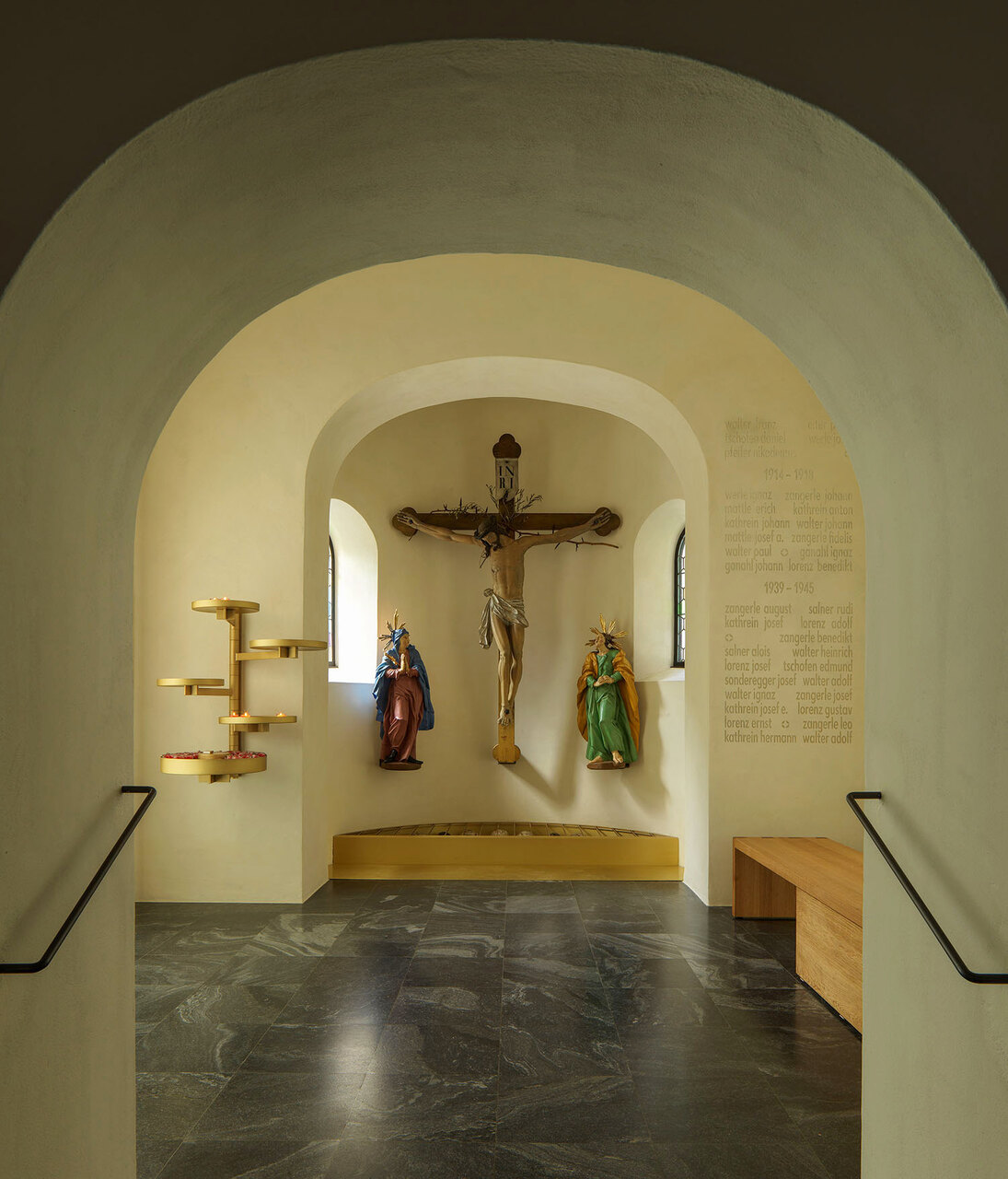 Für die in der Kapelle aufbewahrten, im Alpenraum einzigartigen bemalten und beschrifteten Totenschädel wurde unter der das Kapelleninnere dominierenden Kreuzigungsgruppe eine Messingschale in die Apsis gefügt. Ebenfalls aus Messing ist der neue mehrstufige Votivkerzenständer. Zum Gedenken an die Gefallenen der Weltkriege wurden deren Namen in Sgrafitto-Technik an einer Wand angebracht und so mit der Kapelle verschmolzen. Die Schrift verblasst bewusst nach oben hin, was als Metapher für den Aufstieg in den Himmel gelesen werden kann. (Text: Claudia Wedekind, nach einem Text der Architekt:innen)