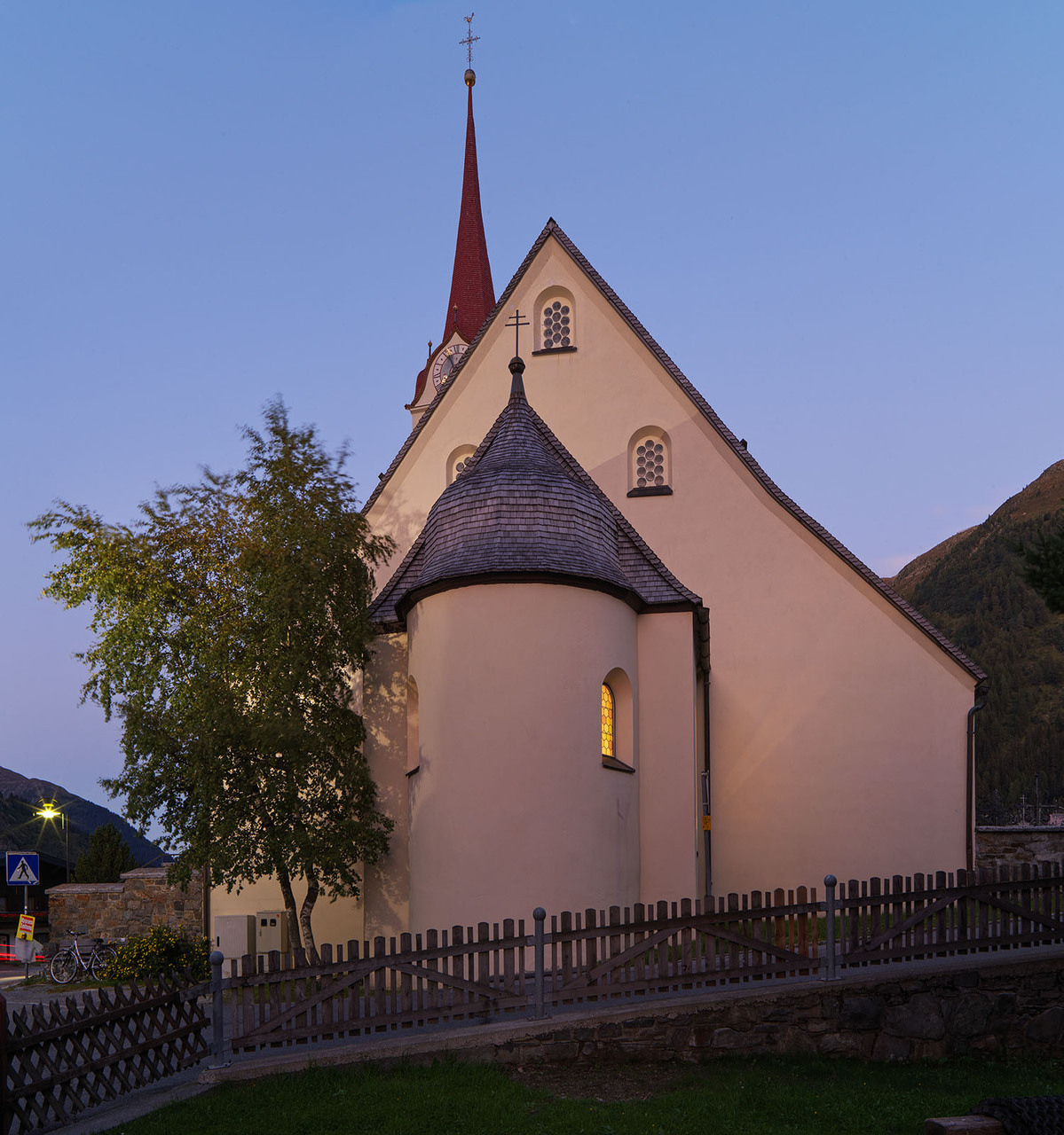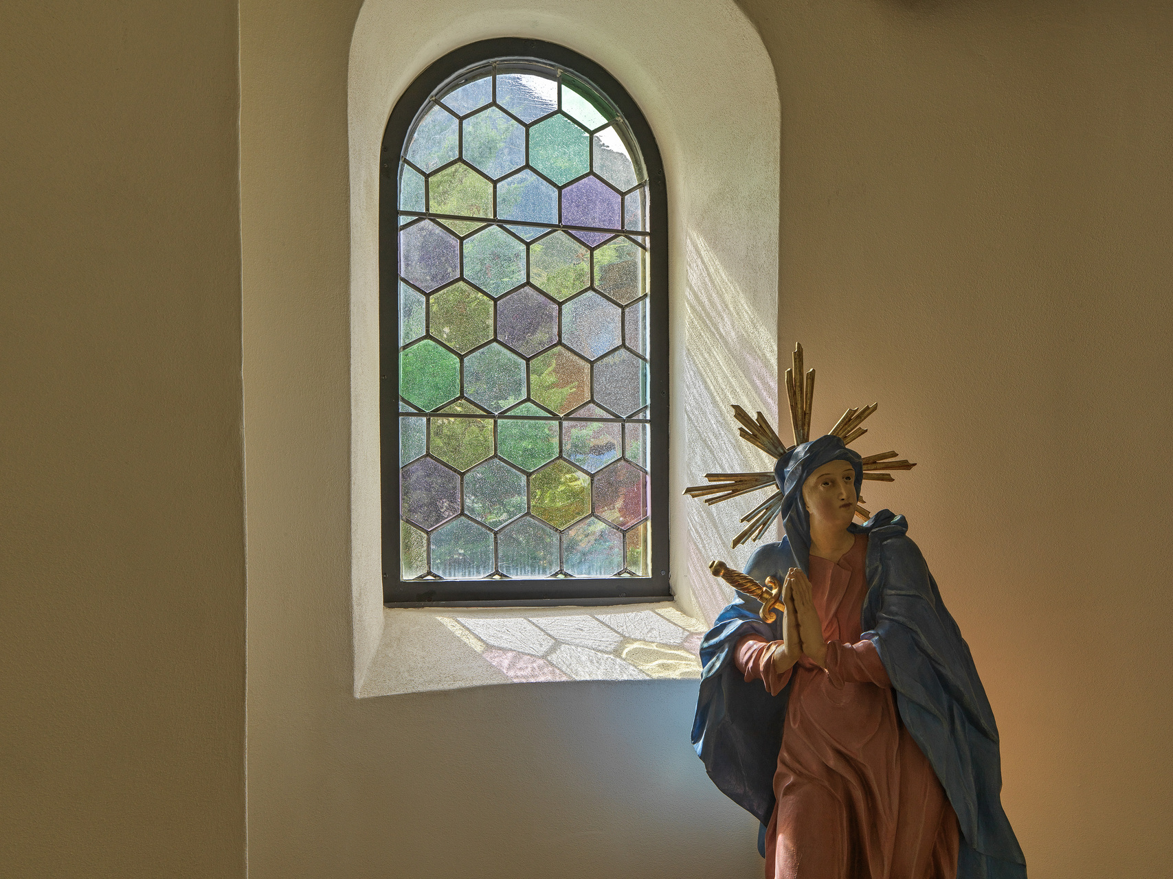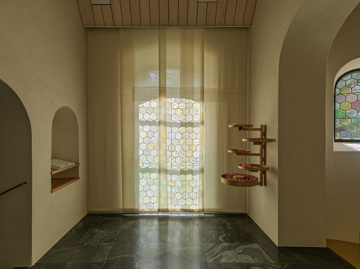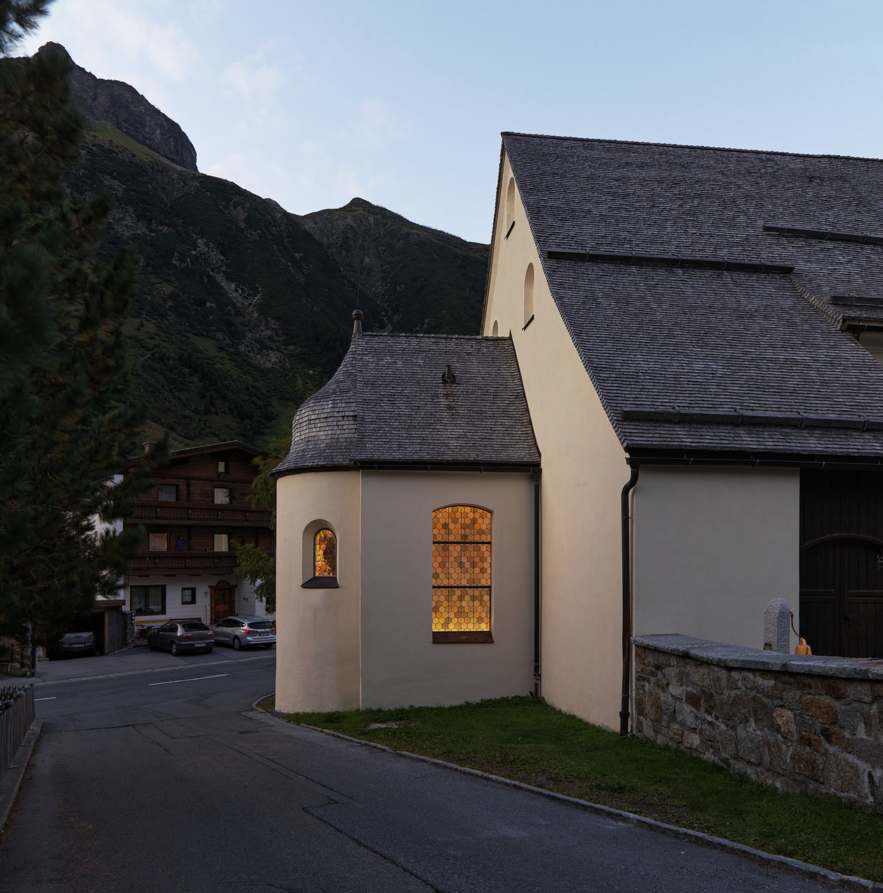 Für die in der Kapelle aufbewahrten, im Alpenraum einzigartigen bemalten und beschrifteten Totenschädel wurde unter der das Kapelleninnere dominierenden Kreuzigungsgruppe eine Messingschale in die Apsis gefügt. Ebenfalls aus Messing ist der neue mehrstufige Votivkerzenständer. Zum Gedenken an die Gefallenen der Weltkriege wurden deren Namen in Sgrafitto-Technik an einer Wand angebracht und so mit der Kapelle verschmolzen. Die Schrift verblasst bewusst nach oben hin, was als Metapher für den Aufstieg in den Himmel gelesen werden kann. (Text: Claudia Wedekind, nach einem Text der Architekt:innen)