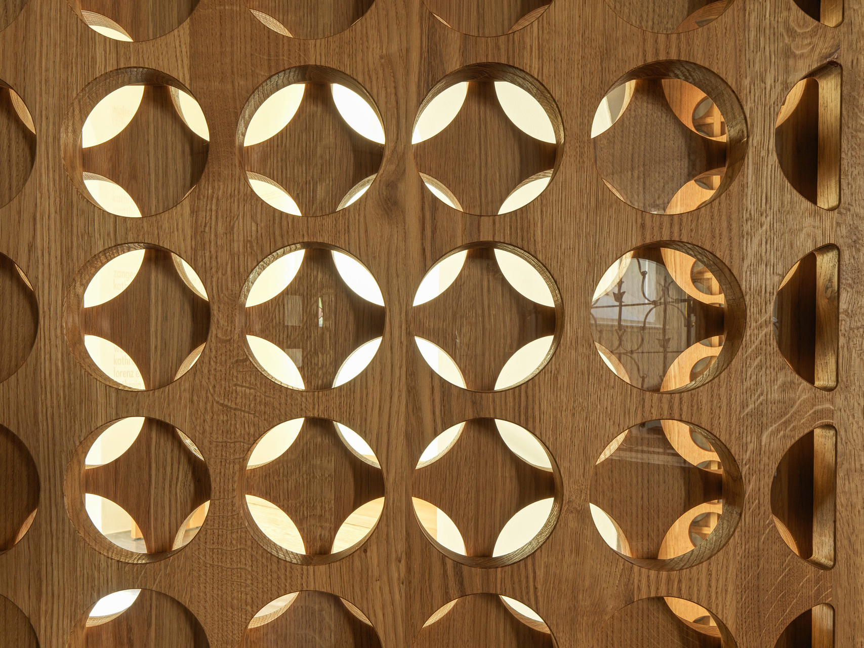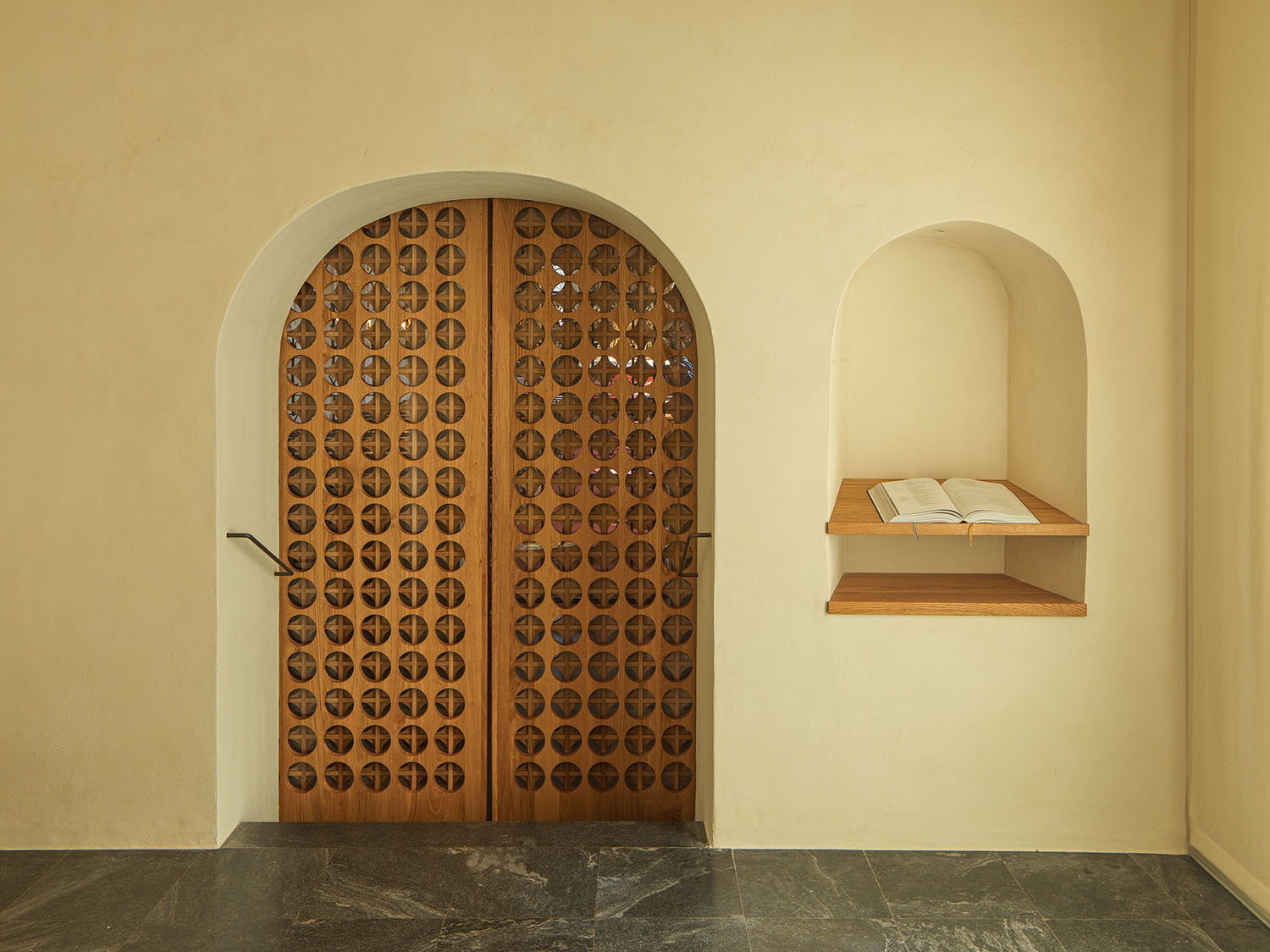 Um die vorhandene Kapelle mit ihren knapp 12 m² räumlich zu vergrößern wurde die Zwischendecke entfernt und der Dachstuhl in den Raum miteinbezogen. Die Oberlichten wurden auf ihre ursprüngliche Größe zurückgeführt und neu verglast. Rohweiße, wollene Vorhänge mit eingewebten Goldfäden unterstreichen die gewünschte Atmosphäre einer Stube, eine Eichenbank lädt zum Gebet und zum Abschiednehmen ein. Als Abtrennung der schlichten Kapelle von der barocken Opulenz der Pfarrkirche fungiert eine mehrschichtige Holzgittertür mit sich überlagernder Ornamentik.
