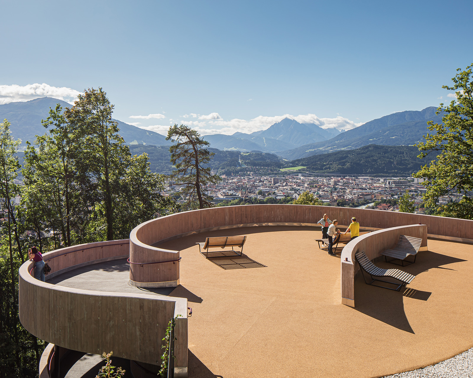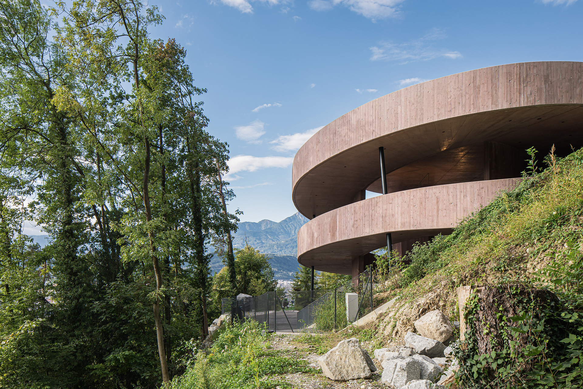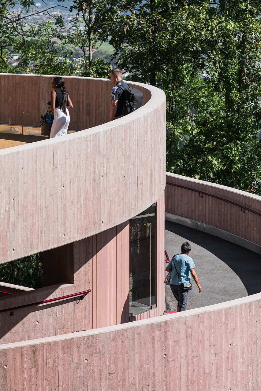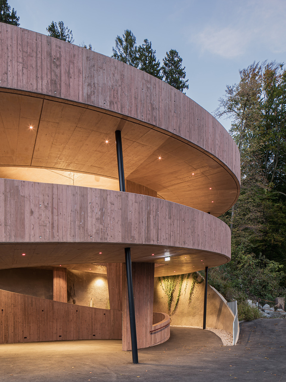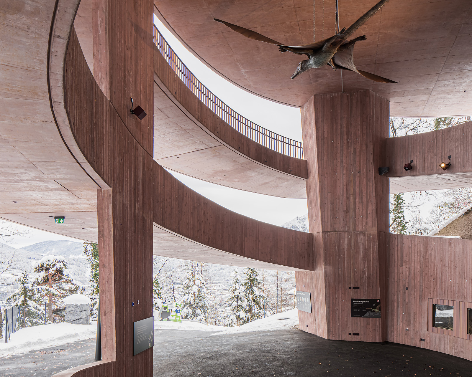 Rund um einen zentralen Raum schraubt sich eine Rampe spiralförmig bis hinauf zur Aussichtsterrasse und ermöglicht den Besucher:innen Ein- und Ausblicke in die umliegenden Tiergehege. Die technisch notwendige Hangsicherung wurde bewusst sichtbar belassen, ihre Spritzbetonoberfläche bildet einen reizvollen haptischen Kontrast zum rötlich eingefärbten, durch die Bretterschalung strukturierten Sichtbeton. Auf eine Klimahülle wurde bewusst verzichtet und die Alterung der Oberflächen durch Wind, Wetter und Pflanzenbewuchs eingeplant. In dem multifunktionalen Gebäude wird außerdem auch ein Alpenflugsaurier ausgestellt und das Artenschutzprojekt für die Bayerische Kurzohrmaus angemessen präsentiert. (Text: Claudia Wedekind, nach einem Text der Architekten)