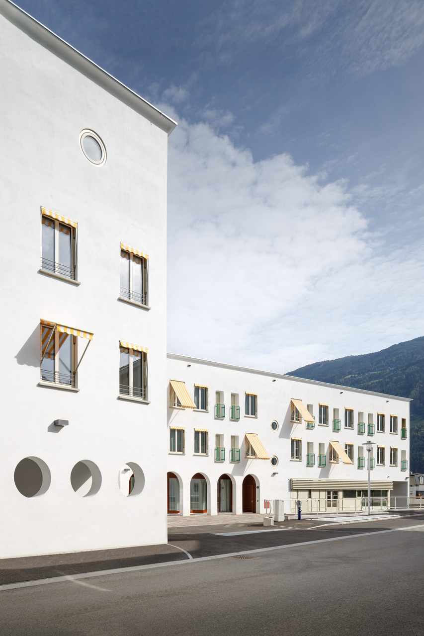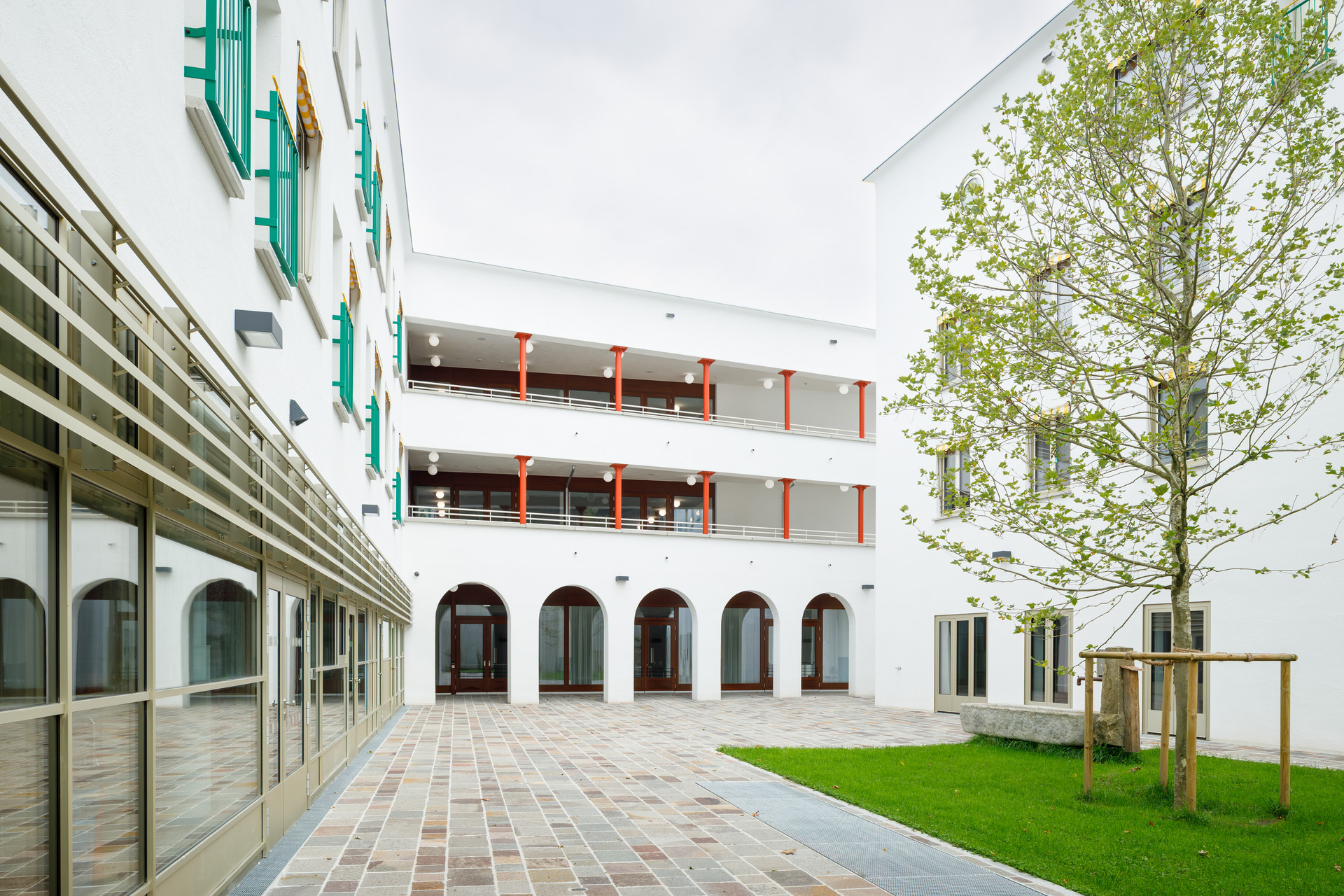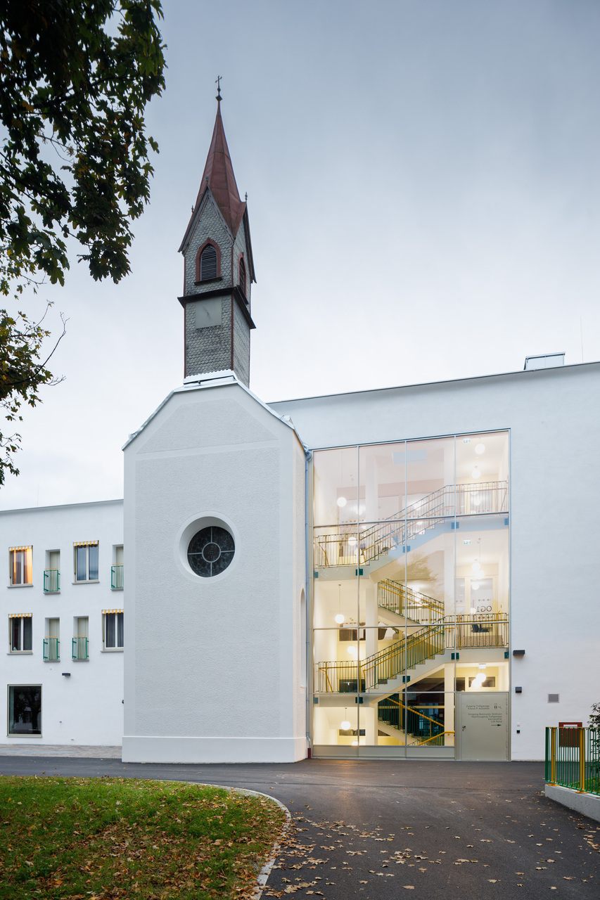 Der L-förmige Baukörper ist mit Bedacht in das dichte Gefüge des Bestandes eingewoben. Seine Setzung erlaubt die Bewahrung der neogotischen Spitalskapelle, welche der Bevölkerung seit Generationen vertraut ist und dem Ensemble als Anker dient. Auch die kleine Parkanlage, unter deren altem Baumbestand die Nachbarskinder spielen, konnte als Begegnungsort von Alt und Jung erhalten bleiben. Eine gedeckte Passage zwischen den Gebäudeflügeln bildet einen witterungsgeschützten Eingangsbereich und garantiert die Durchfahrt zu den beiden Häusern, welche hinter dem Komplex in der Spitalgasse liegen.