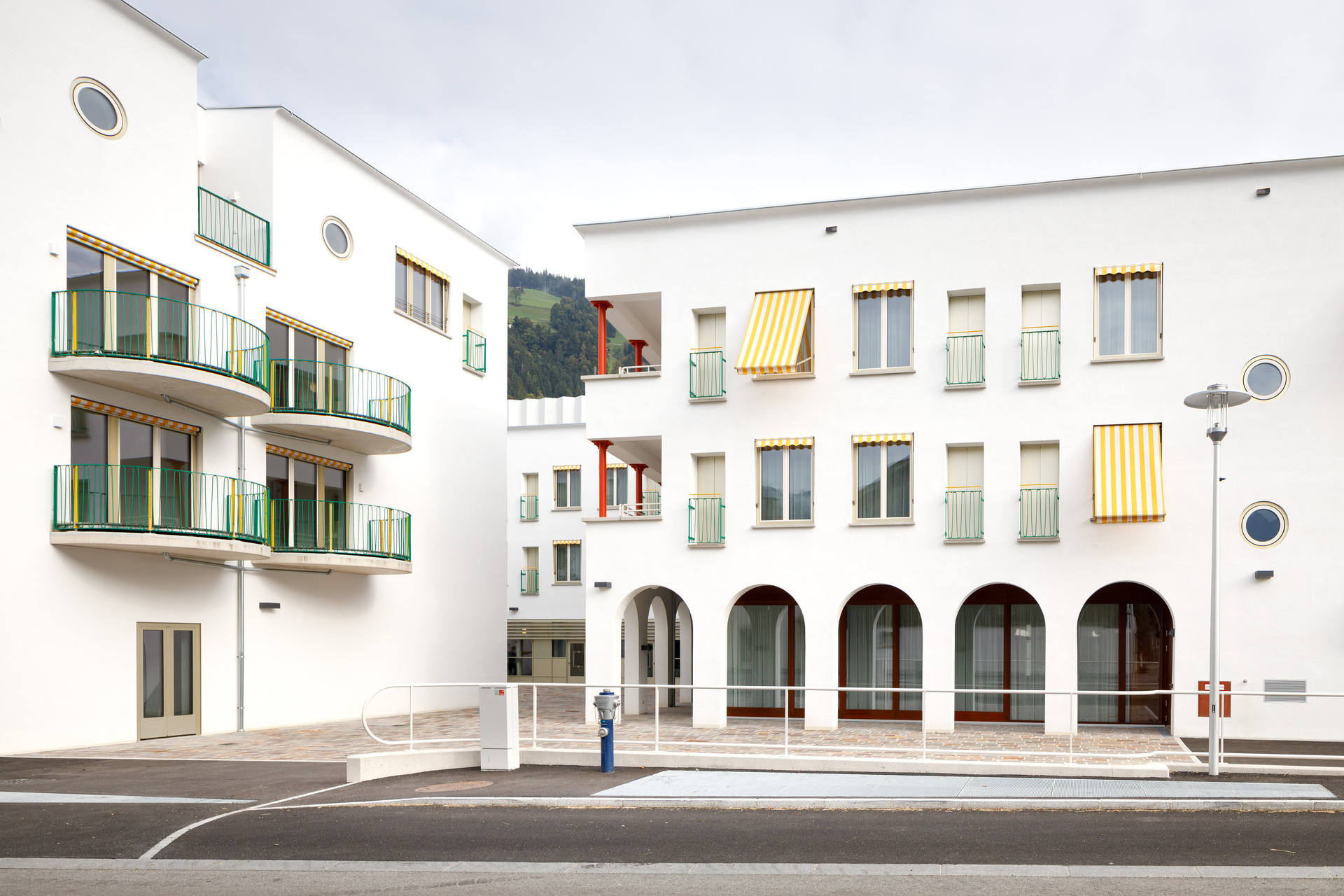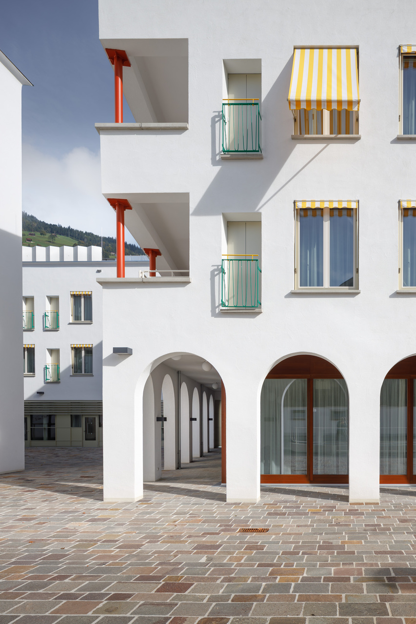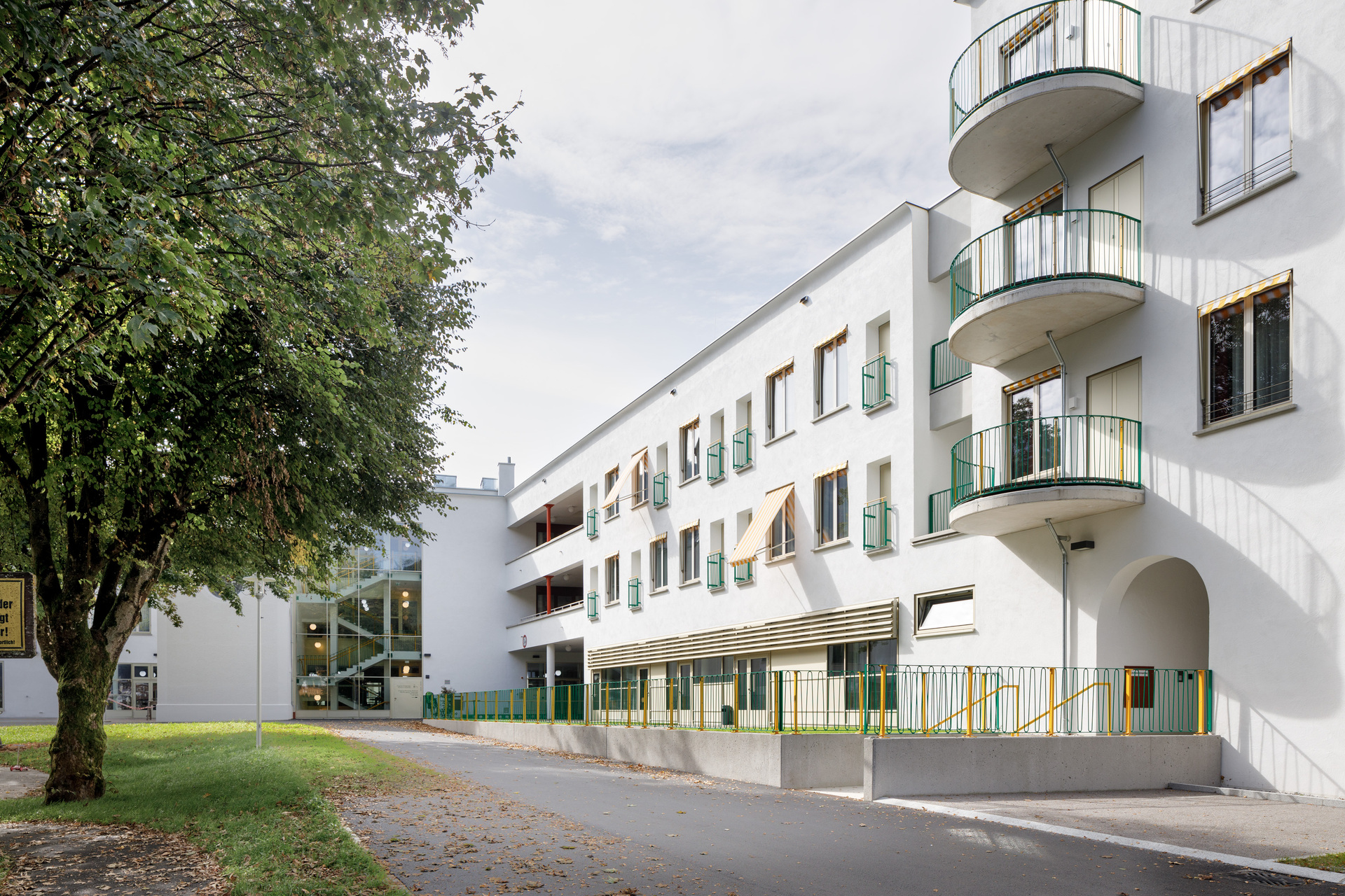 Der L-förmige Baukörper ist mit Bedacht in das dichte Gefüge des Bestandes eingewoben. Seine Setzung erlaubt die Bewahrung der neogotischen Spitalskapelle, welche der Bevölkerung seit Generationen vertraut ist und dem Ensemble als Anker dient. Auch die kleine Parkanlage, unter deren altem Baumbestand die Nachbarskinder spielen, konnte als Begegnungsort von Alt und Jung erhalten bleiben. Eine gedeckte Passage zwischen den Gebäudeflügeln bildet einen witterungsgeschützten Eingangsbereich und garantiert die Durchfahrt zu den beiden Häusern, welche hinter dem Komplex in der Spitalgasse liegen.