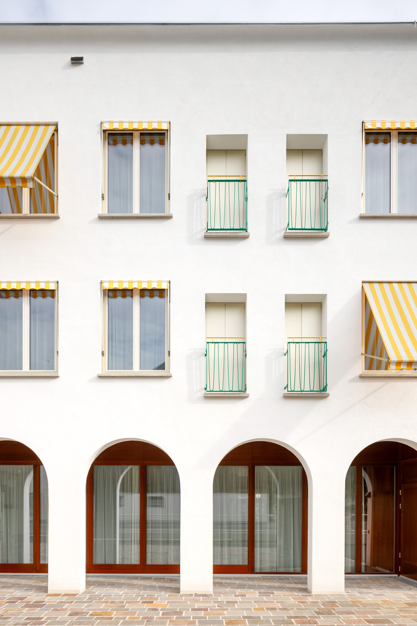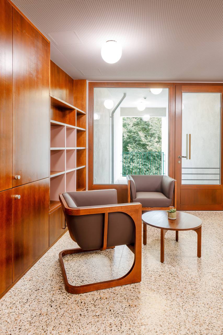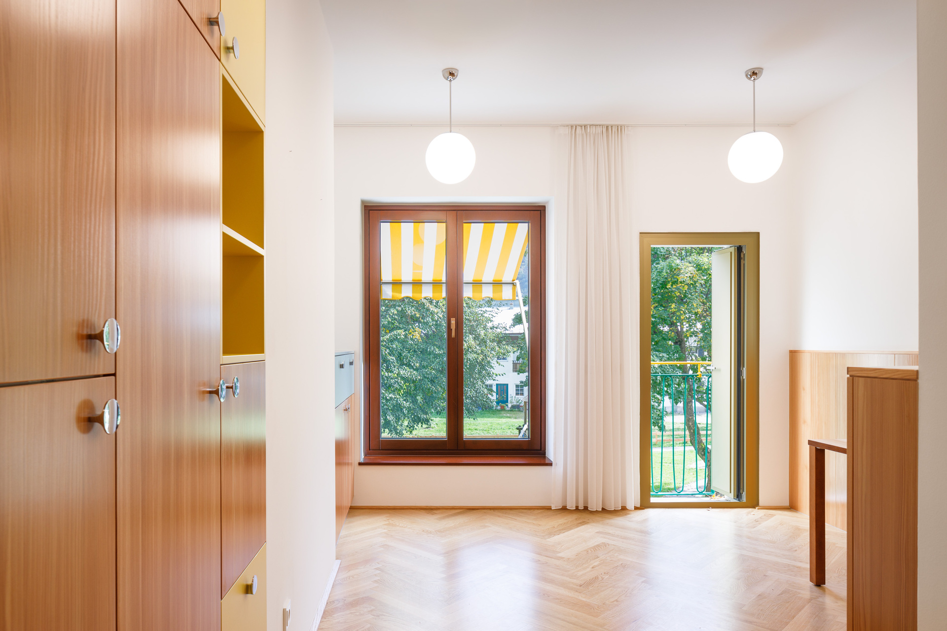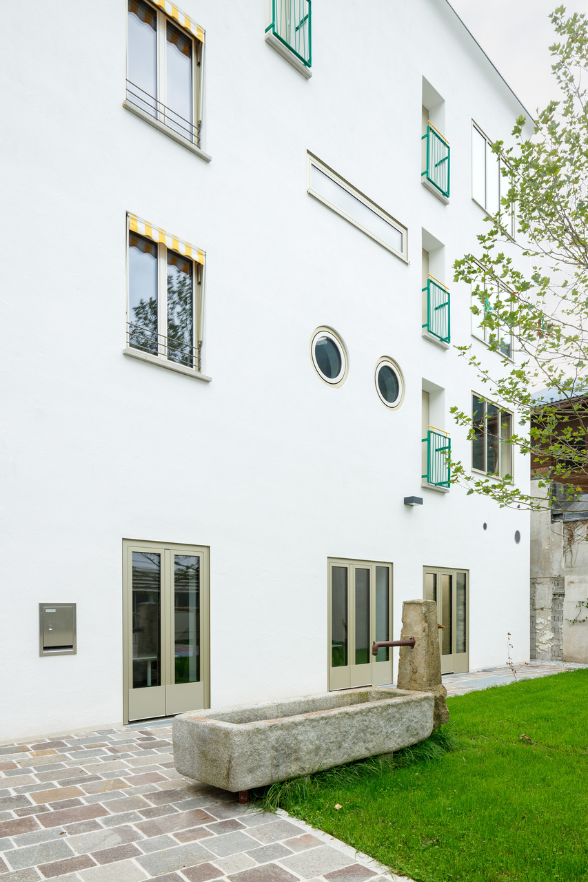 Die Materialisierung und die Ausstattung des gesamten Ensembles schaffen eine Anmutung von unbeschwerter Zeitlosigkeit und Gediegenheit. Während die Böden der öffentlich zugänglichen Bereiche mit Terrazzo Fliesen belegt sind, wurde für den großen Saal und die Zimmer ein klassischer Fischgrat Parkett gewählt. Hohlkehlen an den Decken, Fenster- und Türrahmen aus dunklem Holz sowie Lüftungsflügel in hell eloxiertem Metall bereiten ein Gefühl von Geborgenheit und Vertrautheit. Denn sorgfältig geplante Detaillösungen und durchdacht gewählte Gestaltungselemente ermöglichten es, auch mit begrenztem Budget (die Kriterien der Wohnbauförderung waren einzuhalten) eine außergewöhnlich hohe Aufenthaltsqualität zu schaffen. Es wurde grundsätzlich darauf geachtet, dass der Anteil an verbautem Kunststoff so gering wie möglich gehalten wurde. Also kein Vollwärmeschutz, keine Kunststofffenster, etc..