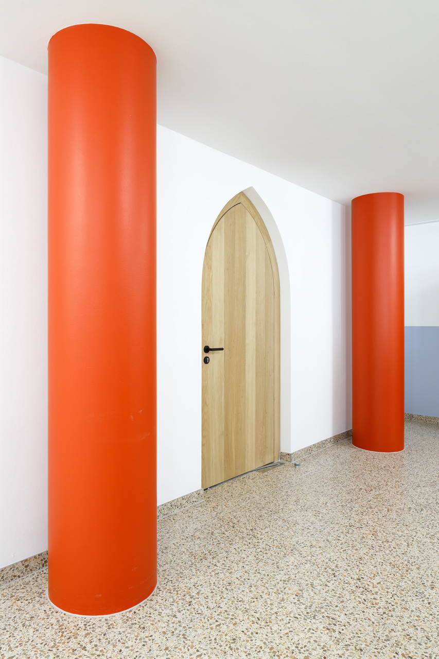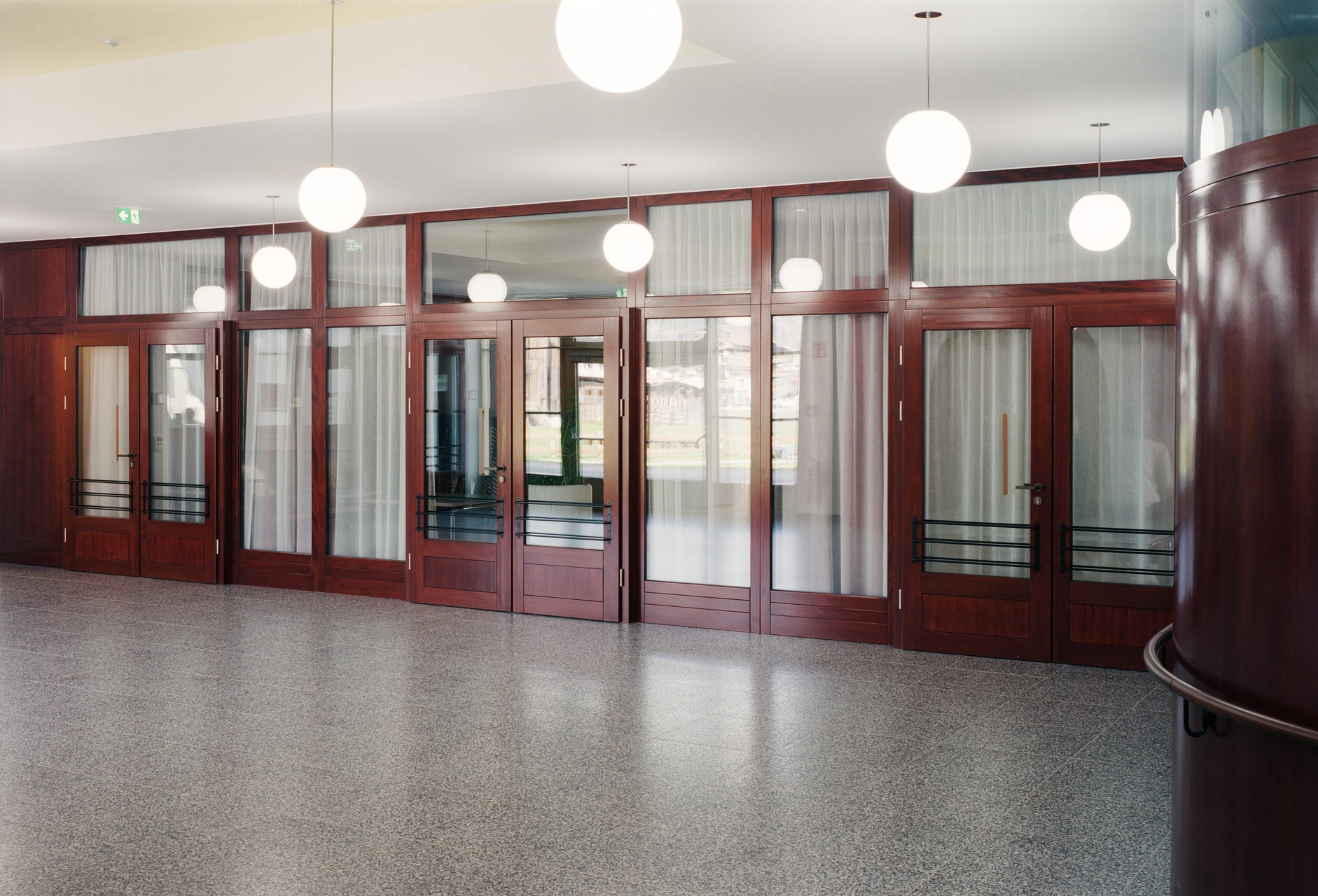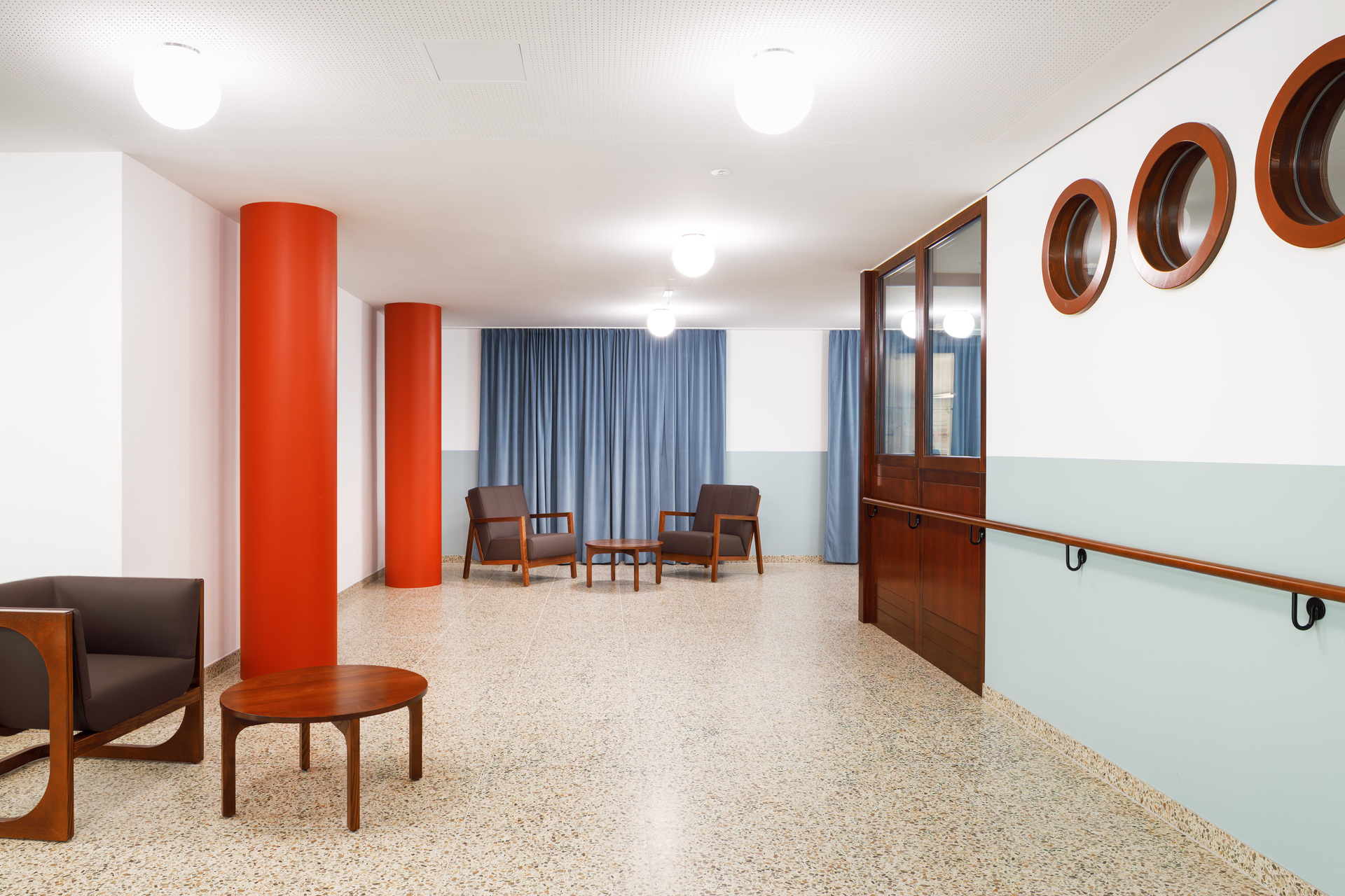Die Materialisierung und die Ausstattung des gesamten Ensembles schaffen eine Anmutung von unbeschwerter Zeitlosigkeit und Gediegenheit. Während die Böden der öffentlich zugänglichen Bereiche mit Terrazzo Fliesen belegt sind, wurde für den großen Saal und die Zimmer ein klassischer Fischgrat Parkett gewählt. Hohlkehlen an den Decken, Fenster- und Türrahmen aus dunklem Holz sowie Lüftungsflügel in hell eloxiertem Metall bereiten ein Gefühl von Geborgenheit und Vertrautheit. Denn sorgfältig geplante Detaillösungen und durchdacht gewählte Gestaltungselemente ermöglichten es, auch mit begrenztem Budget (die Kriterien der Wohnbauförderung waren einzuhalten) eine außergewöhnlich hohe Aufenthaltsqualität zu schaffen. Es wurde grundsätzlich darauf geachtet, dass der Anteil an verbautem Kunststoff so gering wie möglich gehalten wurde. Also kein Vollwärmeschutz, keine Kunststofffenster, etc..