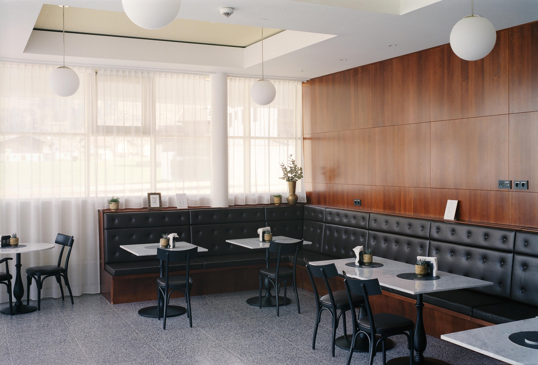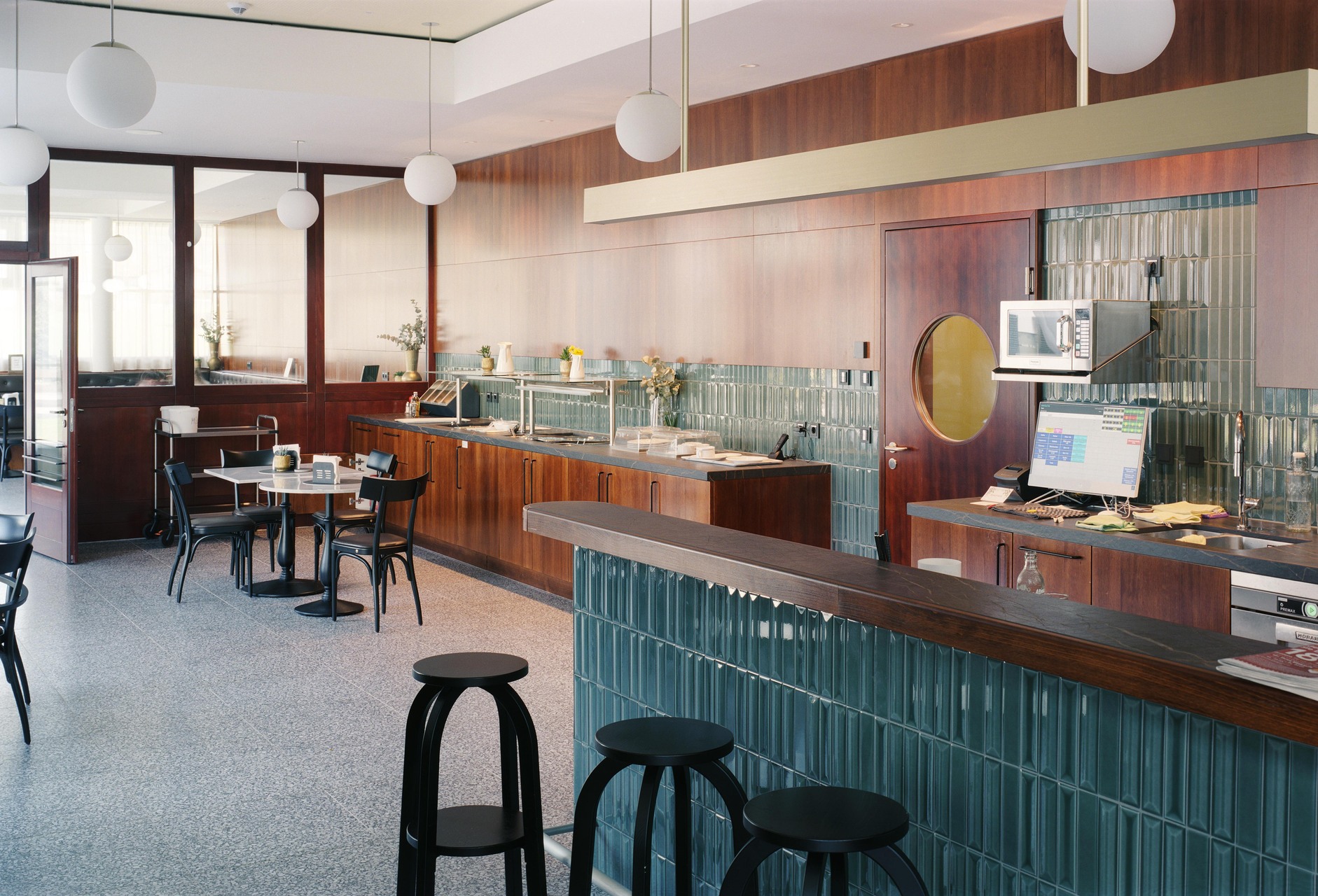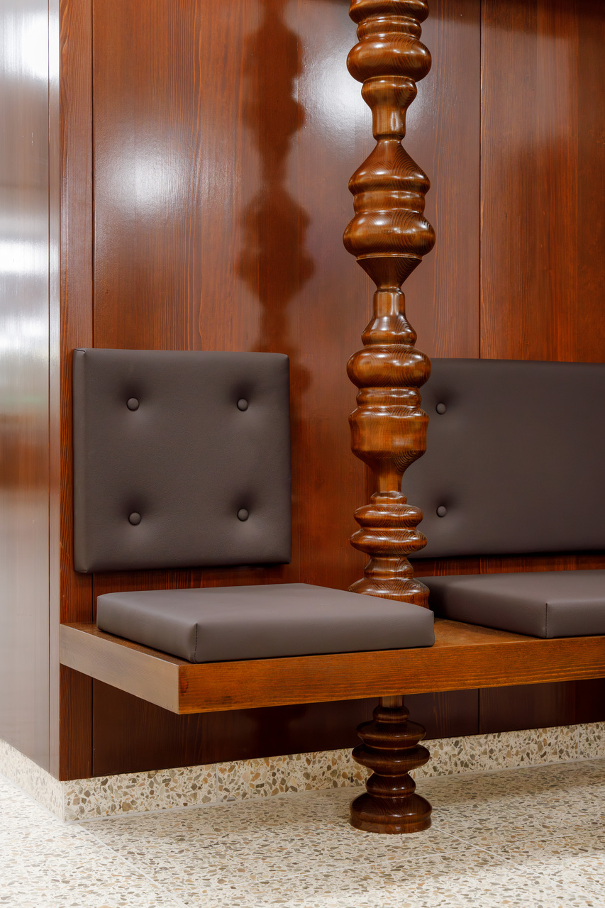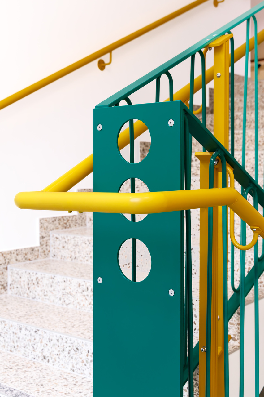 Die Materialisierung und die Ausstattung des gesamten Ensembles schaffen eine Anmutung von unbeschwerter Zeitlosigkeit und Gediegenheit. Während die Böden der öffentlich zugänglichen Bereiche mit Terrazzo Fliesen belegt sind, wurde für den großen Saal und die Zimmer ein klassischer Fischgrat Parkett gewählt. Hohlkehlen an den Decken, Fenster- und Türrahmen aus dunklem Holz sowie Lüftungsflügel in hell eloxiertem Metall bereiten ein Gefühl von Geborgenheit und Vertrautheit. Denn sorgfältig geplante Detaillösungen und durchdacht gewählte Gestaltungselemente ermöglichten es, auch mit begrenztem Budget (die Kriterien der Wohnbauförderung waren einzuhalten) eine außergewöhnlich hohe Aufenthaltsqualität zu schaffen. Es wurde grundsätzlich darauf geachtet, dass der Anteil an verbautem Kunststoff so gering wie möglich gehalten wurde. Also kein Vollwärmeschutz, keine Kunststofffenster, etc..