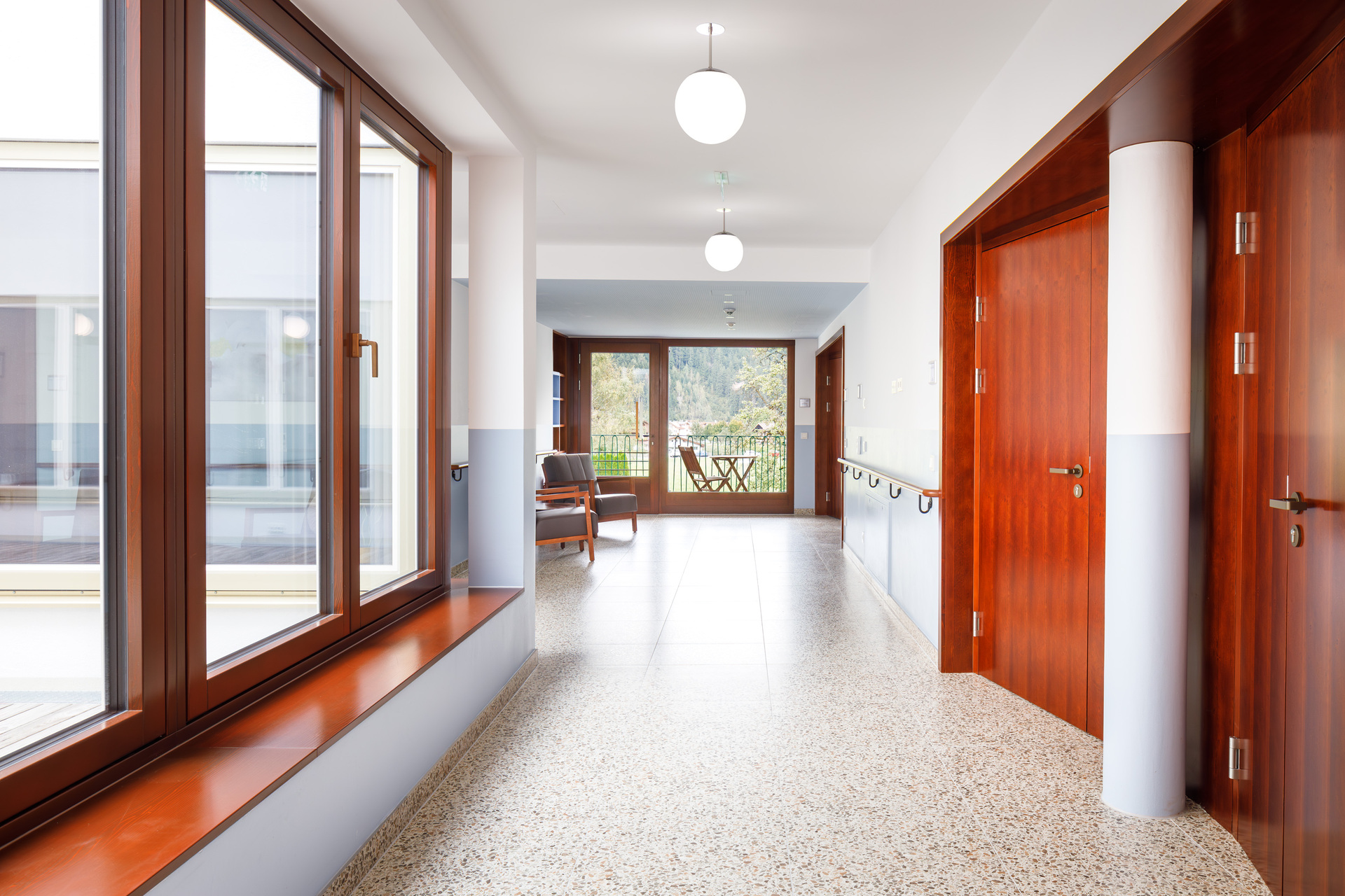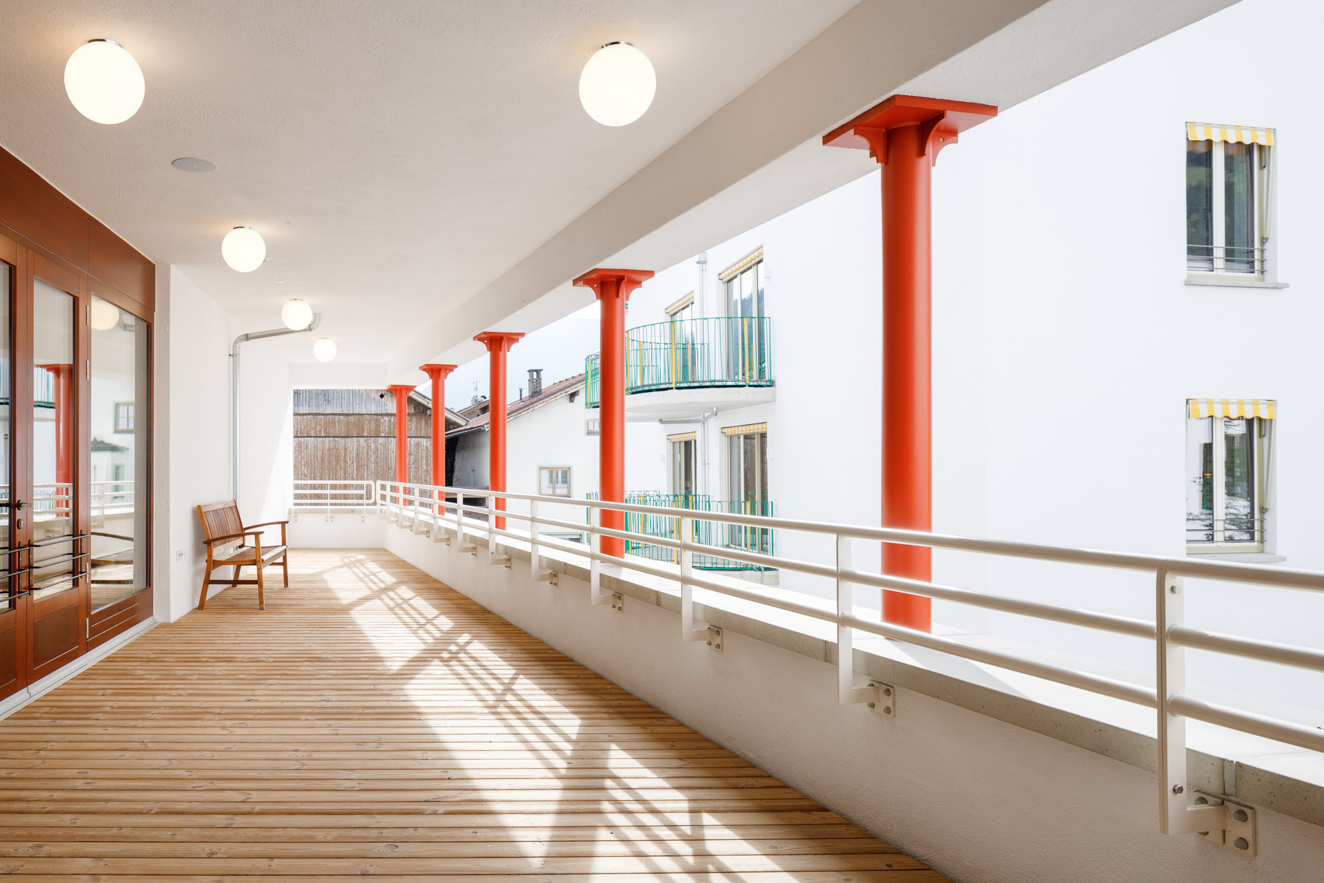 An diesem Ort soll der Lebensabend für Senior:innen aus der Region eingebettet in eine lebendige Gemeinschaft ausklingen, denn das neu geschaffene Sozialzentrum bietet nicht nur 70 Pflegezimmer und 15 Einheiten für betreutes Wohnen. Das Angebot für unterschiedliche Altersgruppen reicht vom Sozial- und Gesundheitssprengel, über eine Einrichtung zur Tagespflege, bis hin zum Eltern-Kind Zentrum. Das öffentlich zugängliche Café und ein großzügiger Saal, der für Veranstaltungen gemietet werden kann, ergänzen das vielschichtige Spektrum und schaffen Bezüge zum Dorfgeschehen.