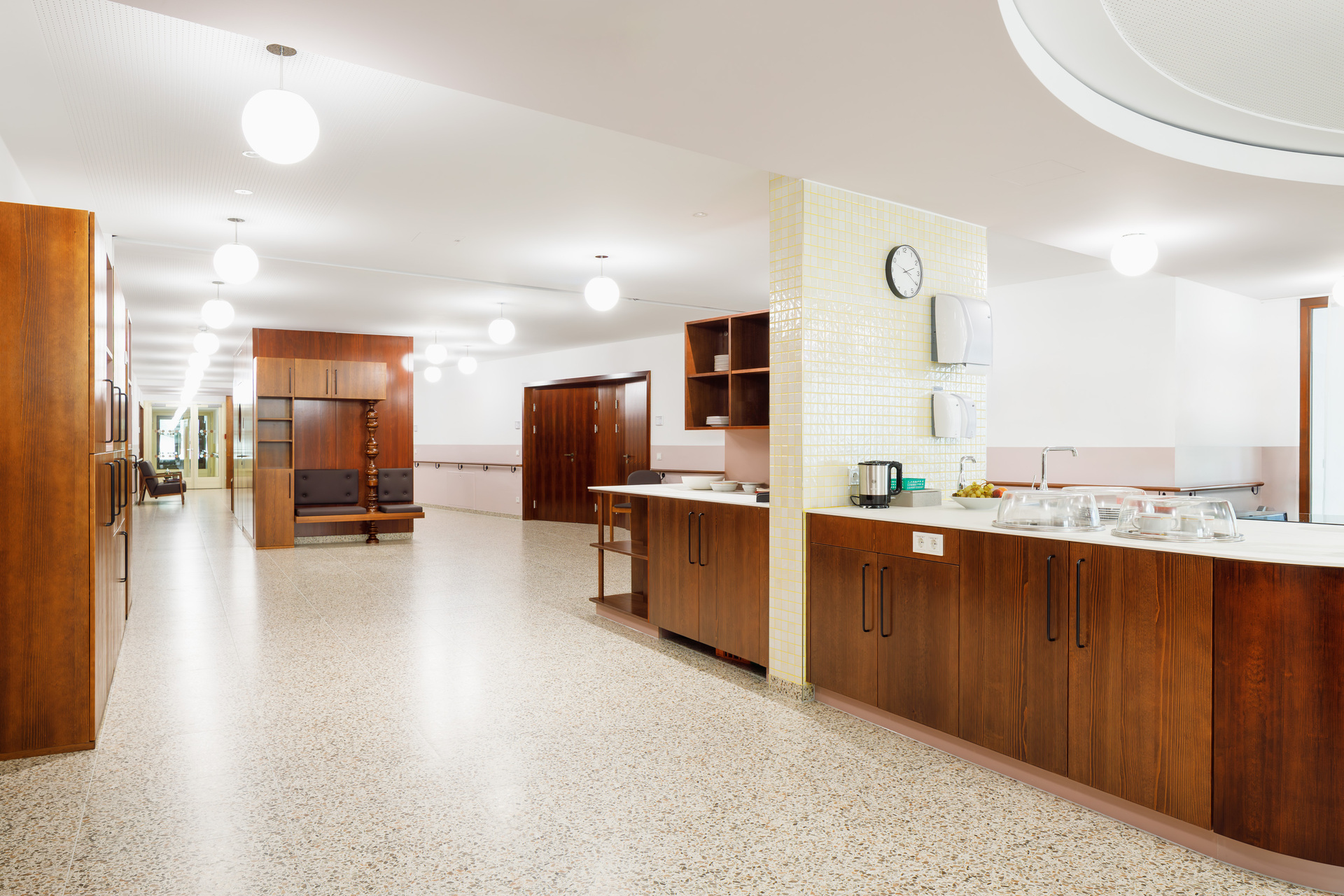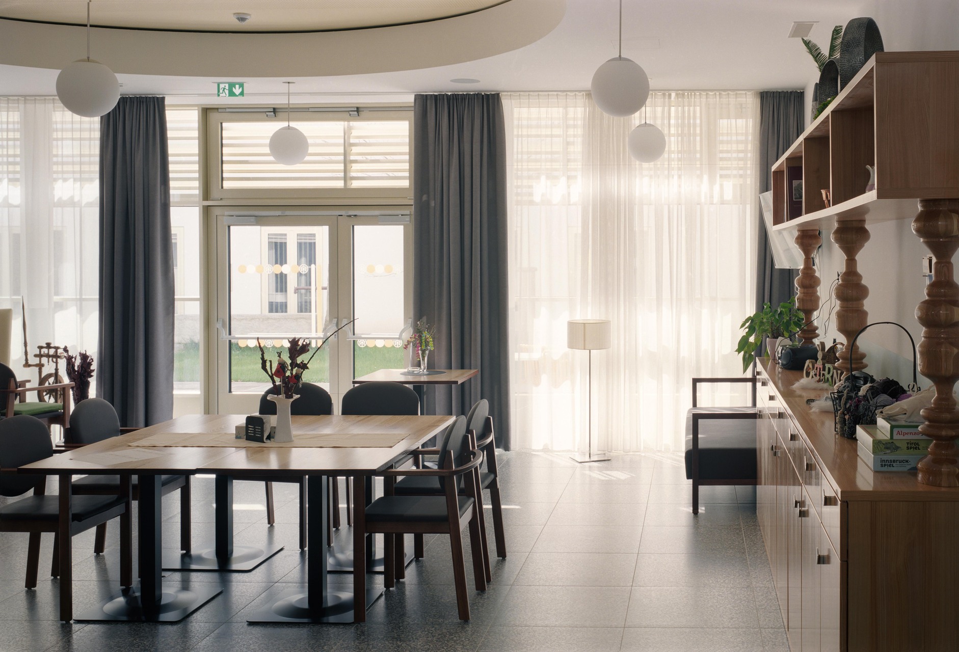 In den beiden darüber liegenden Geschossen sind die geräumigen Zimmer der Senior:innen angelegt, welche jeweils mit eigenen Bädern ausgestattet wurden. Großflächige Fenster und opake Lüftungsflügel mit französischen Balkonbrüstungen versorgen die Räume mit Tageslicht und bieten Blickverbindungen in die Umgebung. Um das Zusammenleben möglichst kurzweilig und unterhaltsam zu gestalten, sind für die Bewohnerinnen und Bewohner Teeküchen und gemütliche Sitzbereiche eingerichtet; bei angenehmen Temperaturen findet das Gemeinschaftsleben auf den Loggien und Terrassen statt. Da sich kurze Wege für die inneren Abläufe als wichtig erweisen, sind die zentralen Pflegestationen im Gelenk zwischen den beiden Trakten angeordnet, wo sich auch die Erschließungszonen befinden.