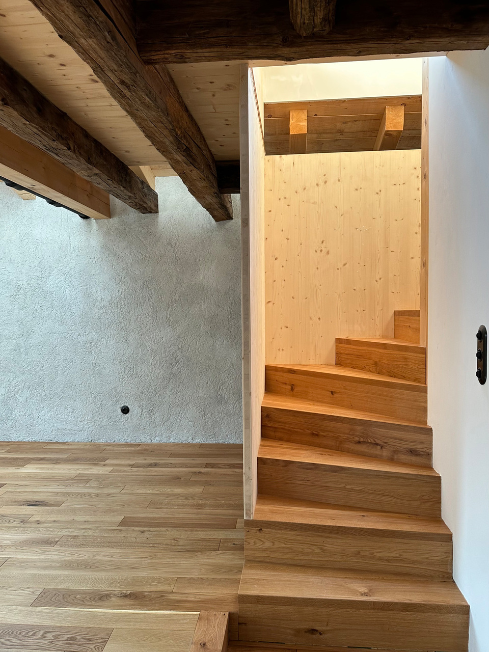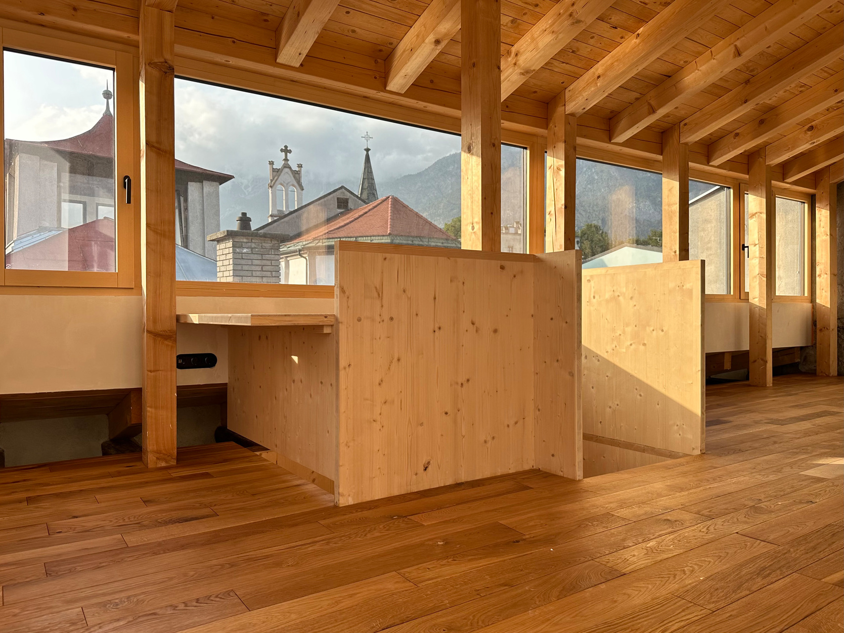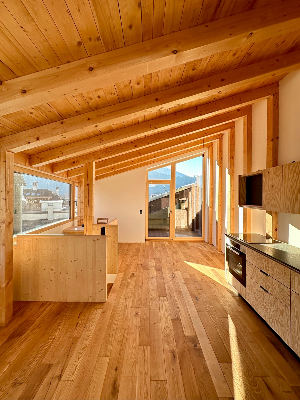 Durch die Aktivierung des Leerstands konnte dringend benötigter neuer Wohnraum ohne zusätzliche Bodenverbrauch zur Verfügung gestellt werden. Waren im desolaten Bestand vorher vier Substandardwohnungen untergebracht, so konnten durch gezielte Eingriffe und das Anheben des Daches neun Wohneinheiten – darunter zwei Maisonettewohnungen mit privaten Dachterrassen – realisiert werden, die über einen neuen Lift erschlossen werden. Dabei wurde die vorgefundene, kleinteilige Raumaufteilung durch das teilweise Entfernen nichttragender Mauern in zeitgemäße Grundrisslösungen umgewandelt und die Wohnungen mit moderner Technik ausgestattet (Fernwärmeanschluss, Glasfaserkabel, zentrale Wohnraumlüftung mit Wärmerückgewinnung). Die aus dem 15. Jahrhundert stammenden Holztrambalkendecken wurden statisch ertüchtigt und denkmalgerecht saniert. Bei der zurückhaltenden Aufstockung wurde die vorhandene Dachkonstruktion im Sinne des „urban mining“ als neue Zwischendecke wiederverwendet, die neue Dachkonstruktion aus heimischen Hölzern mit traditionellen Holzverbindungen in Vollholz und leimfrei errichtet. Trotz der strengen Auflagen des Denkmalschutzes konnte bei der Sanierung der Fenster, des Daches und der bodenberührenden Bauteile Niedrigenergiestandard erreicht werden.
