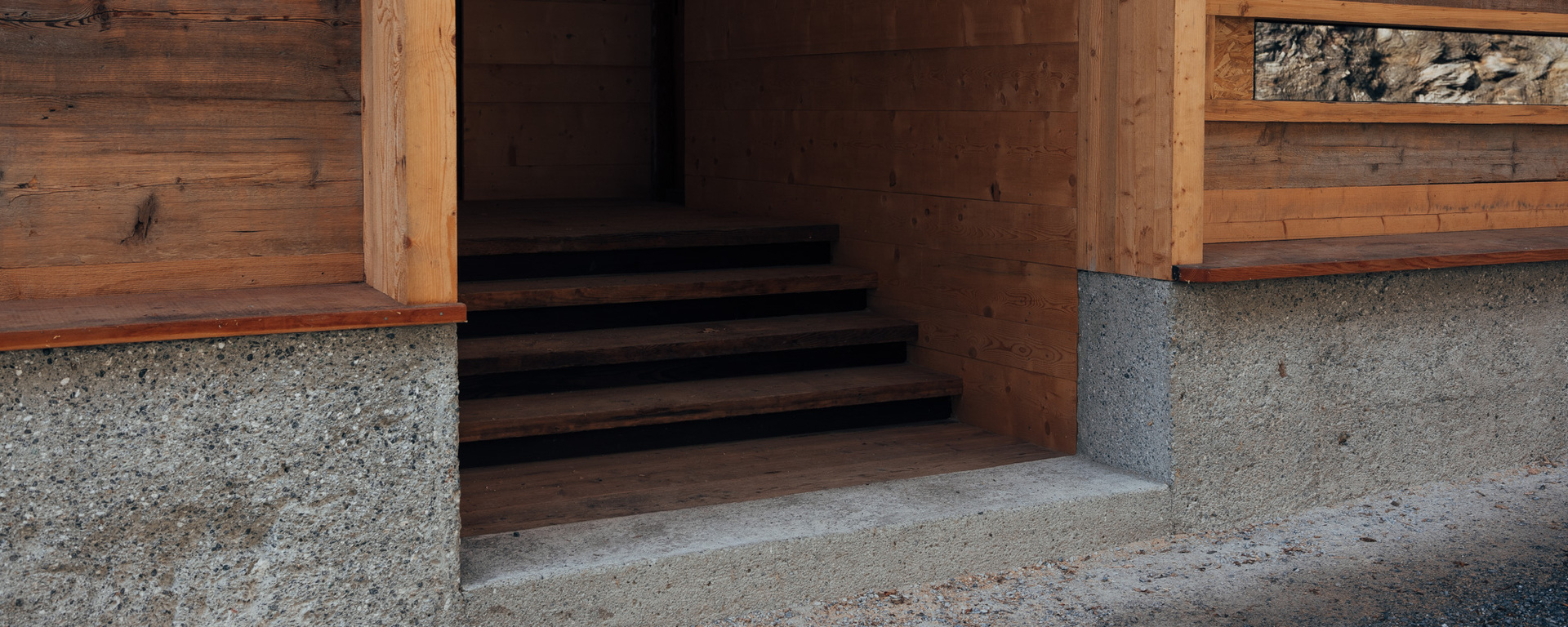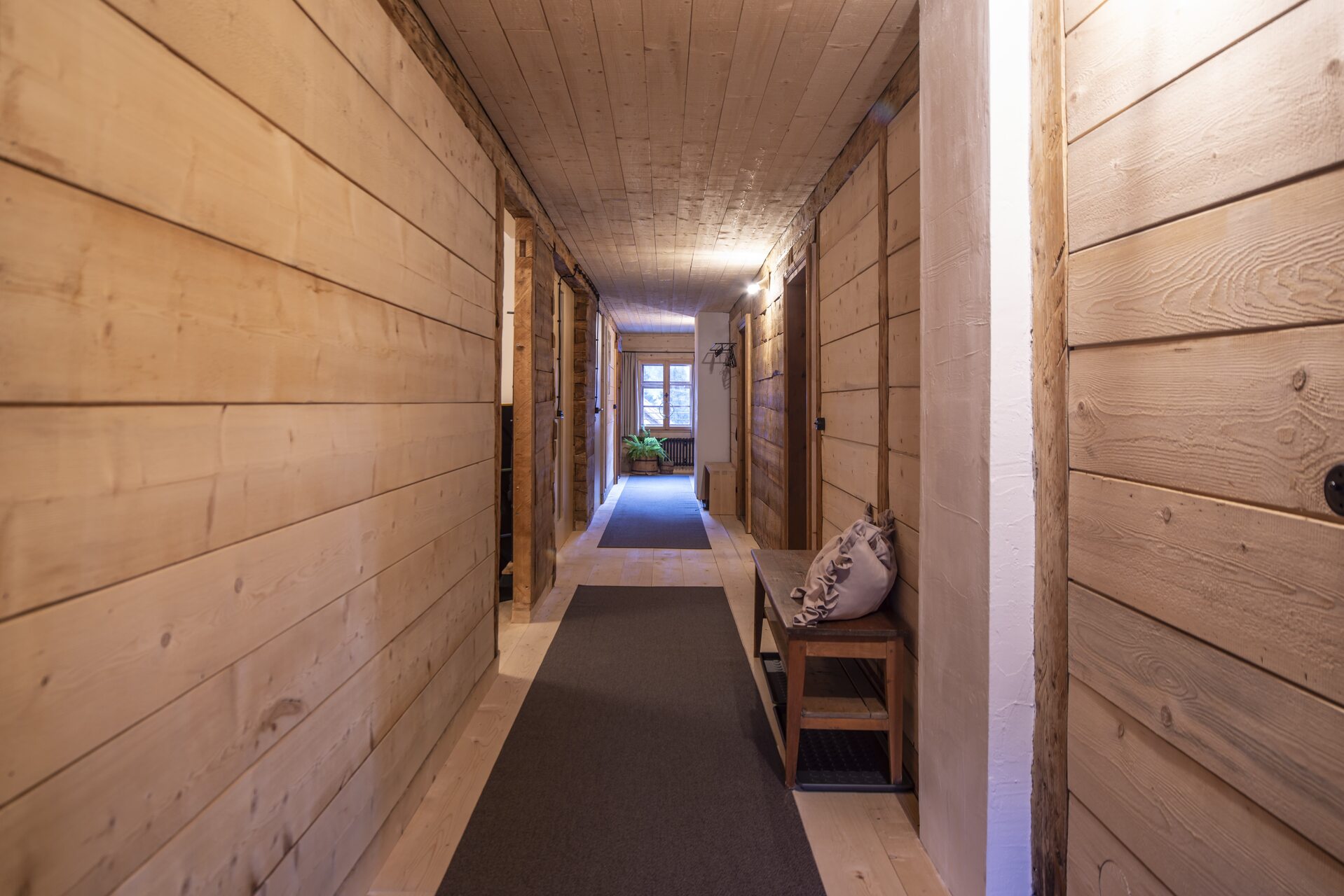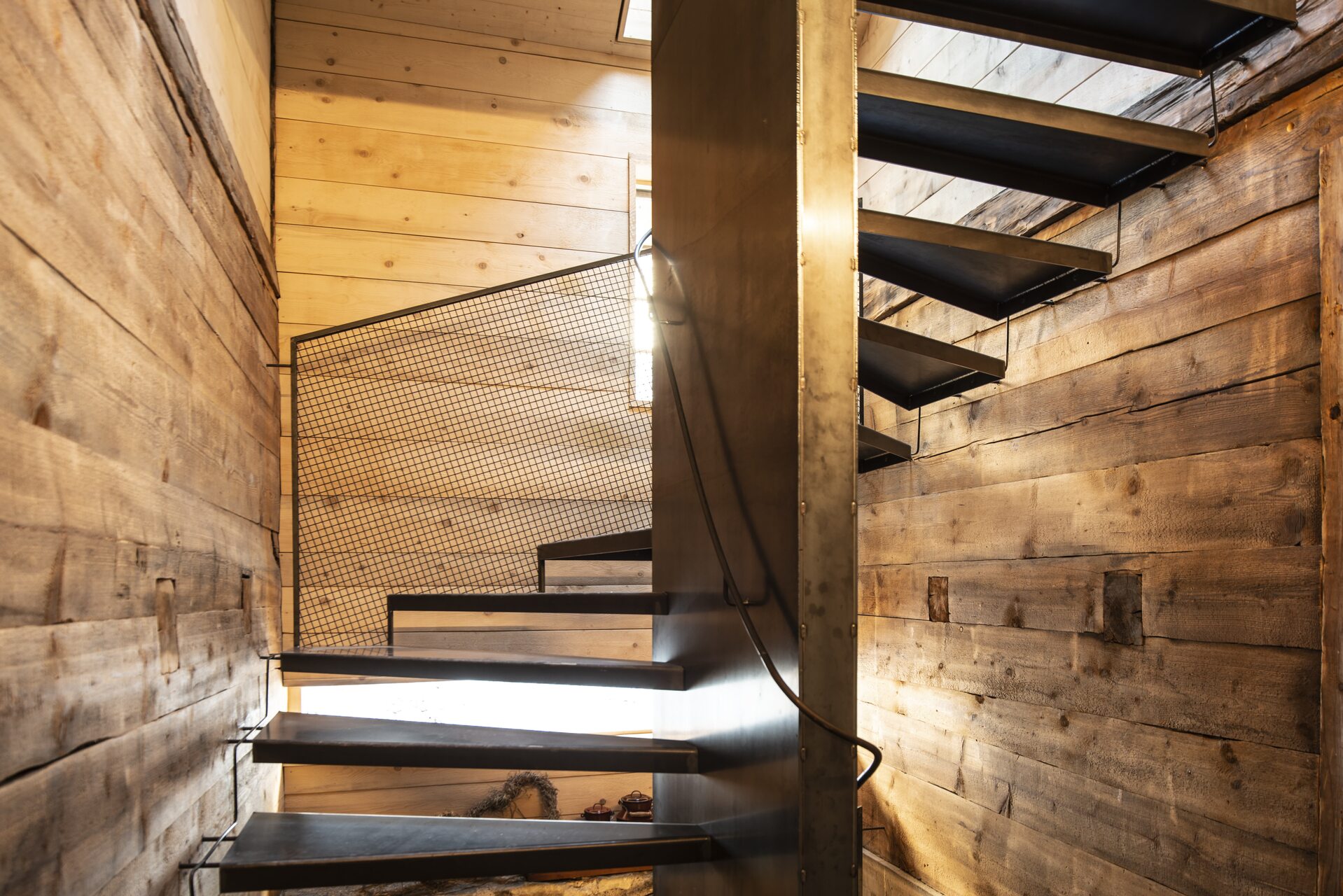 Als wesentlichster Eingriff wurde eine neue Erschließungstreppe aus Stahl mittig im Haus positioniert, die sämtliche Geschoße vom Keller bis zum Dach verbindet. Dadurch konnte die ursprüngliche Teilung des Doppelhauses beibehalten und der Grundgedanke fortgeschrieben werden. Um das Gebäude an heutige Standards der Energieeffizienz heranzuführen, wurden sowohl das Dach als auch der Bereich zwischen den Stubenwänden und den Holzblockwänden gedämmt. Eine innenseitig liegende Isolierverglasung verbessert die wärmedämmenden Eigenschaften und erlaubt gleichzeitig den Erhalt der alten Außenfenster.