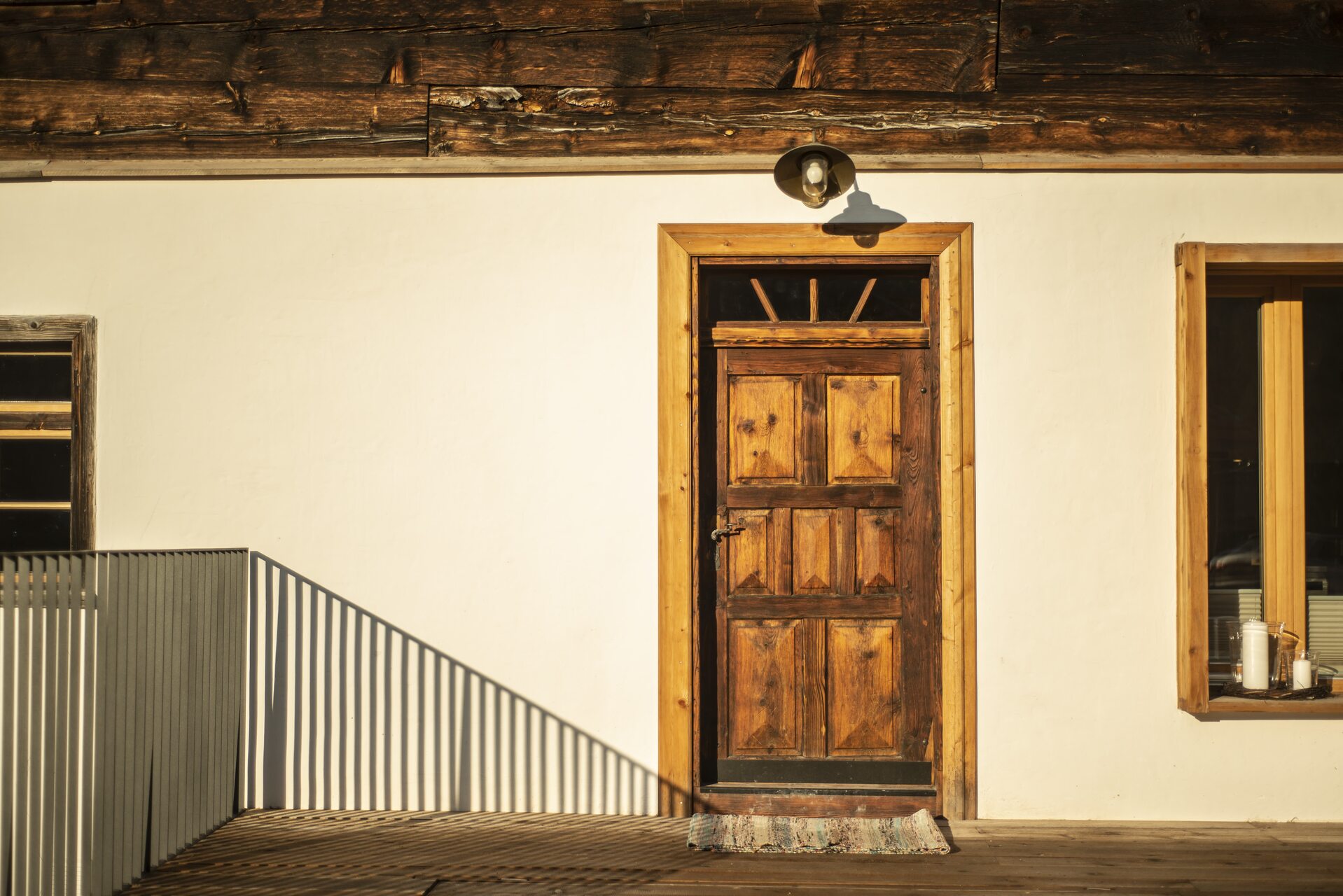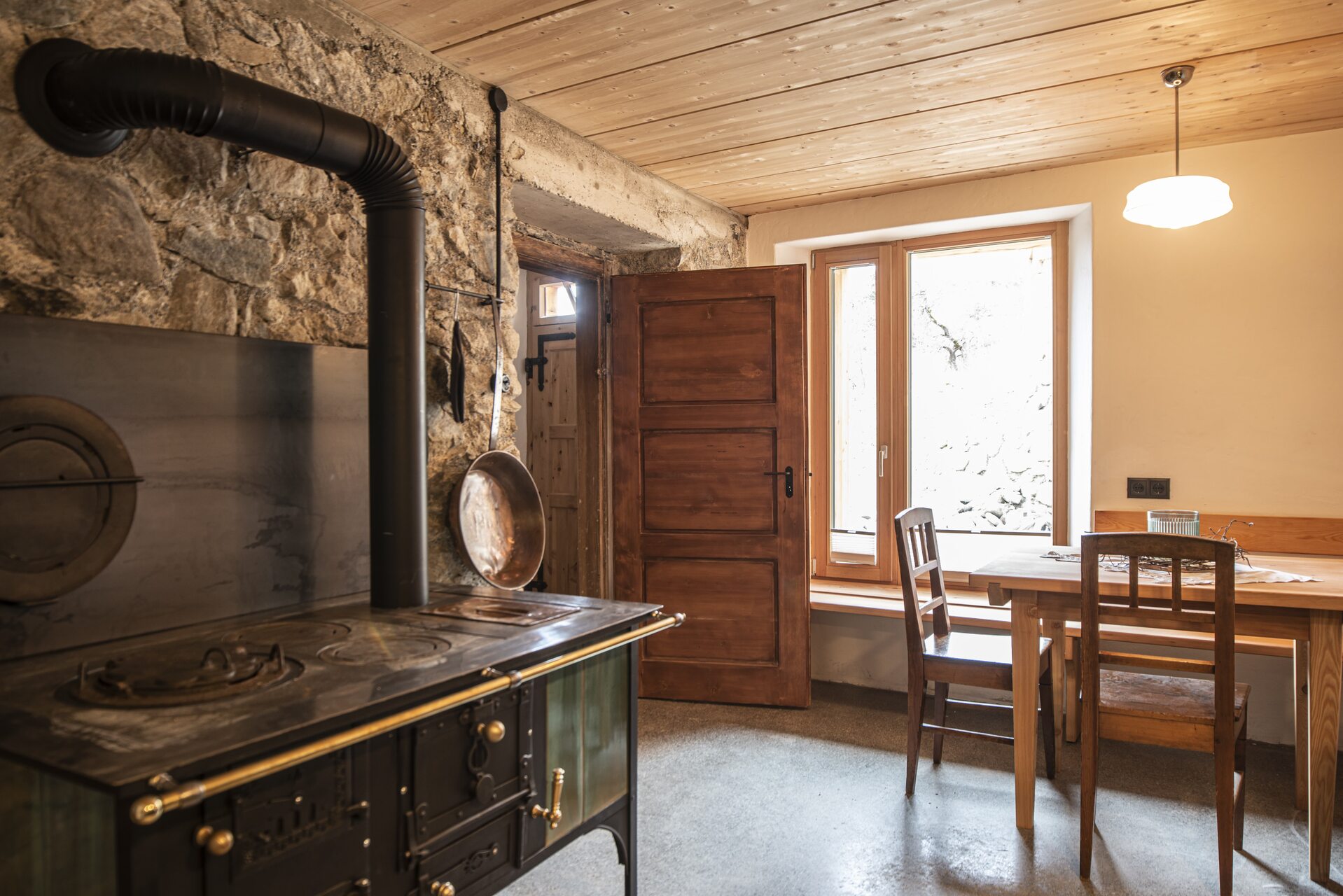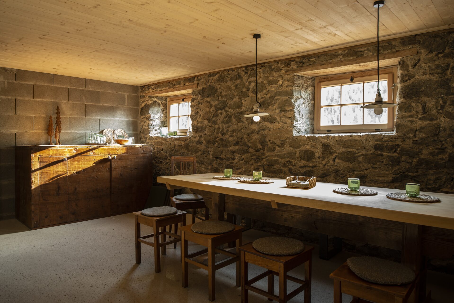 Als wesentlichster Eingriff wurde eine neue Erschließungstreppe aus Stahl mittig im Haus positioniert, die sämtliche Geschoße vom Keller bis zum Dach verbindet. Dadurch konnte die ursprüngliche Teilung des Doppelhauses beibehalten und der Grundgedanke fortgeschrieben werden. Um das Gebäude an heutige Standards der Energieeffizienz heranzuführen, wurden sowohl das Dach als auch der Bereich zwischen den Stubenwänden und den Holzblockwänden gedämmt. Eine innenseitig liegende Isolierverglasung verbessert die wärmedämmenden Eigenschaften und erlaubt gleichzeitig den Erhalt der alten Außenfenster.