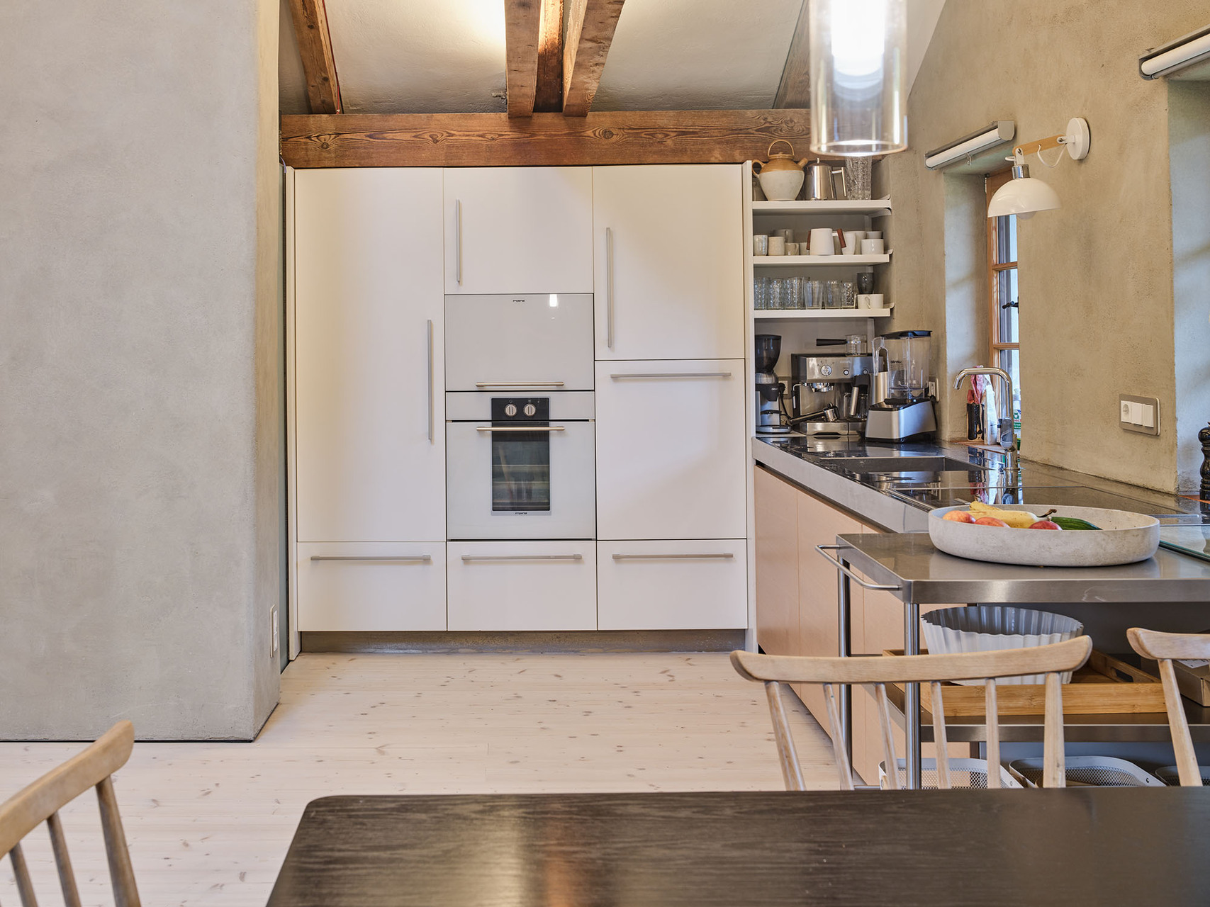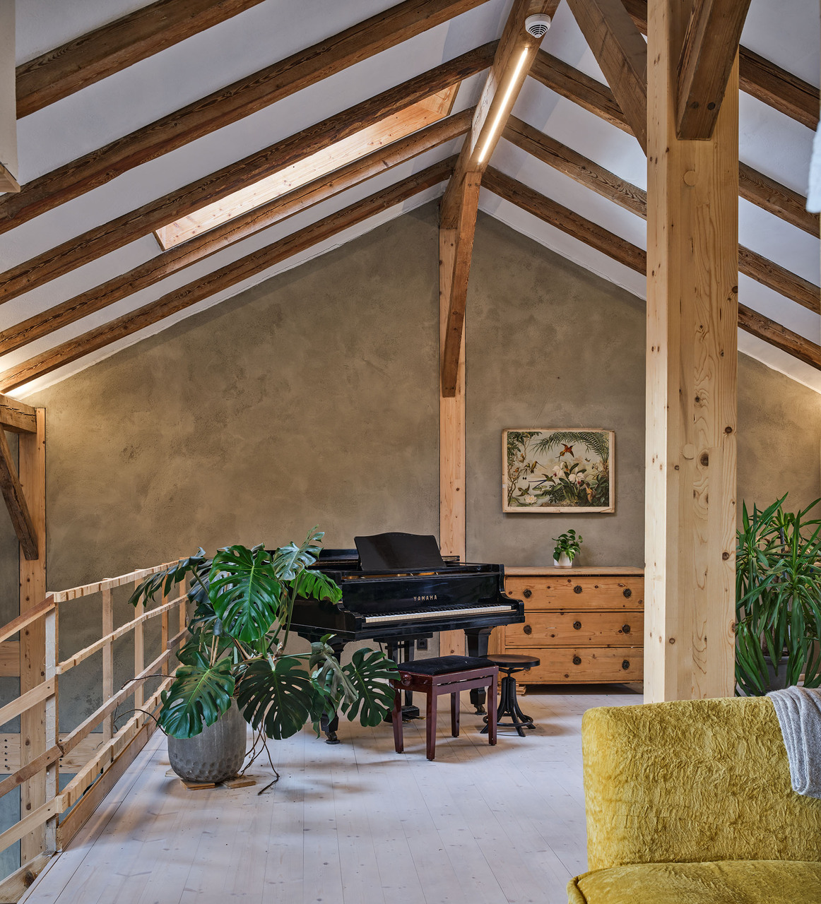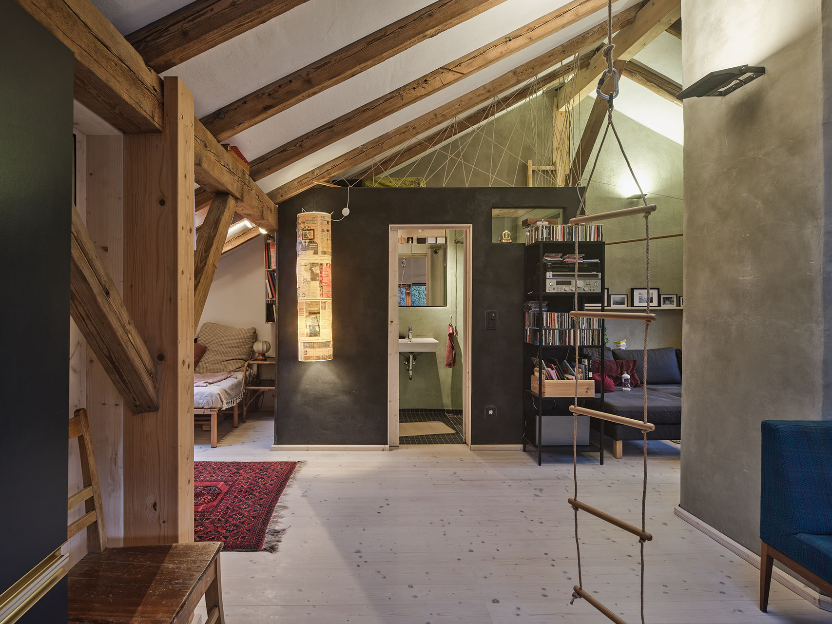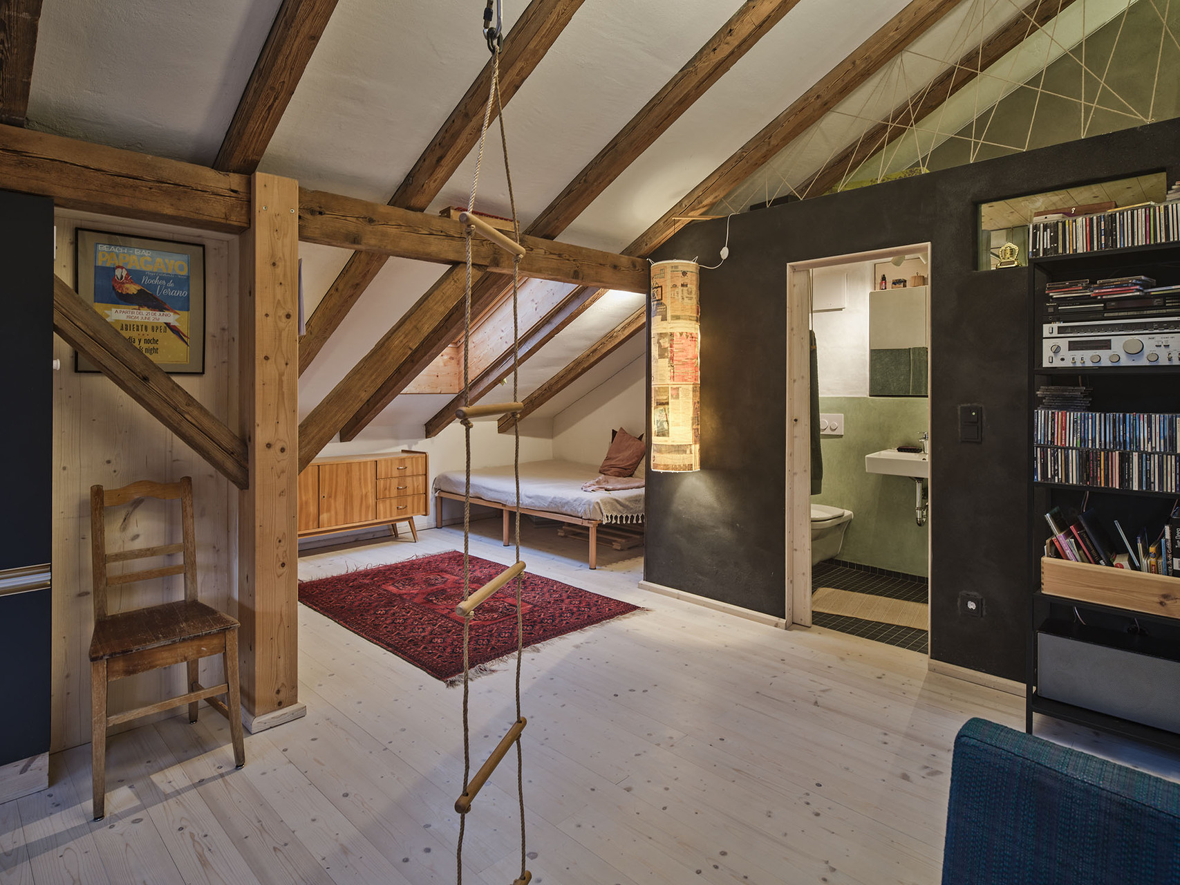 Obwohl wir das Gemeinsame schätzen, legen wir auch viel Wert auf Privatsphäre. Alle Wohneinheiten funktionieren eigenständig. Hin und wieder sind die Eingangstüren zu. Unsere Eltern leben im Erdgeschoss, daneben liegt ein Gemeinschaftsraum. Oft treffen wir uns bei Christina, sie hat den größten Esstisch. Ein Glücksfund, secondhand, wie vieles in unseren Wohnungen."