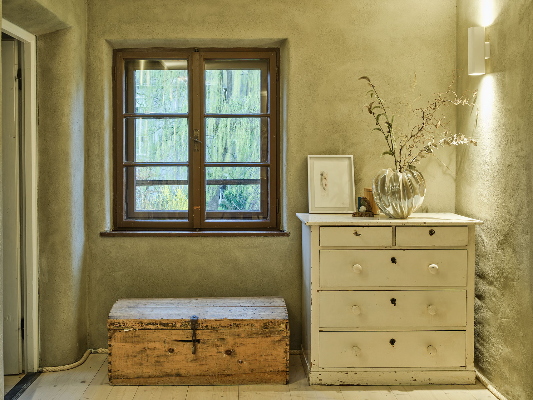 Das Arbeiten mit Lehm ist dankbar – man kann es einfach probieren. Wenn man nicht zufrieden ist, lässt sich der Putz in Wasser auflösen und neu aufbringen. Er lässt sich leicht ausbessern, notfalls auch mit bloßen Händen. An den unterschiedlichen Wohnräumen lässt sich unsere Lernkurve ablesen: Bei Veronika sind die Wände teils noch etwas uneben, als wir Christinas Wohnung gebaut haben, ging alles schon leichter von der Hand. Christina ist im August 2021 eingezogen, Veronika schon 2018. Anfangs wollten wir alle Wohnungen gleichzeitig errichten, doch Veronikas Kinder waren noch klein, sie hat die Wohnung am dringendsten gebraucht.
