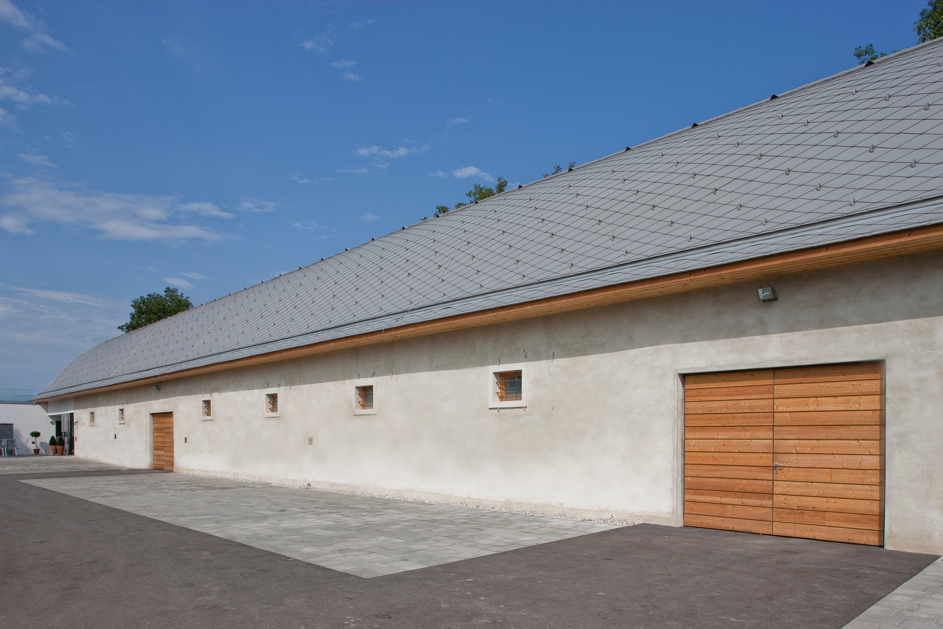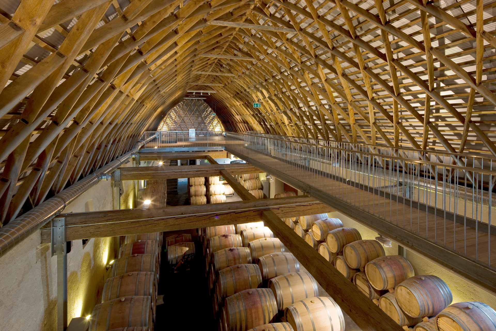 Ein natürlicher Lehmputz und ein monolithischer dunkler Betonboden in Kombination mit den vorhandenen massiven Holzbalken und der fein strukturierten Dachkonstruktion schaffen durch einen respektvollen Umgang mit der Historie einen einmaligen Ort für Fasslagerung und Weinausbau. Ein Steg aus Stahl und Lärchenholz schwebt über den Eichenfässern. Der Besucher wird so durch das Weingut geführt und erlebt den fast sakralen Charakter des Raumes hautnah.