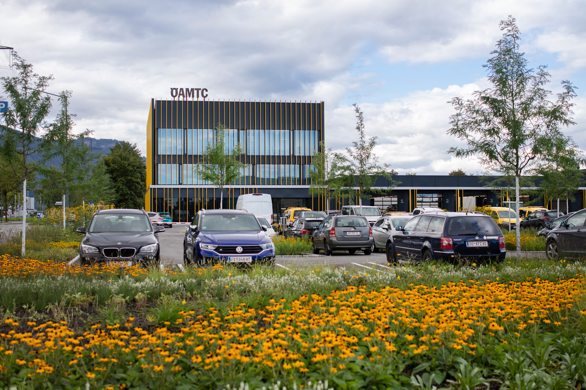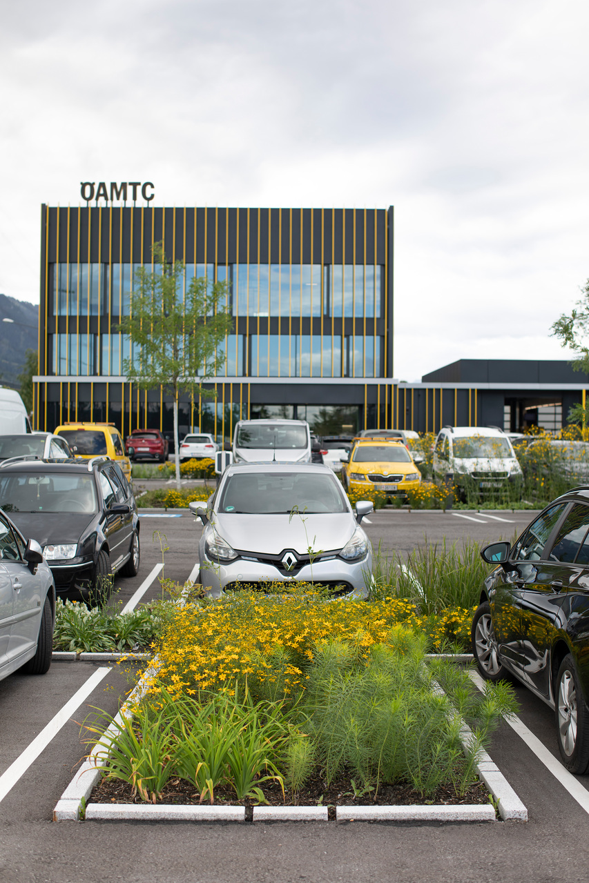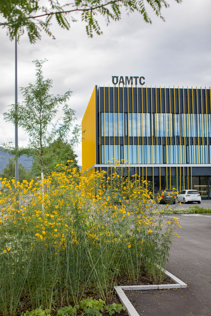 Projektinitial war der Neubau der ÖAMTC Landeszentrale am Kreisverkehr Dornbirn West. In einer zweiten Etappe sollte dann der Parkplatz neugestaltet werden. Im Bewusstsein um den Mehrwert freiräumlicher Qualität vergleichbar exponierter Standorte entschloss sich die Bauherrschaft zur Beauftragung eines Bepflanzungsplanes. Entwickelt wurde schließlich ein umfassender Planungsbeitrag mit anspruchsvoller Gehölz- und Staudenverwendung, Biodiversitätsdach, Wildgehölzsaum samt typischer Geophytenflur und einer generell klimaresilienten Konzeption. Zusätzlich wurden Aufenthaltsbereiche mit individuellen Möbeln eigens für diesen Standort entwickelt.Im Süden der Anlage strukturieren Stauden-Gräserpflanzungen die Parkplätze, zum Kreisverkehr hin entwickelt die Pflanzung über großzügige Drifts echte Strahlkraft. Das Farbspektrum ist in Gelbtönen gehalten, wobei hier Aspekte von Austrieb, Blüte und Herbstfärbung berücksichtigt wurden. Weiß- und dunkelrot blühende Arten lockern das Farbkonzept auf, ebenso begründen Vertikalaspekte von Gräsern und einzelnen Staudenarten eine spielerisch-freie Antwort auf ein funktional-nüchternes Parkraumkonzept. Blüten tanzen zwischen den Parkplätzen, darüber entwickeln Solitäre von Gleditsia triacanthos flirrende, gelbgrüne Lichtspiele.