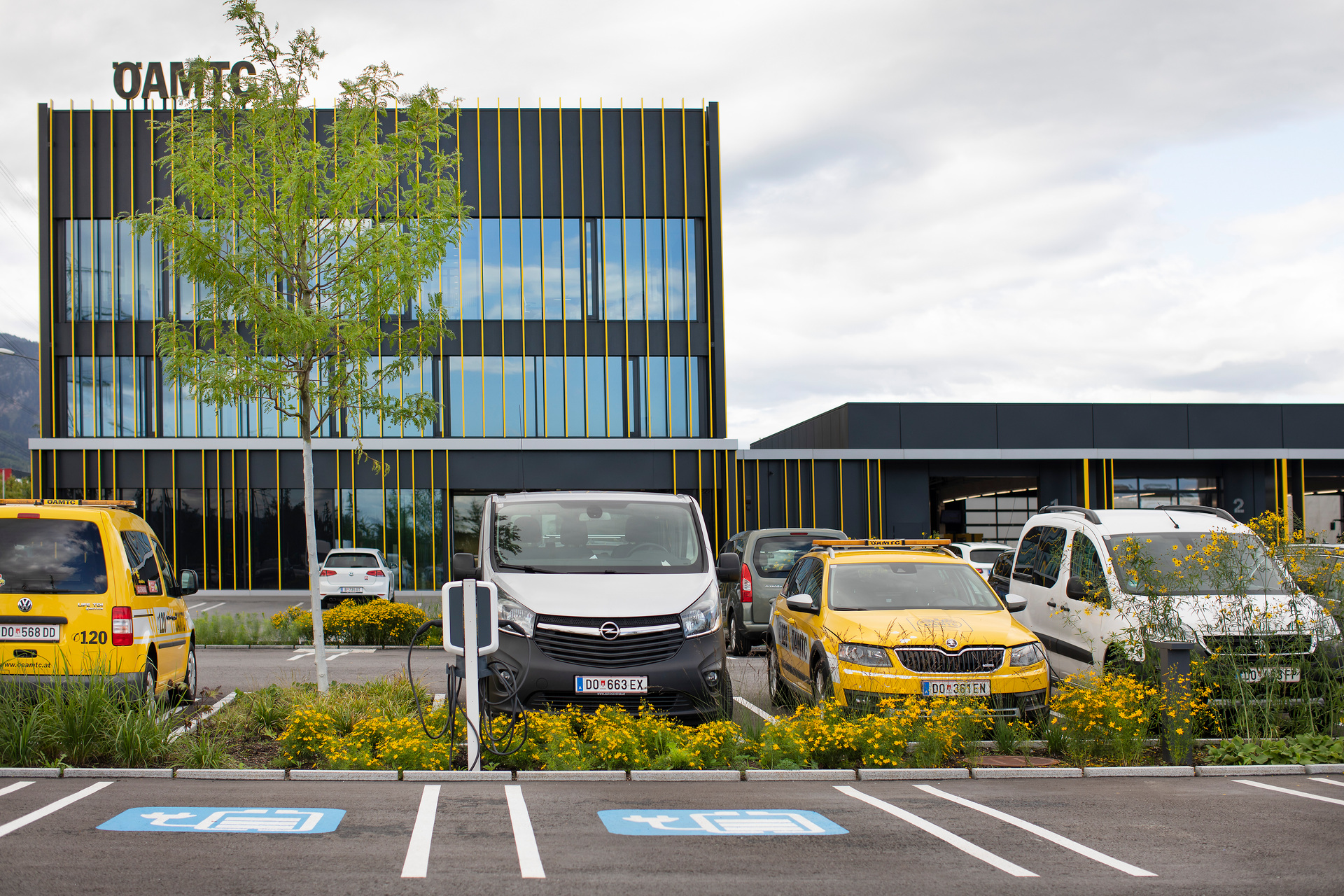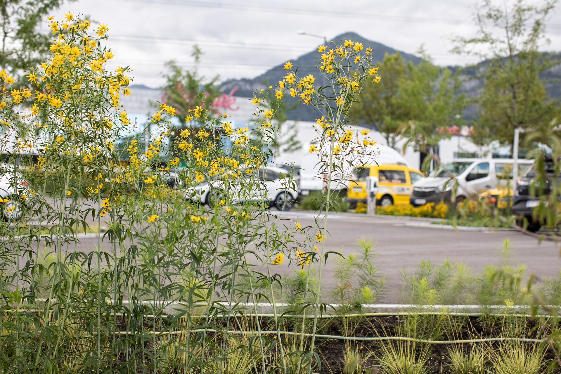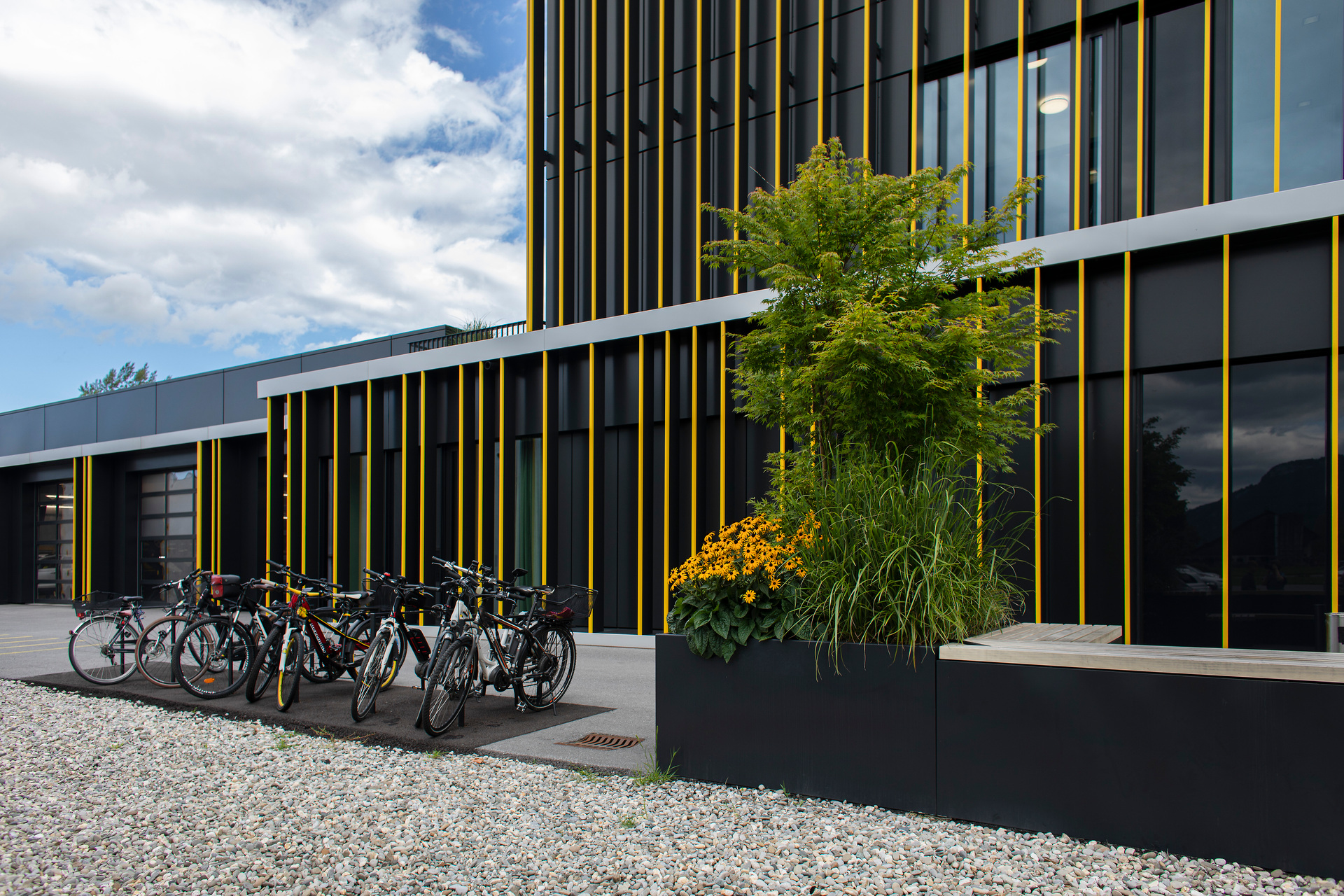 Projektinitial war der Neubau der ÖAMTC Landeszentrale am Kreisverkehr Dornbirn West. In einer zweiten Etappe sollte dann der Parkplatz neugestaltet werden. Im Bewusstsein um den Mehrwert freiräumlicher Qualität vergleichbar exponierter Standorte entschloss sich die Bauherrschaft zur Beauftragung eines Bepflanzungsplanes. Entwickelt wurde schließlich ein umfassender Planungsbeitrag mit anspruchsvoller Gehölz- und Staudenverwendung, Biodiversitätsdach, Wildgehölzsaum samt typischer Geophytenflur und einer generell klimaresilienten Konzeption. Zusätzlich wurden Aufenthaltsbereiche mit individuellen Möbeln eigens für diesen Standort entwickelt.Im Süden der Anlage strukturieren Stauden-Gräserpflanzungen die Parkplätze, zum Kreisverkehr hin entwickelt die Pflanzung über großzügige Drifts echte Strahlkraft. Das Farbspektrum ist in Gelbtönen gehalten, wobei hier Aspekte von Austrieb, Blüte und Herbstfärbung berücksichtigt wurden. Weiß- und dunkelrot blühende Arten lockern das Farbkonzept auf, ebenso begründen Vertikalaspekte von Gräsern und einzelnen Staudenarten eine spielerisch-freie Antwort auf ein funktional-nüchternes Parkraumkonzept. Blüten tanzen zwischen den Parkplätzen, darüber entwickeln Solitäre von Gleditsia triacanthos flirrende, gelbgrüne Lichtspiele.