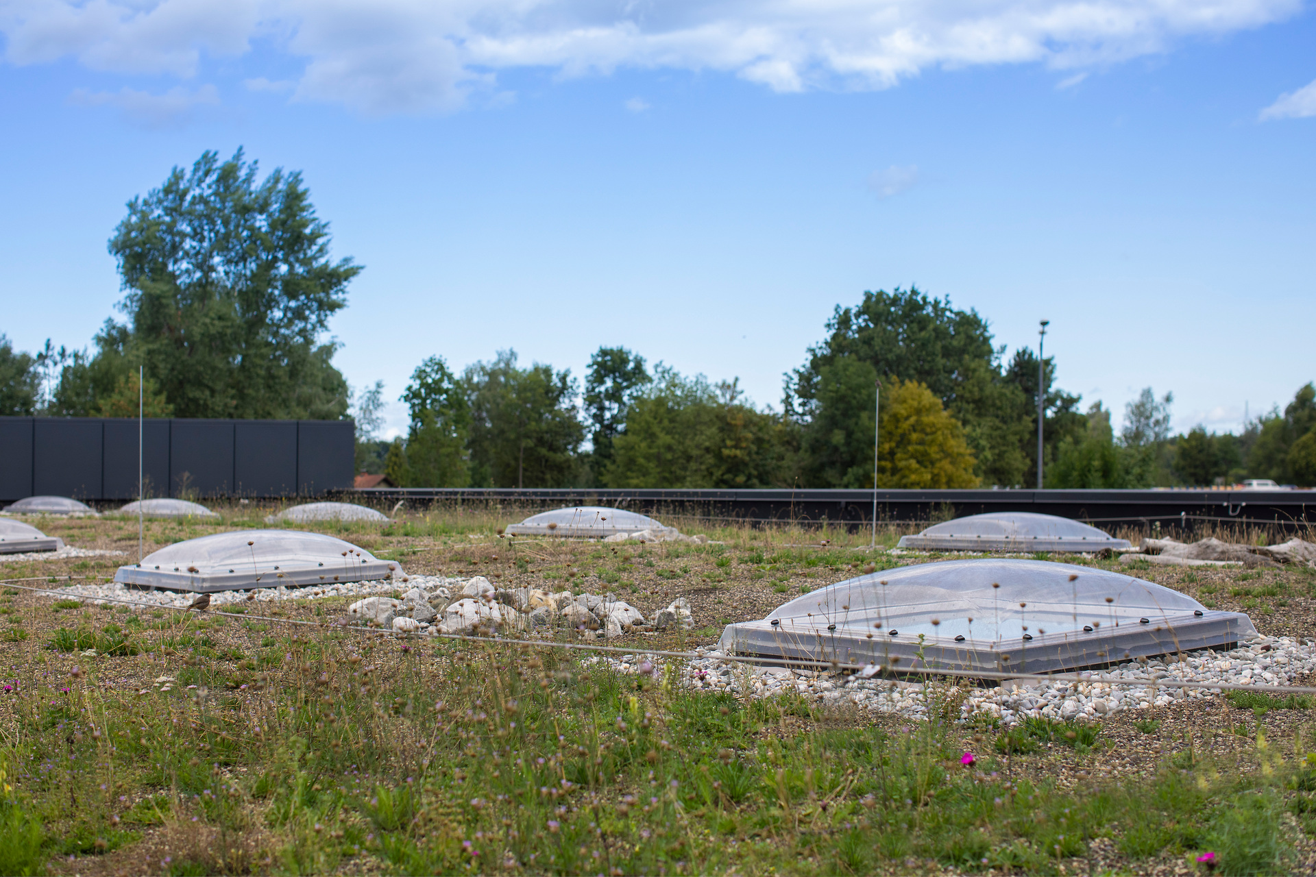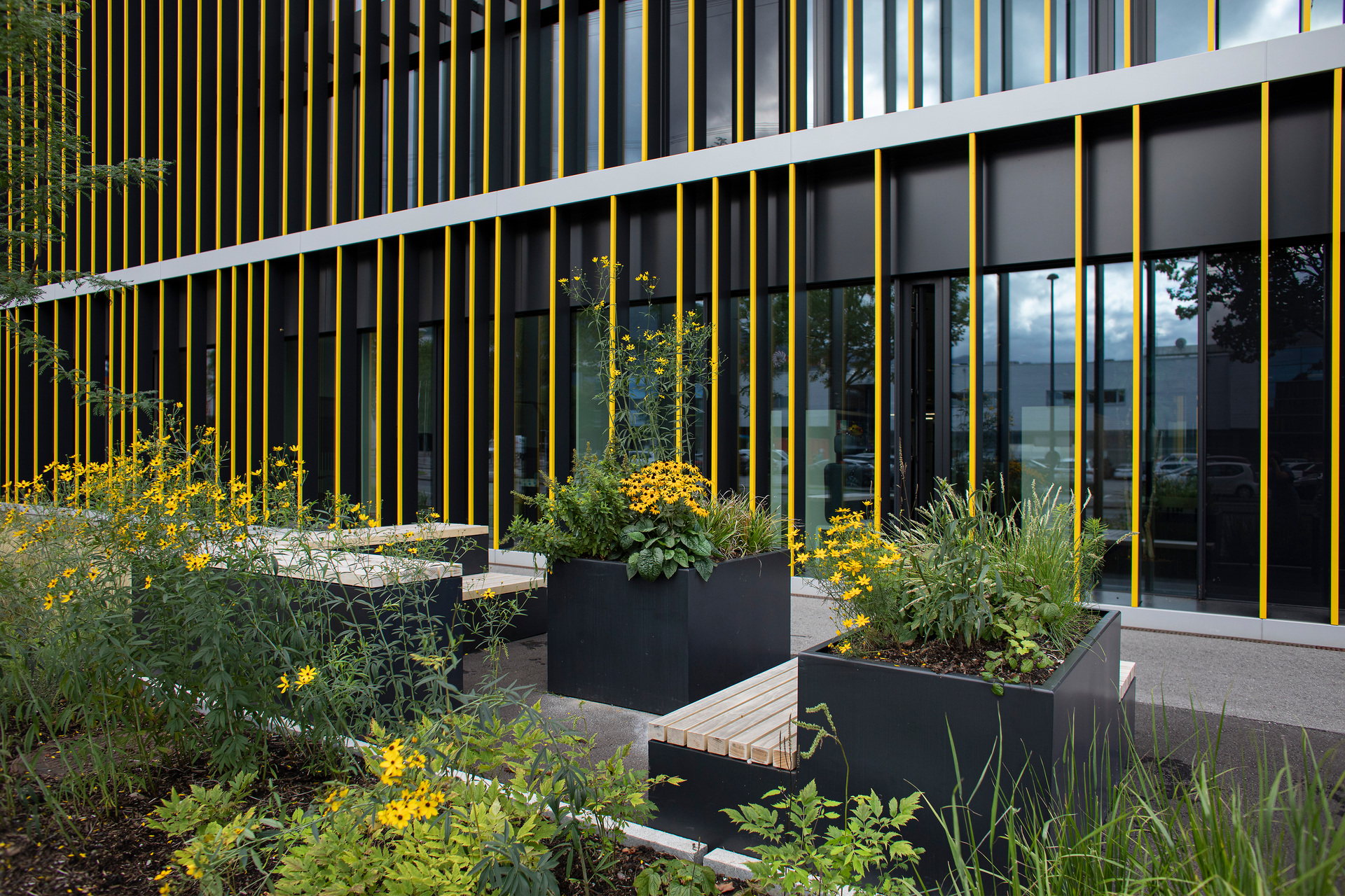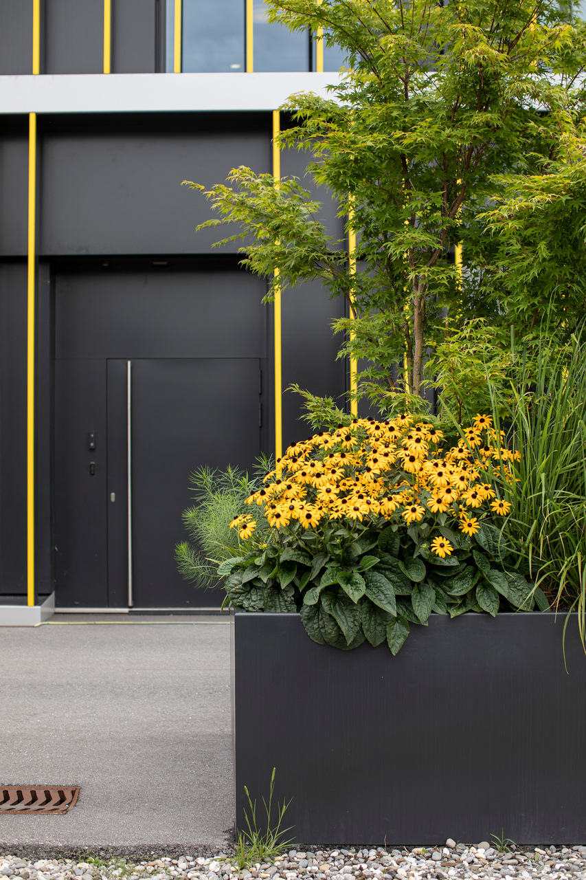 Östlich des Gebäudes lag ursprünglich nur ein schmaler Streifen mit Abstandsgrün zur Unteren Roßmähder Straße hin. Im Zuge der freiräumlichen Gestaltung entstand hier ein kommunikatives Möbel, bepflanzt mit Stauden und Gräsern sowie ergänzt um einen kleinen Radparkplatz. Dieser Aufenthaltsbereich referenziert sowohl zum Haupteingang gleich ums Eck als auch zum nahen Fußgängerübergang und wird von Kunden besonders gut angenommen. Ein weiteres Freiraummöbel mit Bepflanzung und Radparken wurde südlich am Gebäude realisiert, dieses ist ein beliebter Pausentreffpunkt für die Mitarbeiter aus Büro und Werkstatt. Auf dem Dach der Werkstätten wurden 620 m² Begrünung als Biodiversitätsdach mit Totholz- und Steinhaufenaspekten realisiert. Mit ihrer Einsehbarkeit vom Bürotrakt aus findet auch diese Fläche großen Zuspruch. Insgesamt identifizieren sich die Mitarbeiter am Standort mit der neuen Gestaltung, u.a. verfolgen sie anhand eines Blüh- und Herbstfärbungskalenders die jahreszeitlichen Aspekte der rund 11.100 Stauden- und Gräserpflanzen auf dem Areal. (Text: Landschaftsarchitektin)
