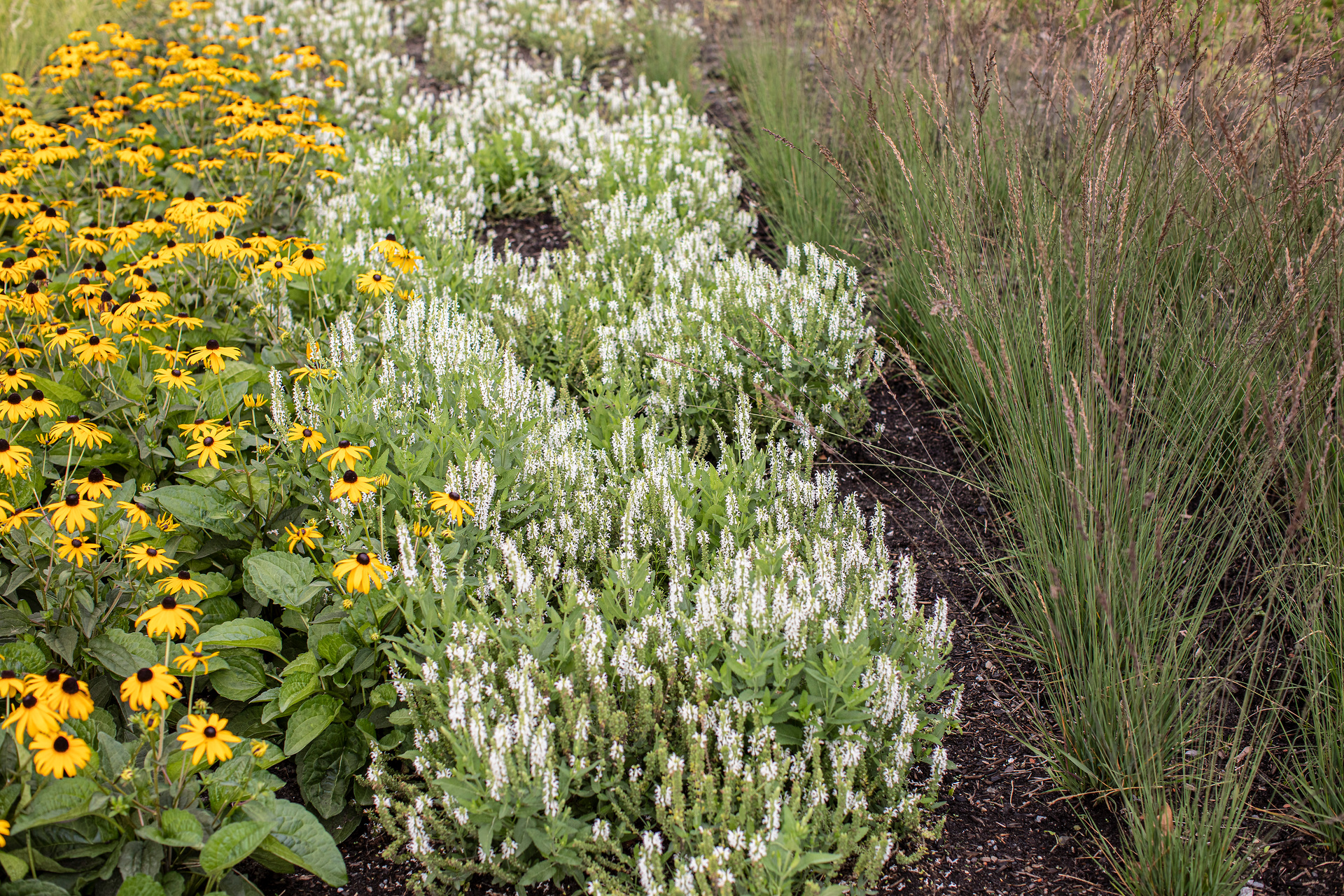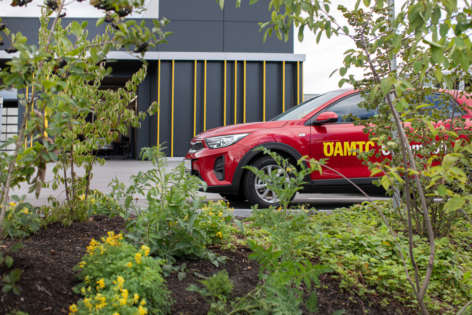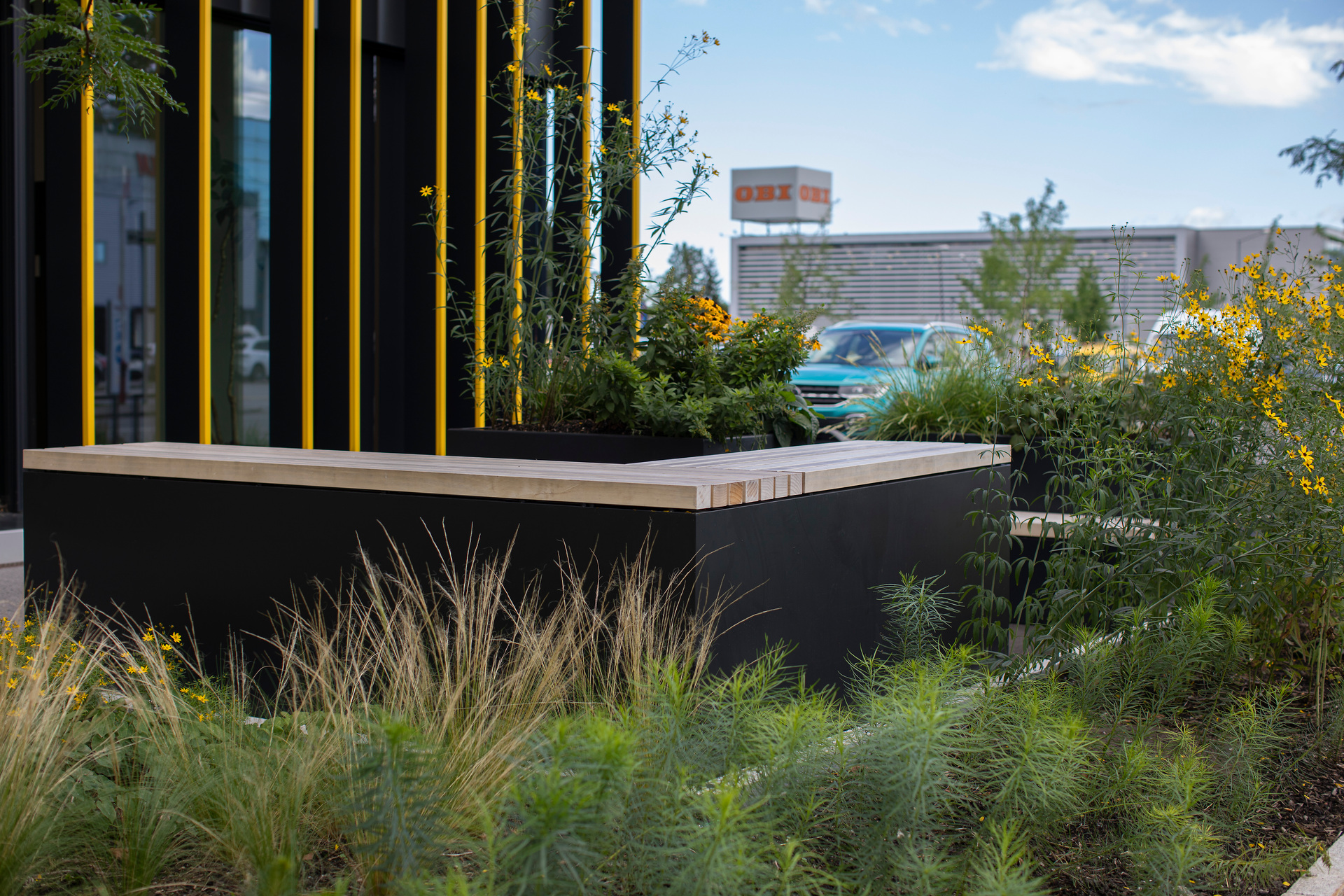 Östlich des Gebäudes lag ursprünglich nur ein schmaler Streifen mit Abstandsgrün zur Unteren Roßmähder Straße hin. Im Zuge der freiräumlichen Gestaltung entstand hier ein kommunikatives Möbel, bepflanzt mit Stauden und Gräsern sowie ergänzt um einen kleinen Radparkplatz. Dieser Aufenthaltsbereich referenziert sowohl zum Haupteingang gleich ums Eck als auch zum nahen Fußgängerübergang und wird von Kunden besonders gut angenommen. Ein weiteres Freiraummöbel mit Bepflanzung und Radparken wurde südlich am Gebäude realisiert, dieses ist ein beliebter Pausentreffpunkt für die Mitarbeiter aus Büro und Werkstatt. Auf dem Dach der Werkstätten wurden 620 m² Begrünung als Biodiversitätsdach mit Totholz- und Steinhaufenaspekten realisiert. Mit ihrer Einsehbarkeit vom Bürotrakt aus findet auch diese Fläche großen Zuspruch. Insgesamt identifizieren sich die Mitarbeiter am Standort mit der neuen Gestaltung, u.a. verfolgen sie anhand eines Blüh- und Herbstfärbungskalenders die jahreszeitlichen Aspekte der rund 11.100 Stauden- und Gräserpflanzen auf dem Areal. (Text: Landschaftsarchitektin)
