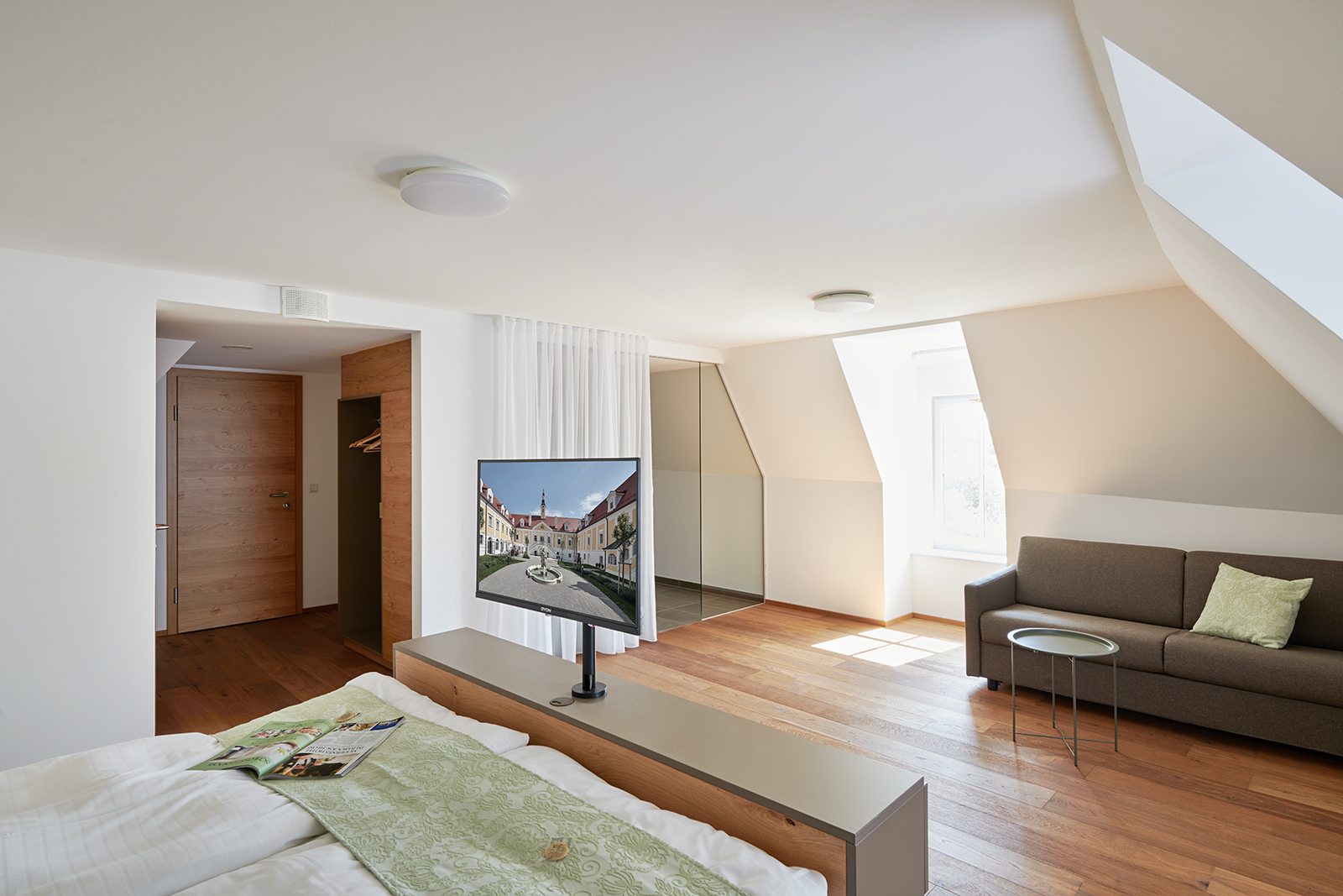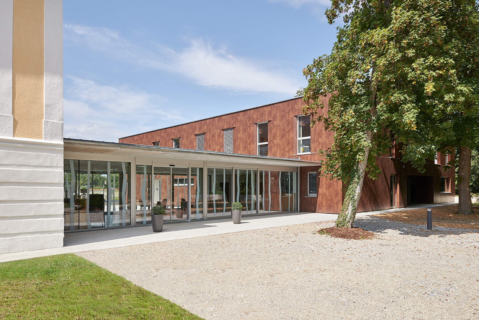 Zusätzliche 18 Zimmer für – je nach Bedarf und Saison – Lehrlinge, Seminarpublikum oder Urlauber entstanden im Obergeschoss des zweigeschossigen Zubaus im Norden. Sie sind um ein Atrium angeordnet, das durch ein großzügiges Oberlicht viel Tageslicht erhält und das so auch ein attraktiver Ort des Aufenthalts und der Begegnung ist. Im Erdgeschoss befinden sich Aufenthaltsräume, ein Fitnessstudio und auch eine großzügige WC-Anlage. Sie ist nützlich bei Veranstaltungen im Schlosspark, wie zum Beispiel das jährlich im Sommer stattfindende Operettenfestival. Eine Verkleidung aus braunen Platten bindet den anstelle des ehemaligen Minigolfplatzes errichteten Kubus in das Grün des Parks ein.