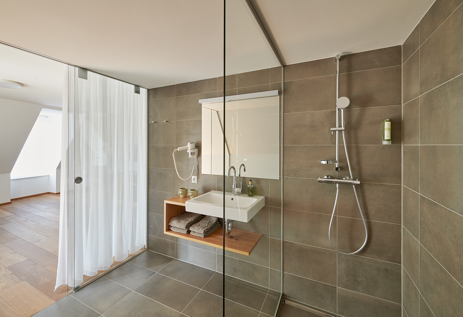 Der eingeschossige verglaste Gang zwischen Schloss und Zubau ist mehr als nur ein Verbindungsbau, sondern auch Schnittstelle und Angelpunkt zwischen den verschiedenen Funktionen.
