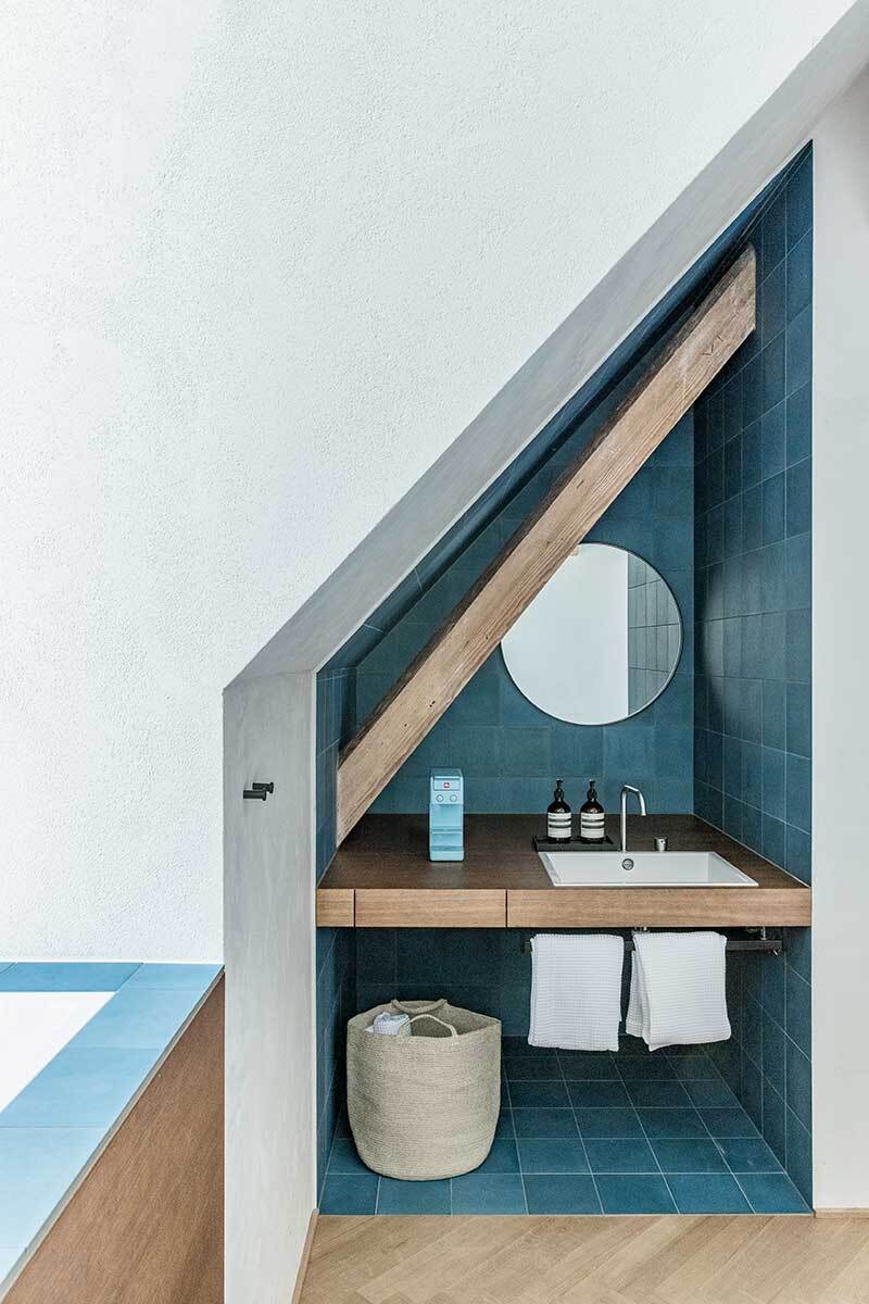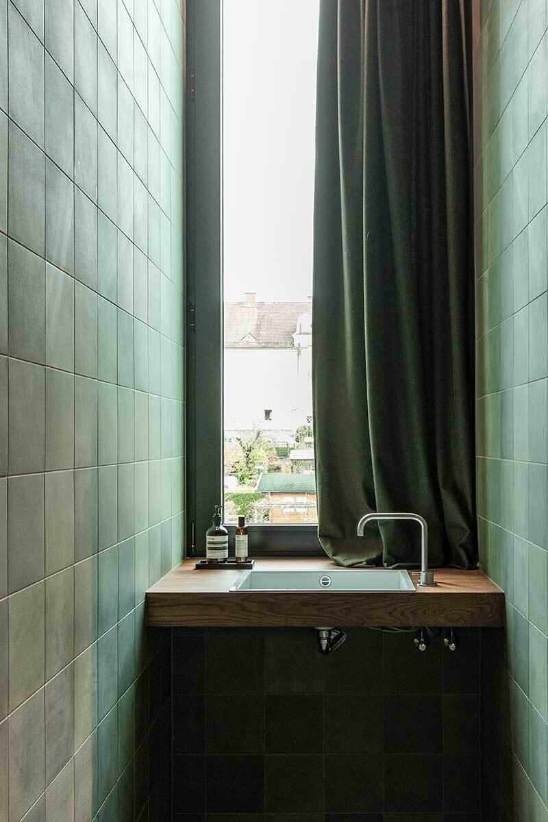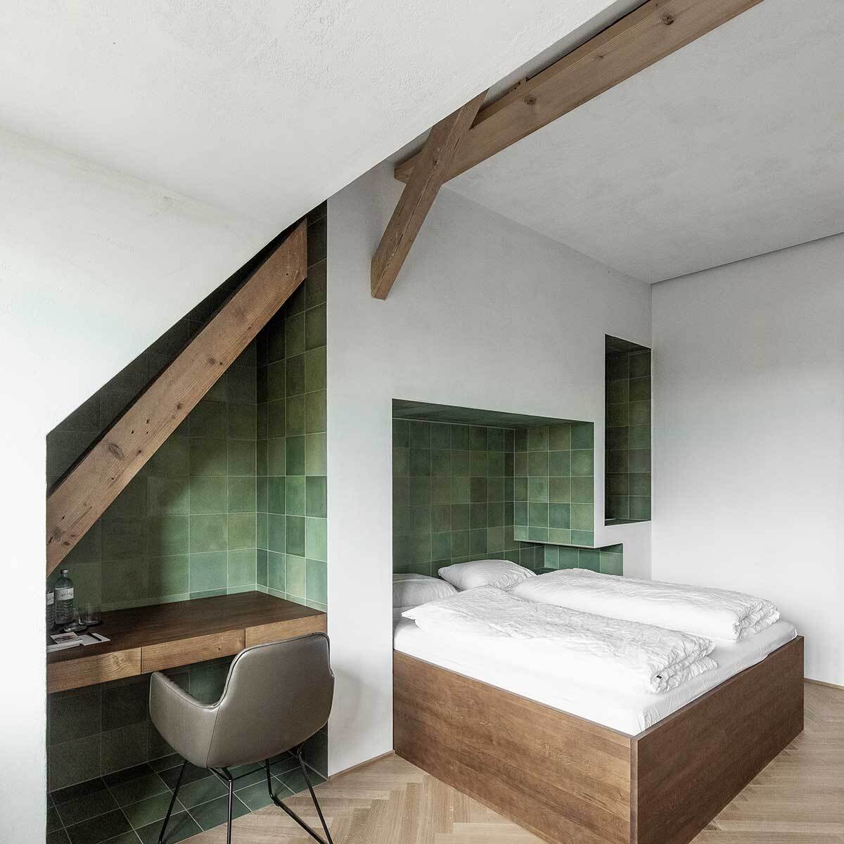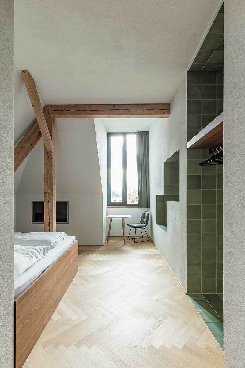 Oberhalb des Steyrwerke-Plateaus gelegen, geht der Blick vom Haus aus über das alte Fabriksareal hinweg zur Altstadt, auf der anderen Seite ins Grün der Damberghänge. Ins Dach sind nun schwarze Blechkuben als Pendant zu historischen Gaupen gesteckt – alle in unterschiedlicher Dimension. Sie sind eine praktische Raumerweiterung und führen an unterschiedlichen Stellen Licht in die Hotelzimmer, die vor allem dadurch atmosphärische Einzigartigkeit entfalten. Das Grundprinzip ist immer gleich: Schmale Räume erweitern sich in Nischen, die mit Fliesen blaue und grüne Farbakzente setzen und somit typische Muster in den Wänden ergeben. Sie werden zu Kofferablage, Garderobe, Dusche, Schreibtisch, Nachtkästchen oder zum Kopfende des Eichenbettes, das darin eingeschoben erscheint. Die Gaupen nehmen Waschtische oder Badewannen am Fenster auf. Wertige Materialien prägen die Zimmer mit Haptik und Duft: Strukturputz, Zementfliesen und Eichenholz, das am Boden als Parkett im Fischgrätmuster verlegt ist.