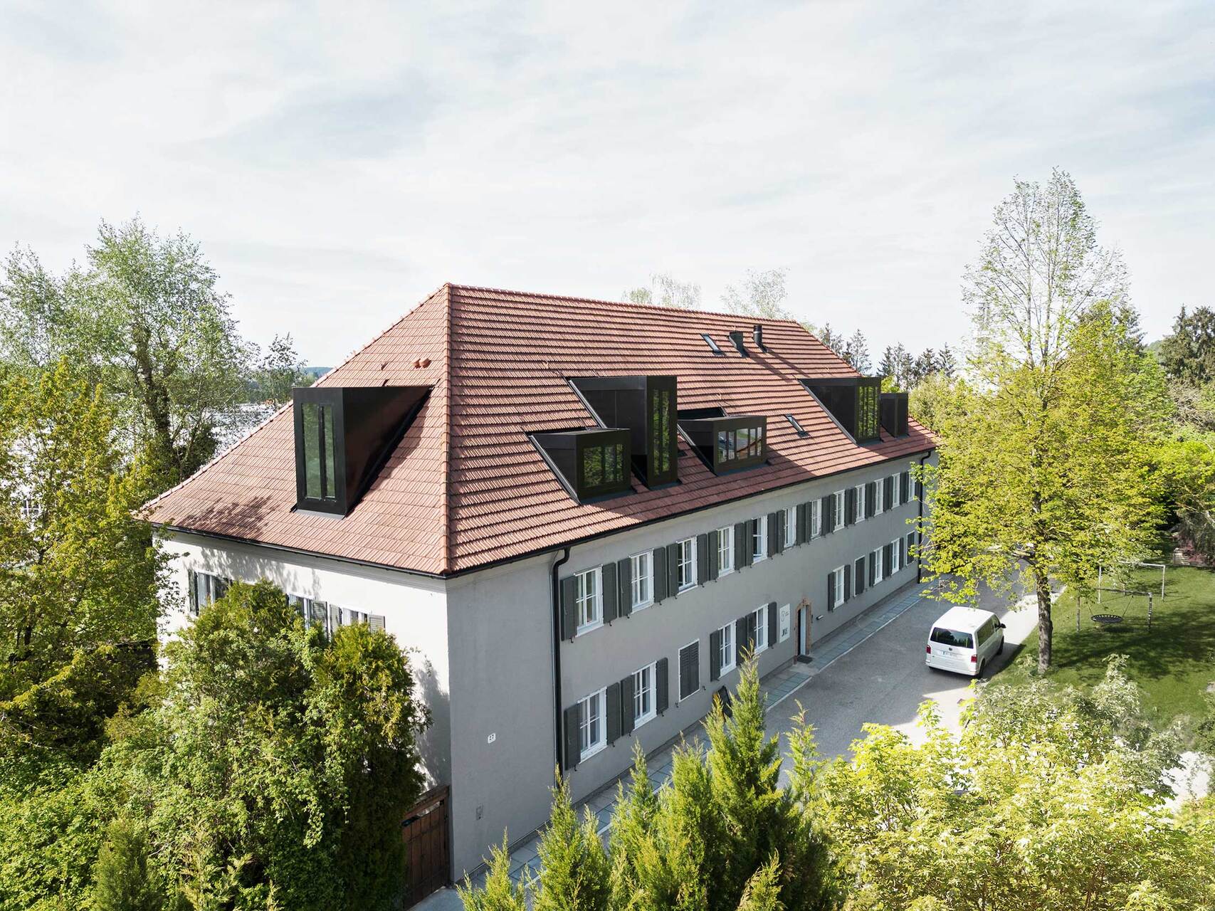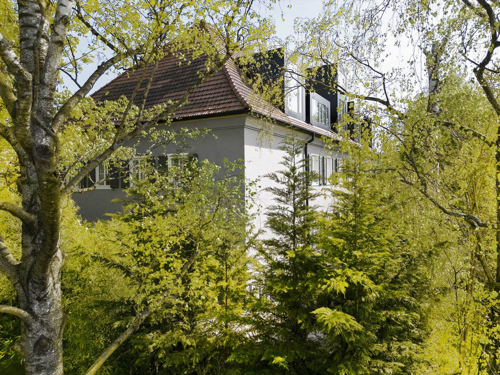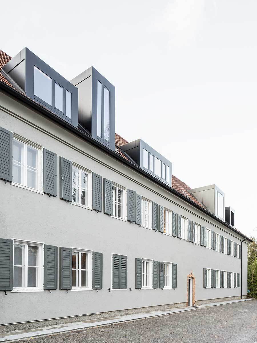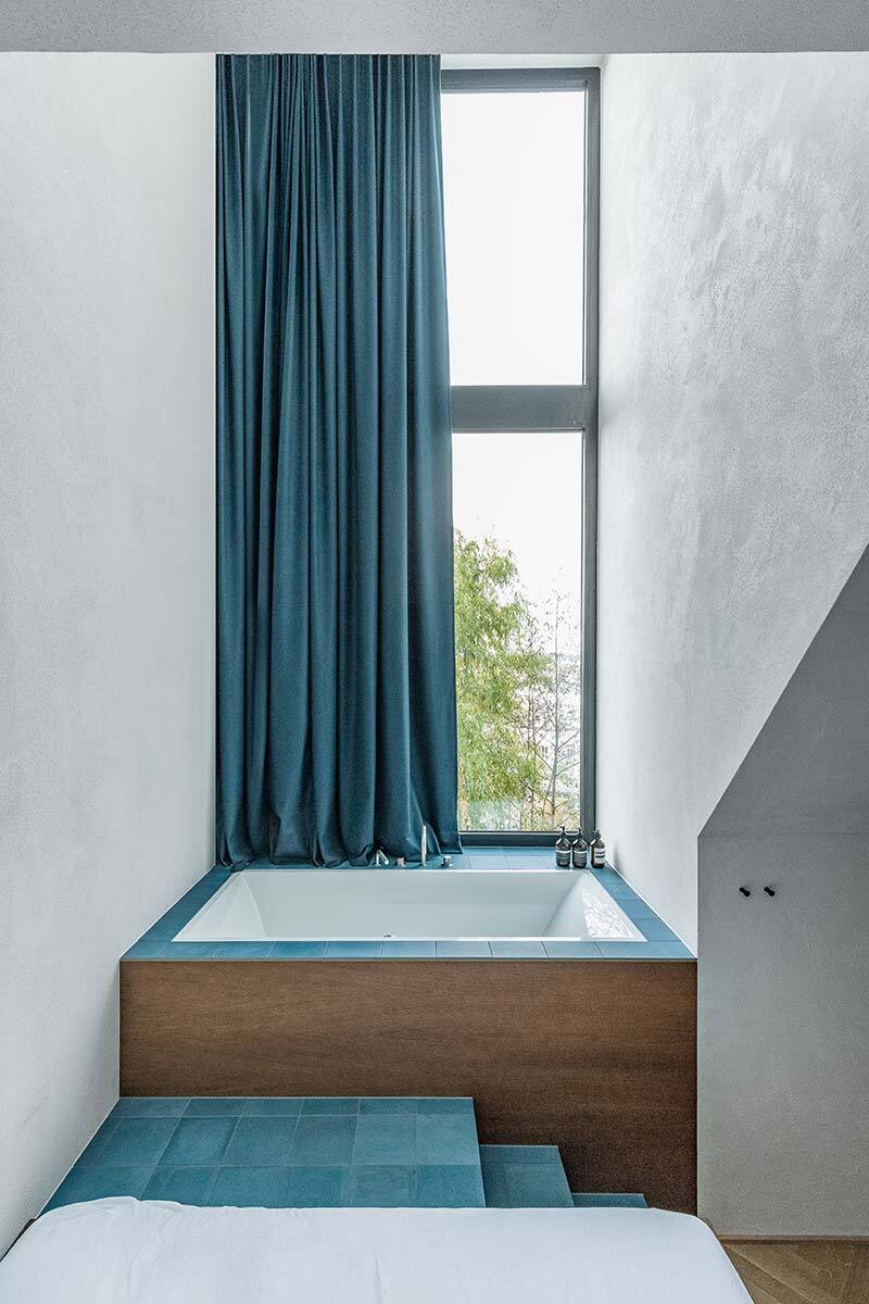 Oberhalb des Steyrwerke-Plateaus gelegen, geht der Blick vom Haus aus über das alte Fabriksareal hinweg zur Altstadt, auf der anderen Seite ins Grün der Damberghänge. Ins Dach sind nun schwarze Blechkuben als Pendant zu historischen Gaupen gesteckt – alle in unterschiedlicher Dimension. Sie sind eine praktische Raumerweiterung und führen an unterschiedlichen Stellen Licht in die Hotelzimmer, die vor allem dadurch atmosphärische Einzigartigkeit entfalten. Das Grundprinzip ist immer gleich: Schmale Räume erweitern sich in Nischen, die mit Fliesen blaue und grüne Farbakzente setzen und somit typische Muster in den Wänden ergeben. Sie werden zu Kofferablage, Garderobe, Dusche, Schreibtisch, Nachtkästchen oder zum Kopfende des Eichenbettes, das darin eingeschoben erscheint. Die Gaupen nehmen Waschtische oder Badewannen am Fenster auf. Wertige Materialien prägen die Zimmer mit Haptik und Duft: Strukturputz, Zementfliesen und Eichenholz, das am Boden als Parkett im Fischgrätmuster verlegt ist.