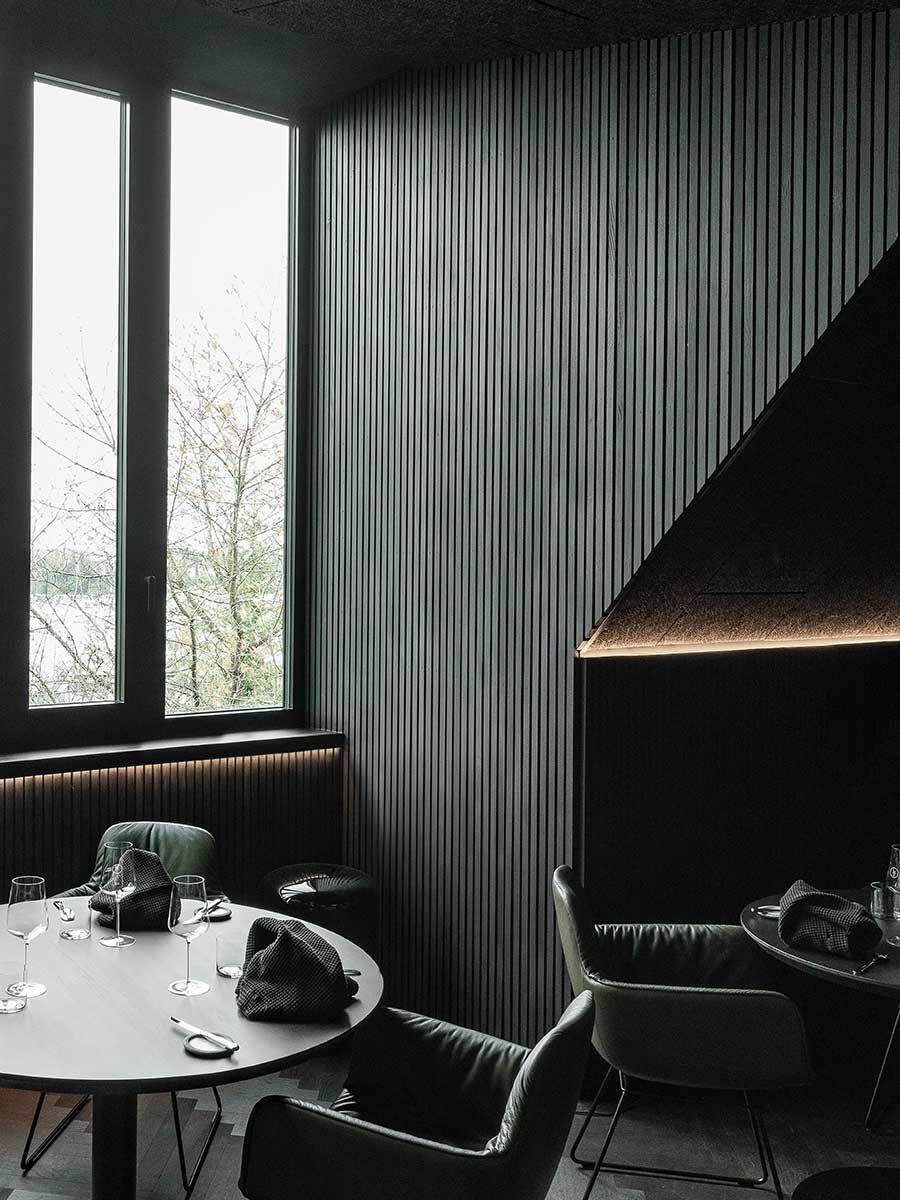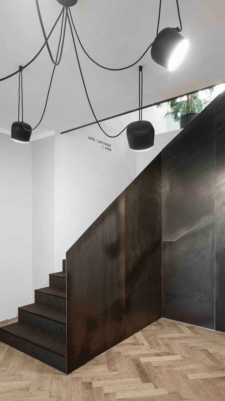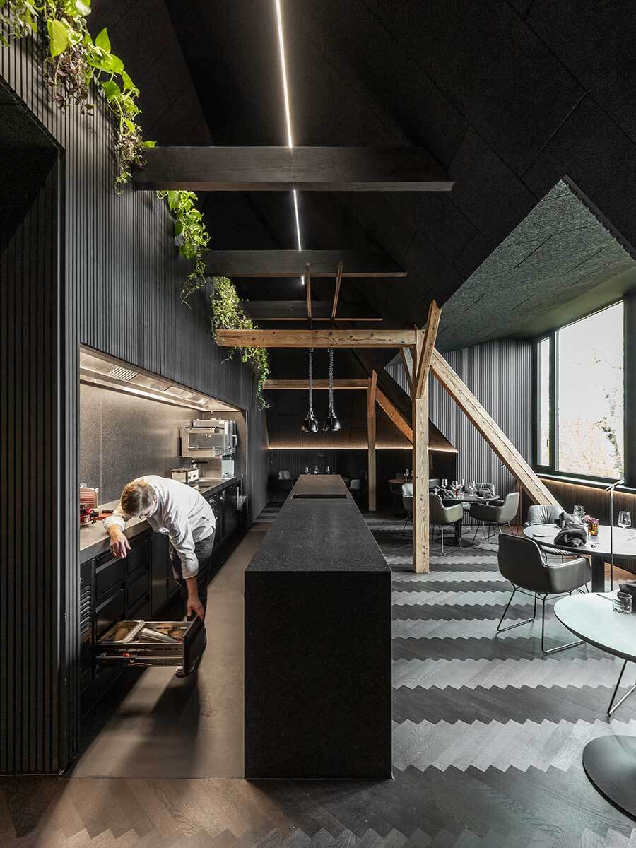 Am Ende der nach oben verlängerten Holztreppe befindet sich die Rezeption. Von hier aus gibt es einen Blick über ein kleines Atrium bis zum Eingang im Erdgeschoss. Auf der einen Seite liegt der Korridor zu den Zimmern, auf der anderen öffnet sich das Restaurant, das vorwiegend ein großer Dachbodenraum geblieben ist – in edle Oberflächen gekleidet, die den Klang im Raum dämpfen und für entspannte Stimmung sorgen. Die Farbe Schwarz wirkt als Hintergrund für leuchtende, farbintensive Auftritte der Kulinarik. Gekocht und angerichtet wird mitten im Raum, der offenen Theke entlang sind die Esstische verteilt. Gegenüber der Küche sitzt die größte Gaupe des Hauses, mit weitem Ausblick über die Stadt. Ein Kubus gleich nach dem Eingang nimmt die Garderobe für ankommende Gäste, Weinschrank und Kassa in sich auf und ist zugleich Vorzone für Hinterküche und Sanitärräume. (Text: Architekten, bearbeitet)