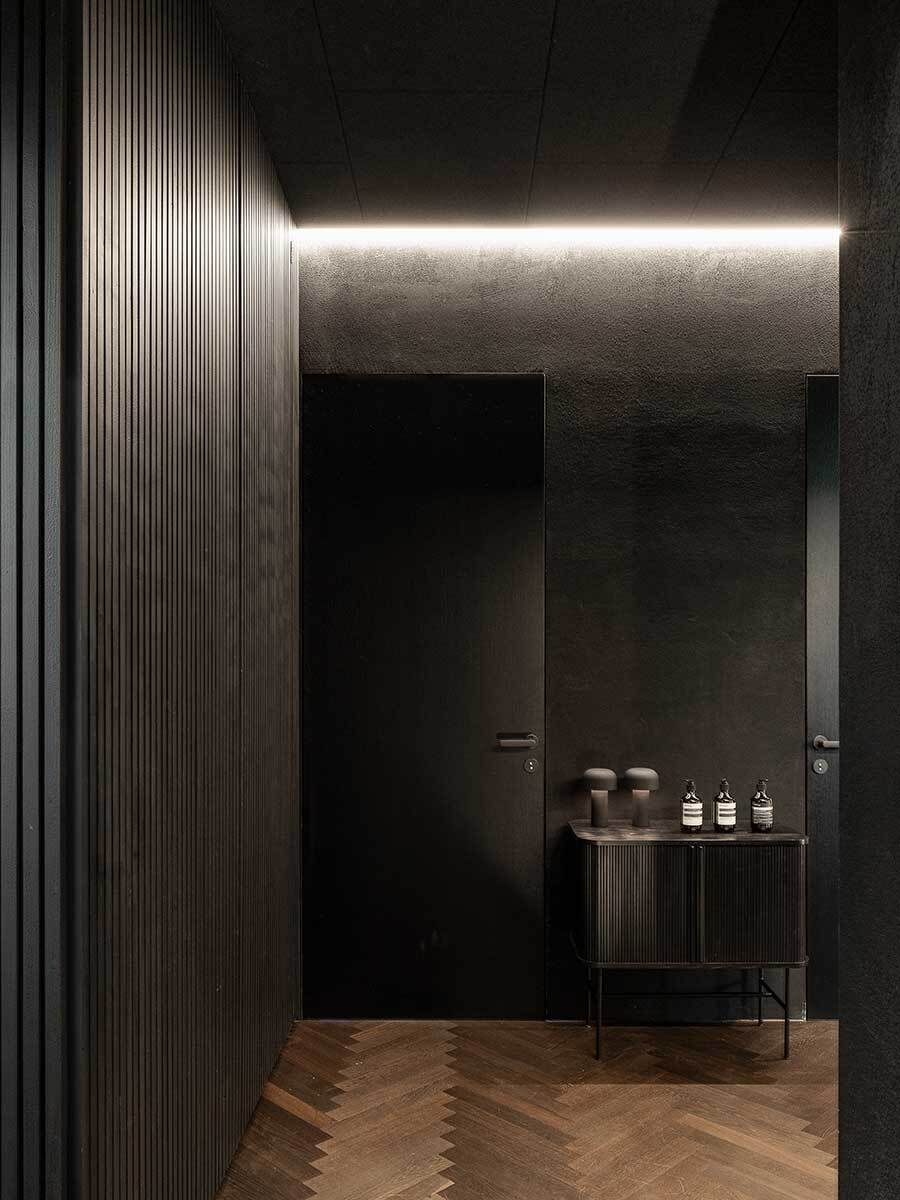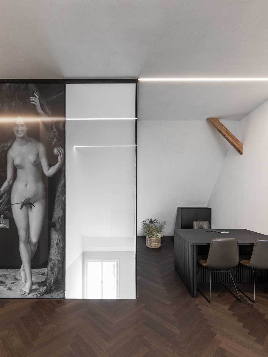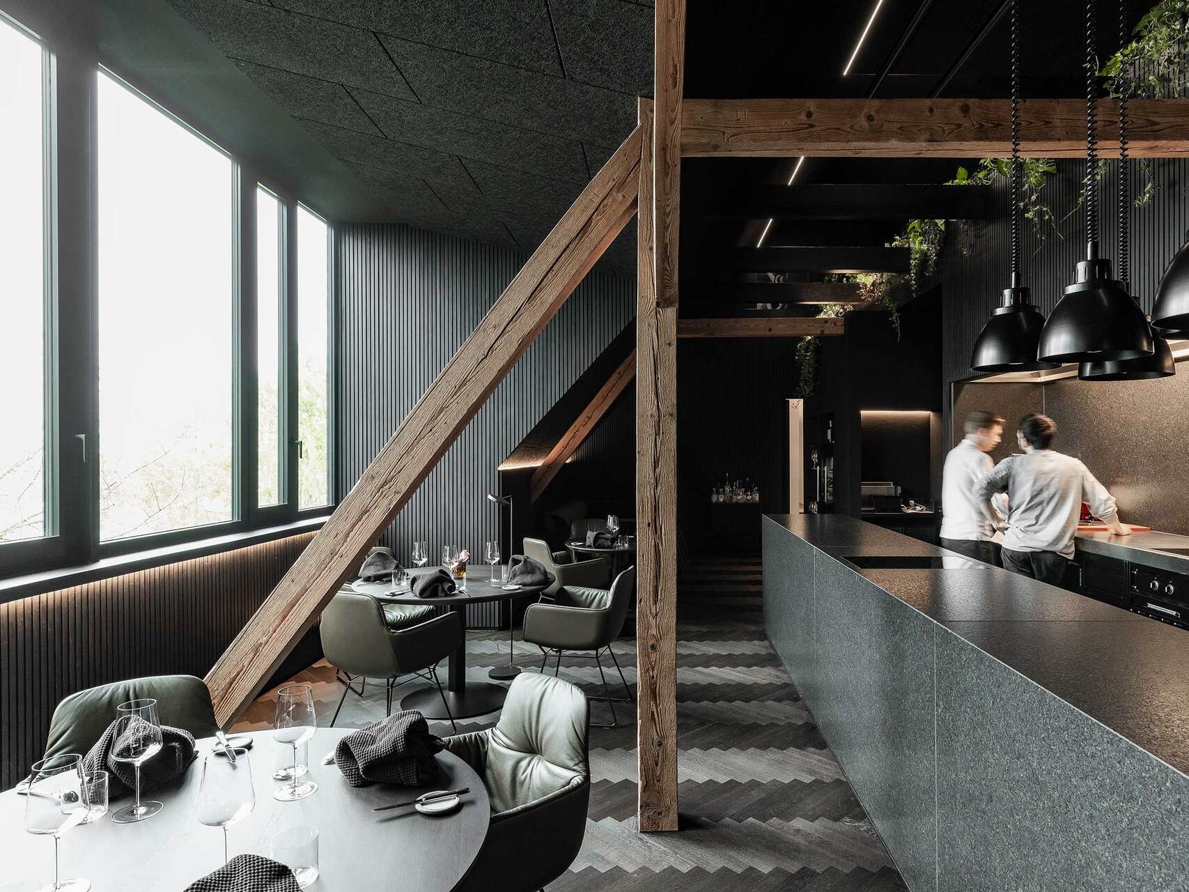 Am Ende der nach oben verlängerten Holztreppe befindet sich die Rezeption. Von hier aus gibt es einen Blick über ein kleines Atrium bis zum Eingang im Erdgeschoss. Auf der einen Seite liegt der Korridor zu den Zimmern, auf der anderen öffnet sich das Restaurant, das vorwiegend ein großer Dachbodenraum geblieben ist – in edle Oberflächen gekleidet, die den Klang im Raum dämpfen und für entspannte Stimmung sorgen. Die Farbe Schwarz wirkt als Hintergrund für leuchtende, farbintensive Auftritte der Kulinarik. Gekocht und angerichtet wird mitten im Raum, der offenen Theke entlang sind die Esstische verteilt. Gegenüber der Küche sitzt die größte Gaupe des Hauses, mit weitem Ausblick über die Stadt. Ein Kubus gleich nach dem Eingang nimmt die Garderobe für ankommende Gäste, Weinschrank und Kassa in sich auf und ist zugleich Vorzone für Hinterküche und Sanitärräume. (Text: Architekten, bearbeitet)