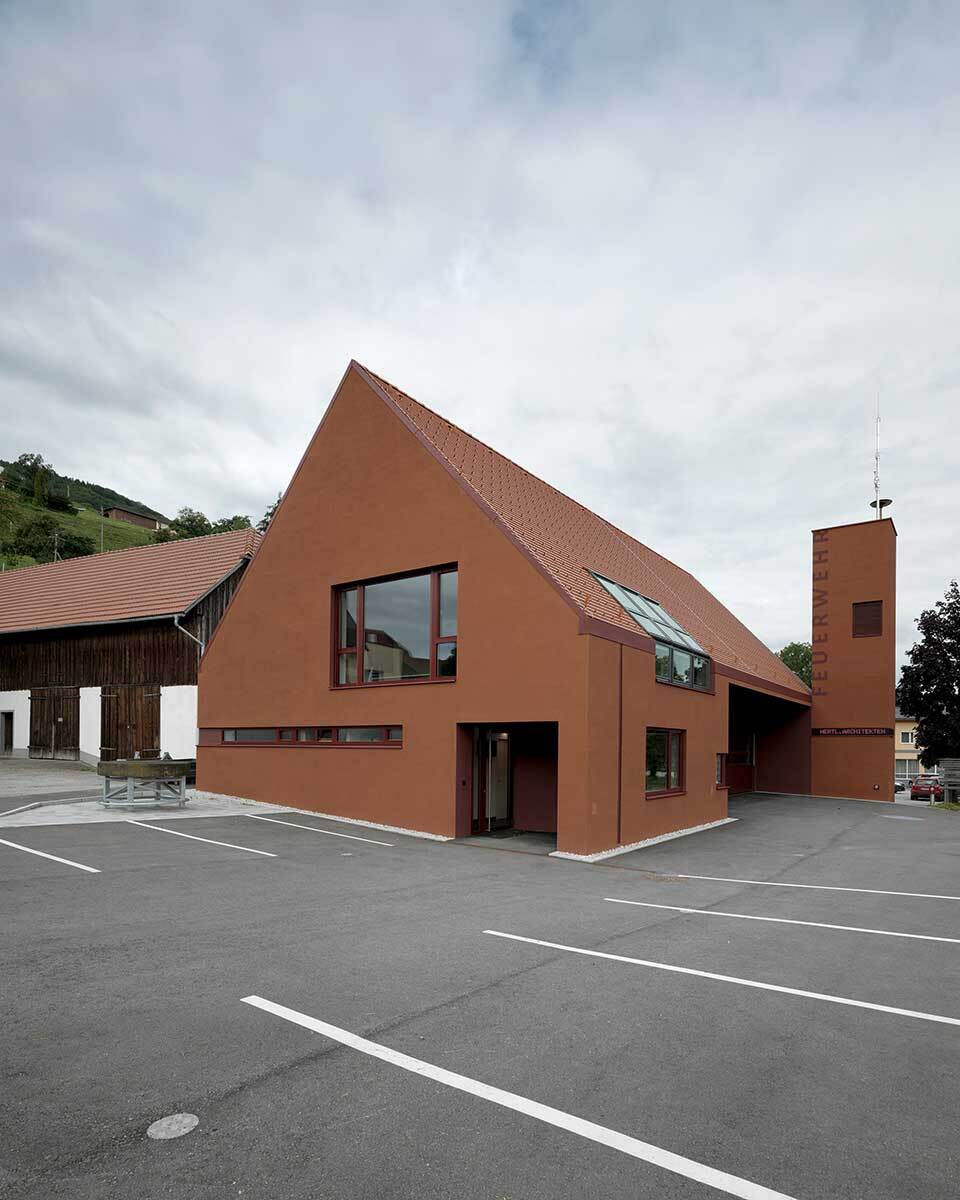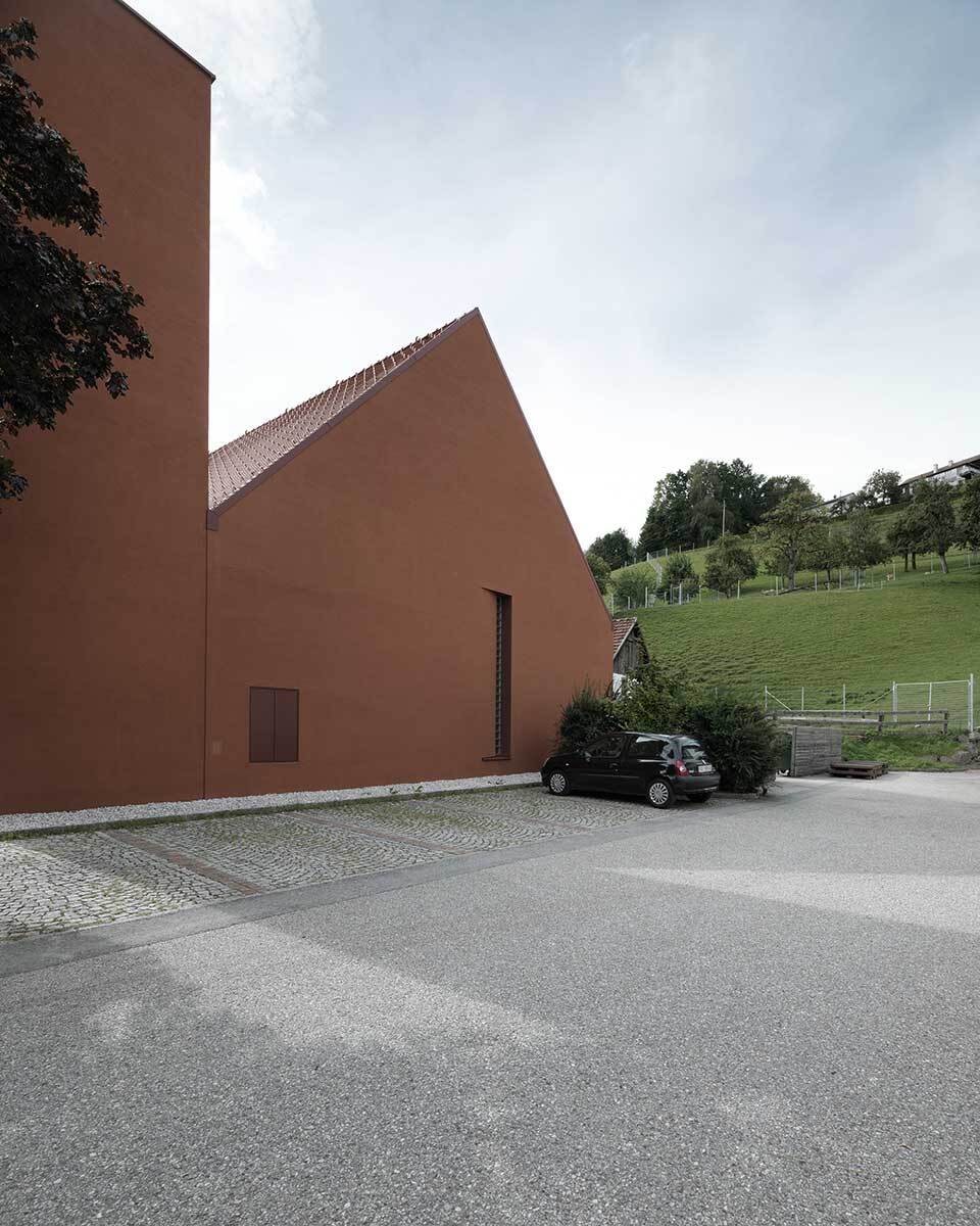 Tonziegel auf dem Dach und Kammputz auf den massiven Mauern färben das Haus lehmrot. Die einheitliche Erscheinung unterstreicht die skulpturale Wirkung des Zeughauses, das sich bodenständig im Dorf verankert. (Text: Architekt:innen, bearbeitet)
