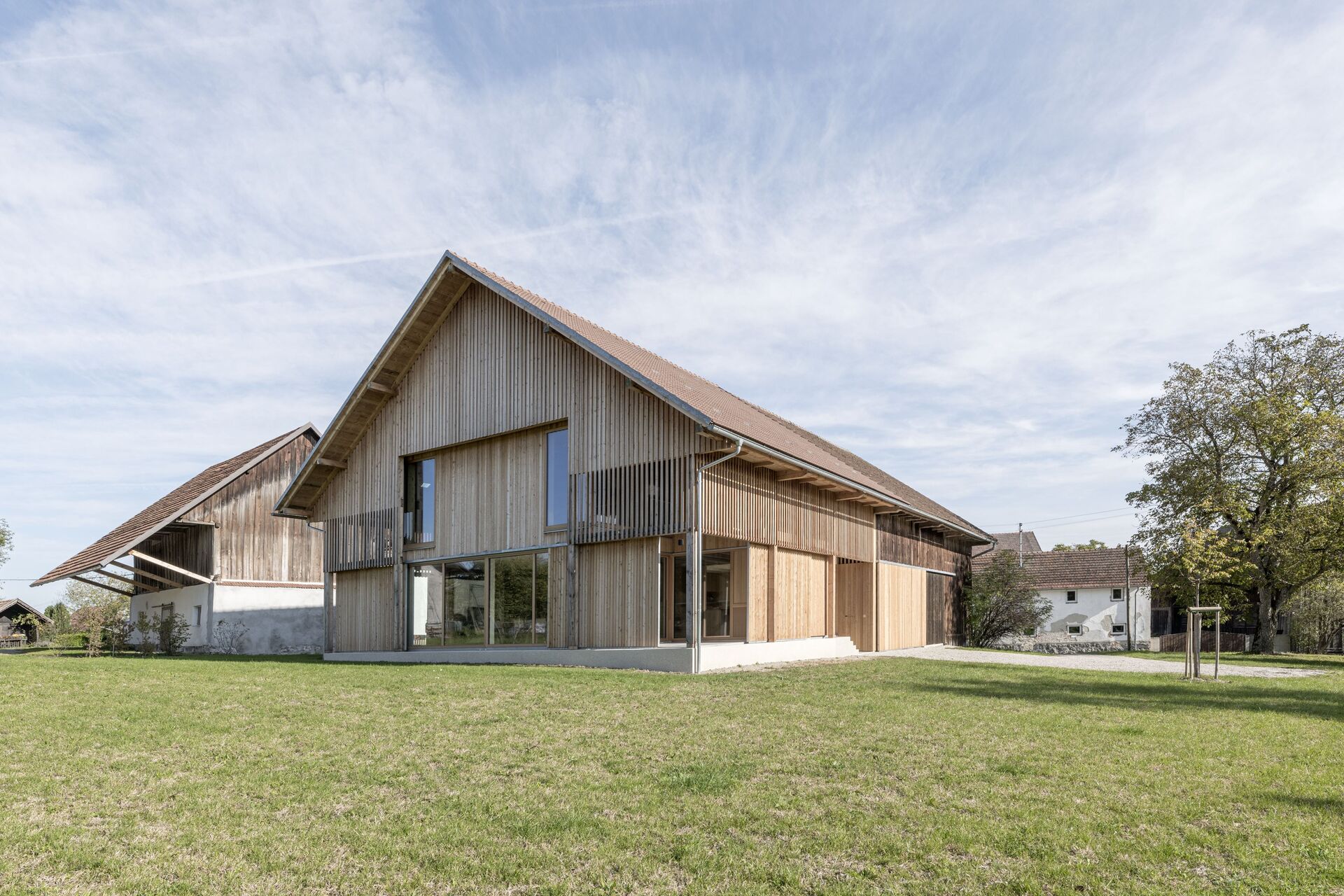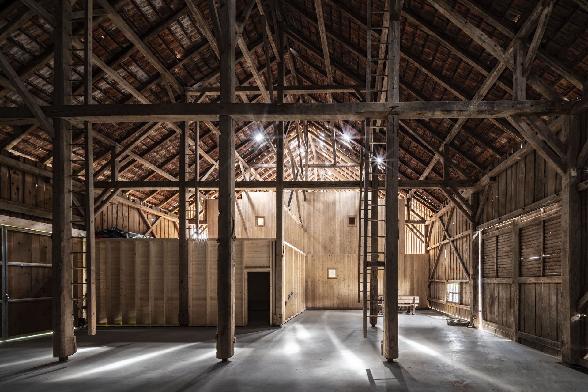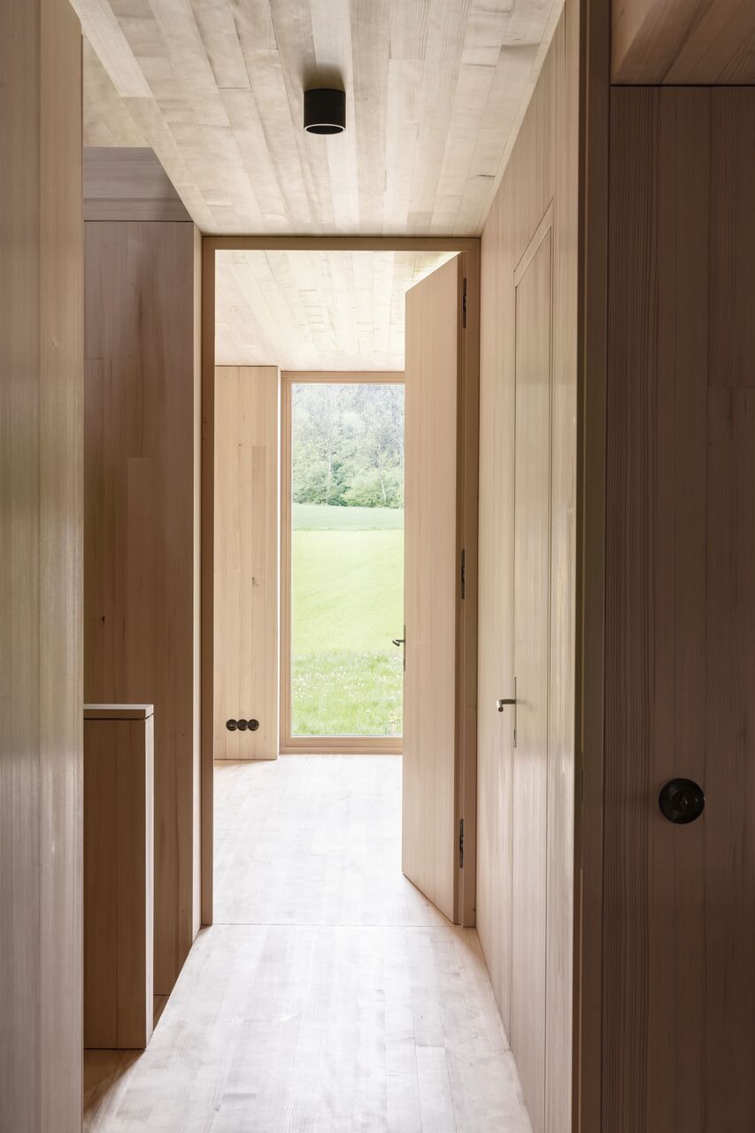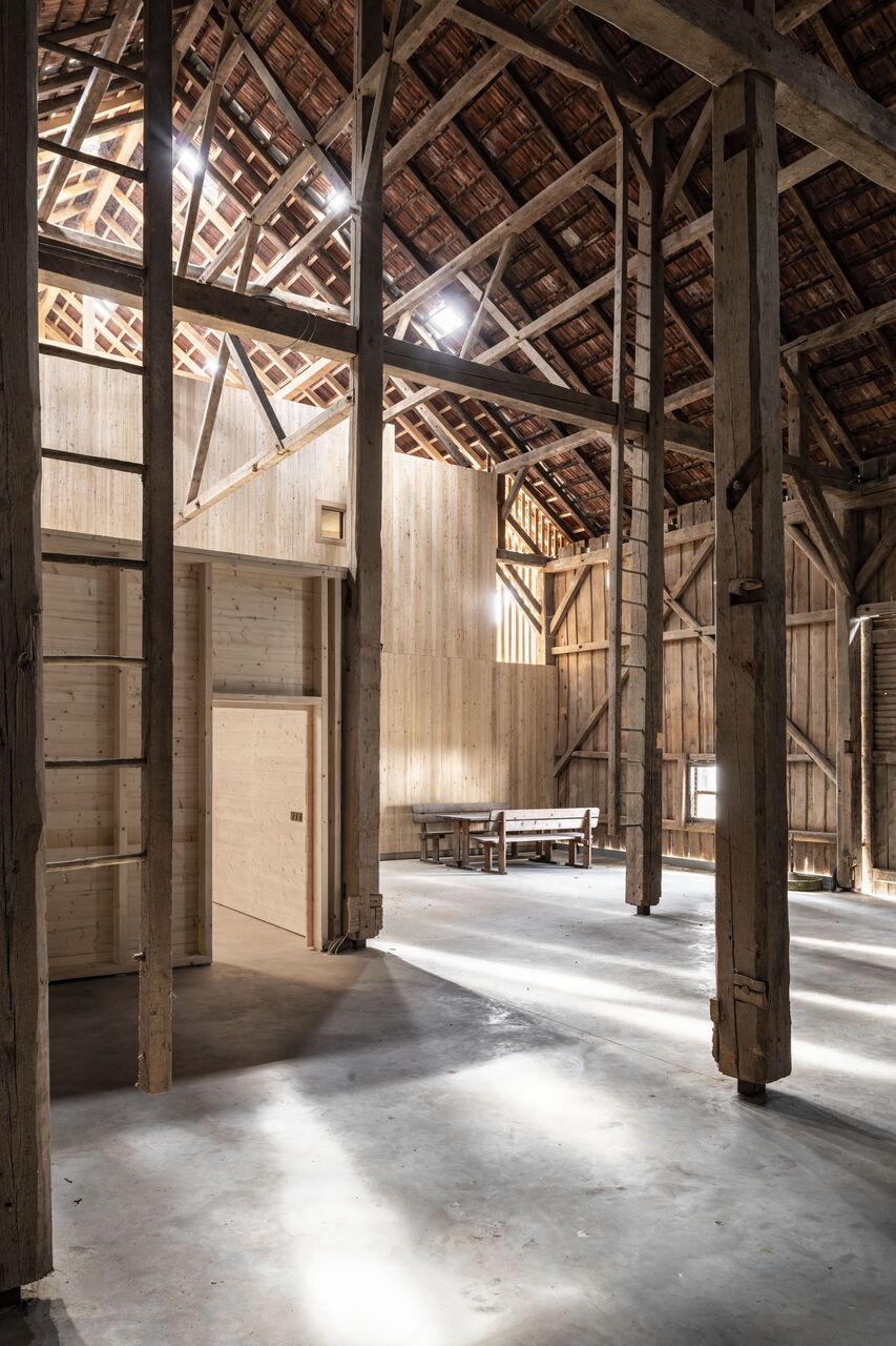 Im Obergeschoss sind die Privaträume untergebracht, räumlich abgestuft und ins Dachvolumen zurückversetzt. Blickbeziehungen ins Dachgebälk und in die Landschaft vermitteln räumliche Verortung und Orientierung. Transparente Dachziegel bringen punktuell Tageslicht in die Scheune ein, das über Dachflächenfenster ins Haus weitergeleitet wird. Der Holzbau ist aus einfachem Schnittholz und mit sägerauer Diagonalschalung ausgeführt. Sowohl bei der Konstruktion als auch beim Innenausbau galt bauökologische Qualität als oberste Prämisse. Alle Wände wurden mit feinjährigem Tannenholz ausgetäfert. Die reduzierte, aber sehr sorgfältige handwerkliche Ausstattung der Räume vermittelt Gediegenheit und zeitlosen Gestaltungsanspruch. Wie selbstverständlich fügt sich die Scheune ins Hofensemble und in die umgebende Landschaft. (Text: Tobias Hagleitner, nach einem Text der Architekt:innen)