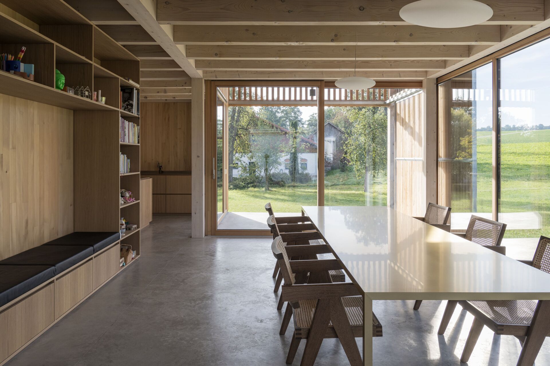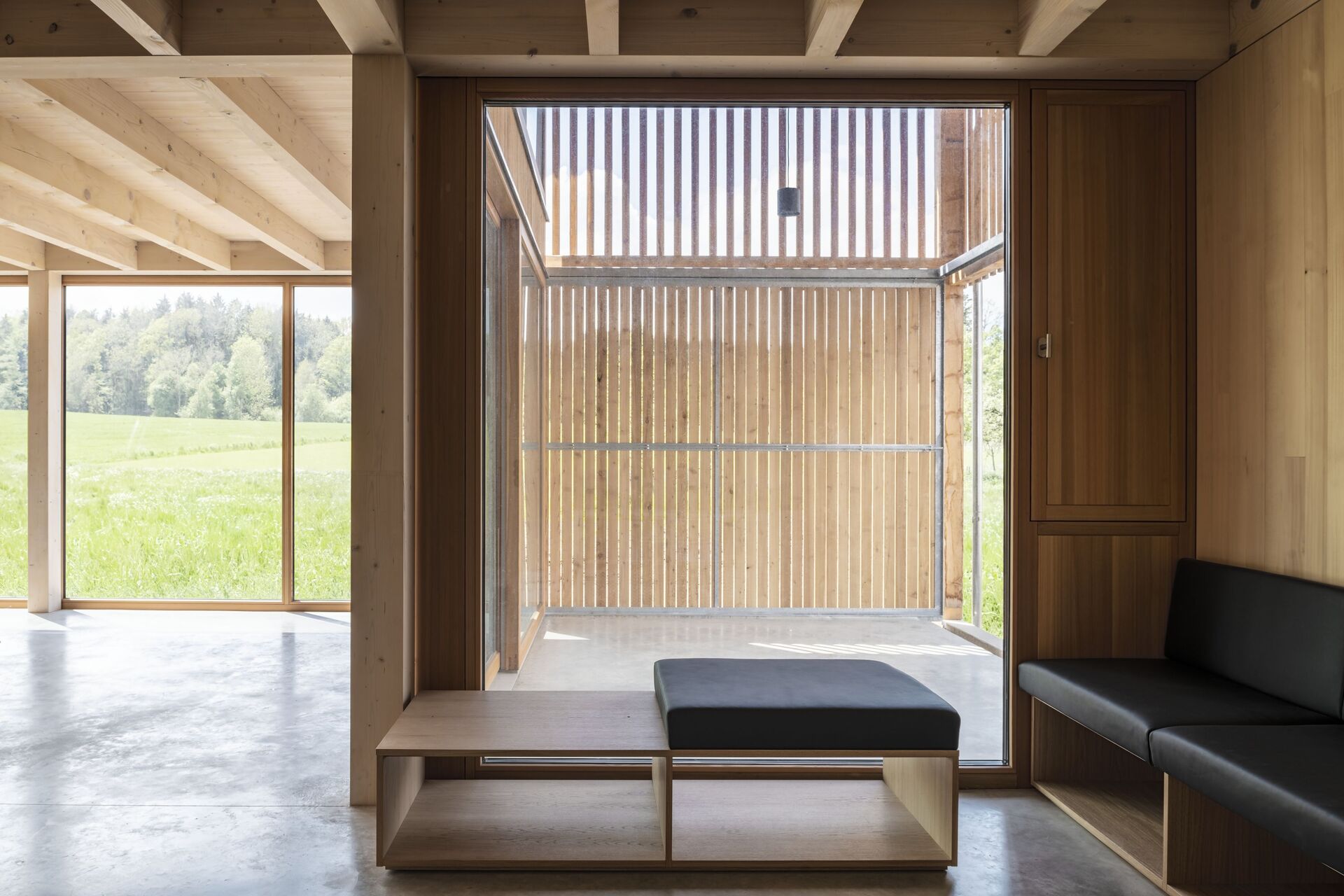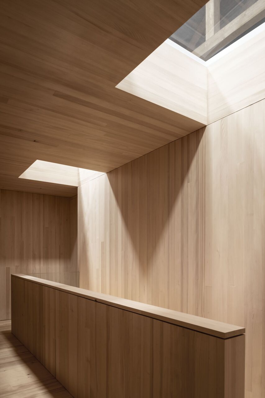 Im Obergeschoss sind die Privaträume untergebracht, räumlich abgestuft und ins Dachvolumen zurückversetzt. Blickbeziehungen ins Dachgebälk und in die Landschaft vermitteln räumliche Verortung und Orientierung. Transparente Dachziegel bringen punktuell Tageslicht in die Scheune ein, das über Dachflächenfenster ins Haus weitergeleitet wird. Der Holzbau ist aus einfachem Schnittholz und mit sägerauer Diagonalschalung ausgeführt. Sowohl bei der Konstruktion als auch beim Innenausbau galt bauökologische Qualität als oberste Prämisse. Alle Wände wurden mit feinjährigem Tannenholz ausgetäfert. Die reduzierte, aber sehr sorgfältige handwerkliche Ausstattung der Räume vermittelt Gediegenheit und zeitlosen Gestaltungsanspruch. Wie selbstverständlich fügt sich die Scheune ins Hofensemble und in die umgebende Landschaft. (Text: Tobias Hagleitner, nach einem Text der Architekt:innen)