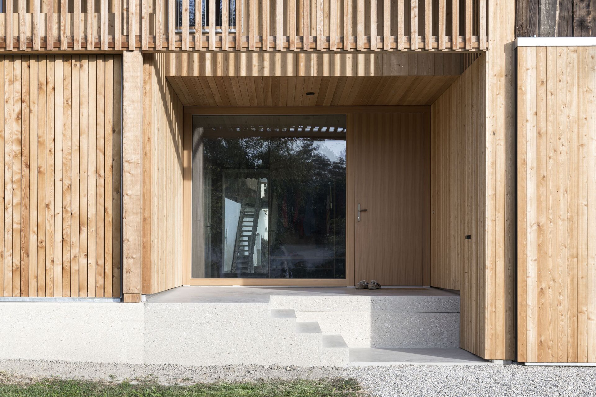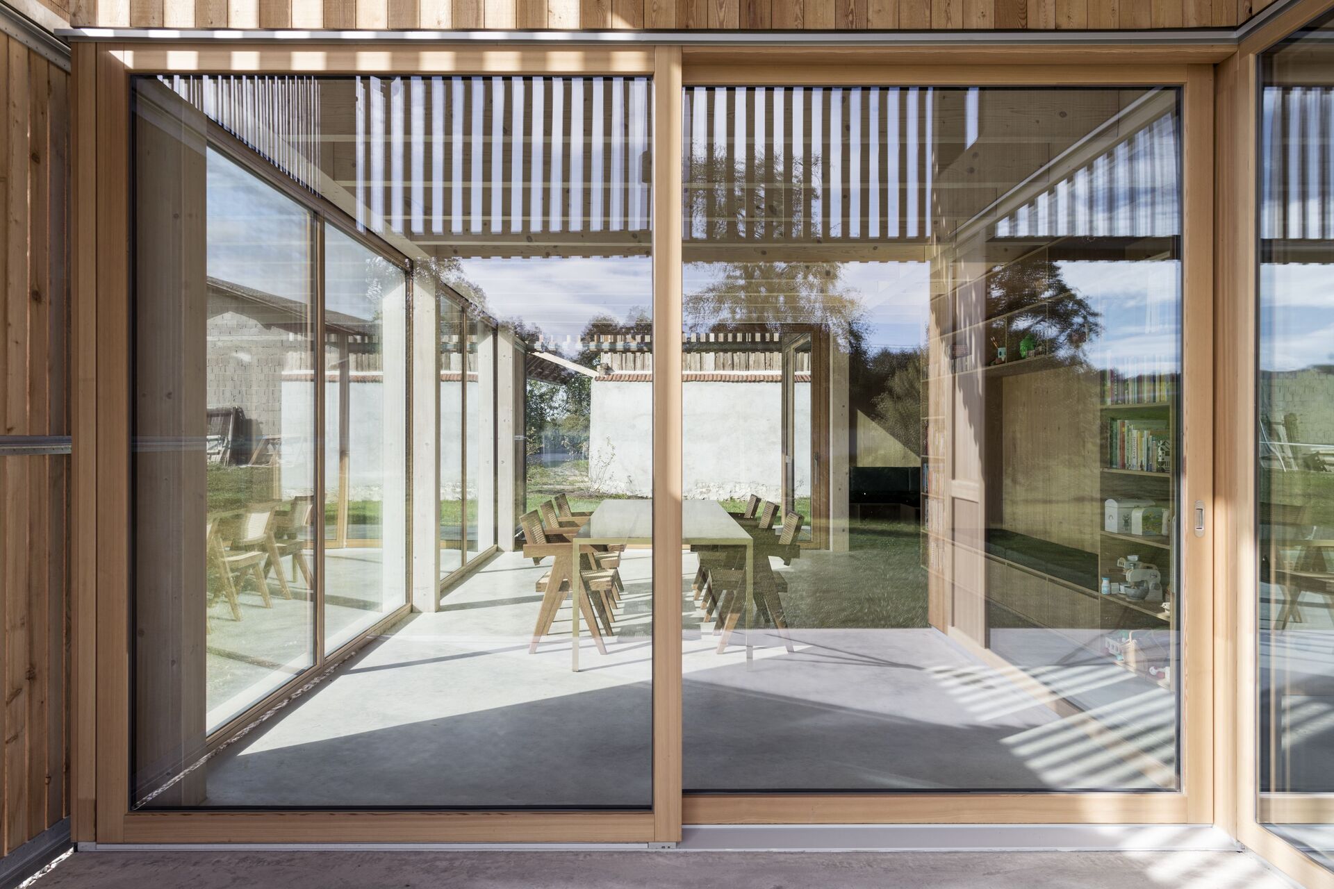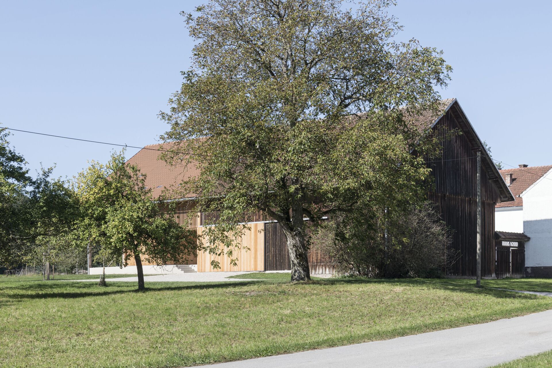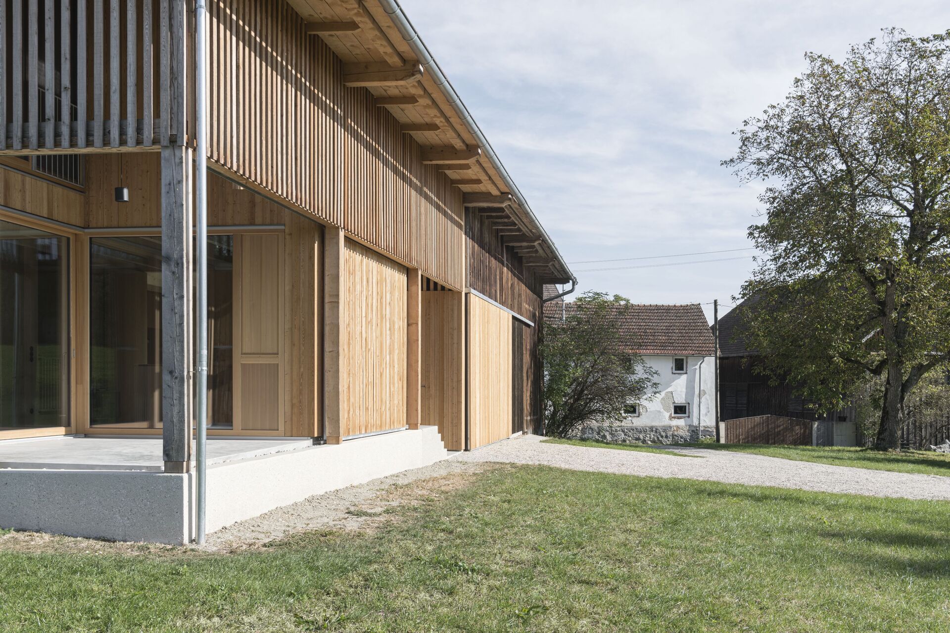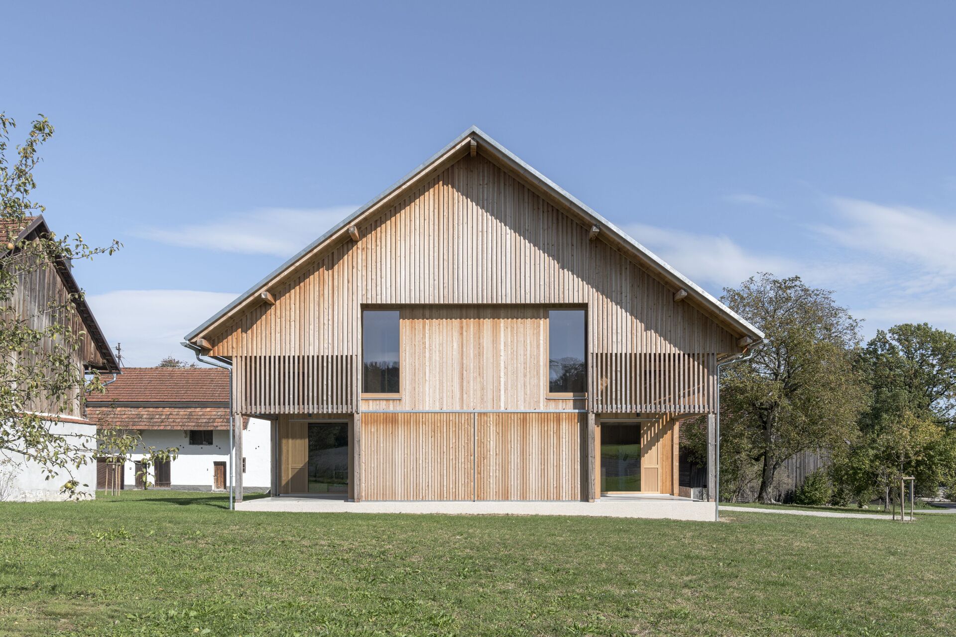 Klare Baukörper um einen gemeinschaftlichen Hof bilden nun ein stimmiges Ensemble. Drei Generationen wohnen wieder gemeinsam am Hof. Zugleich konnte der Anteil an versiegelter Bestandsfläche reduziert werden. Der Holzstadel auf der Südseite wurde entkernt, die Stallerweiterung rückgebaut. Der Holzwurm hatte im Lauf der Zeit das Gebälk geschwächt, Tragsicherheit war nicht mehr gewährleistet. Wo erforderlich, wurde die Konstruktion erneuert. Respektvoll wurde in diese Struktur ein Holzbau für Wohnzwecke eingefügt, der den Rhythmus der Stützen und Balken des Bestands übernimmt – eine offene Raumabfolge im Erdgeschoss, symmetrisch eingeschrieben in den Stadel, dazwischen geborgene Außenräume, die vielfältige Nutzung zulassen. Schiebetore schützen die gefassten Bereiche bei Bedarf vor Wind und Wetter oder sie beschatten an heißen Sonnentagen den Innenraum.