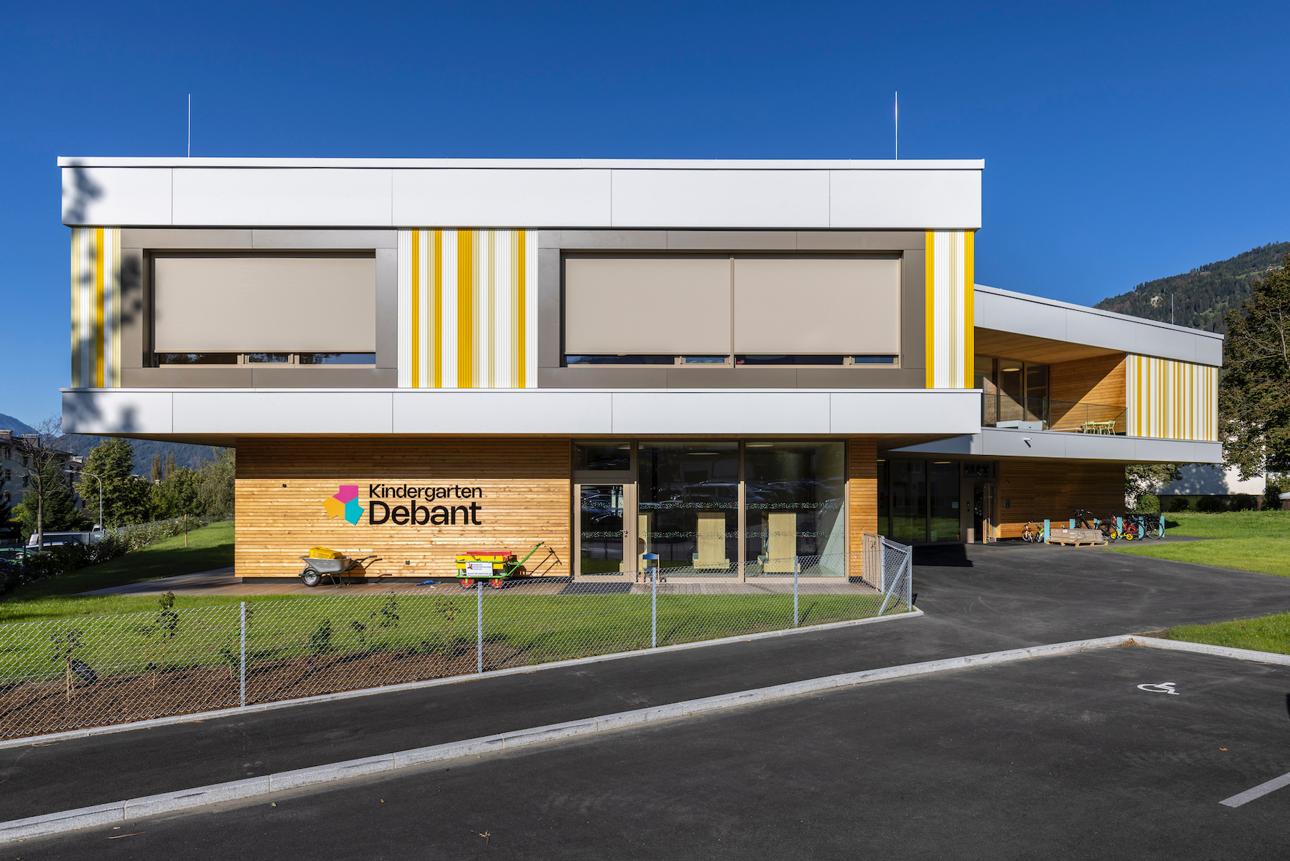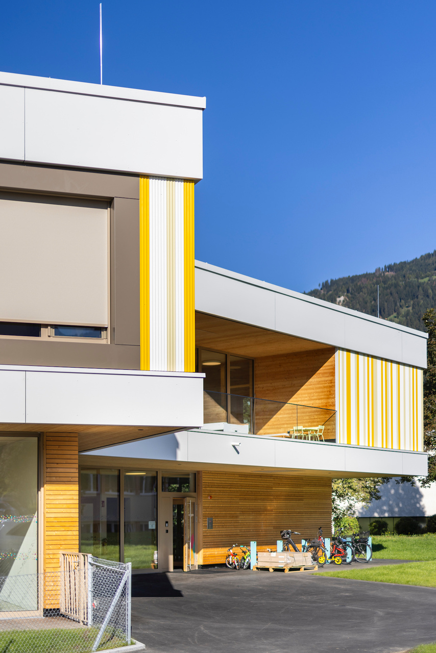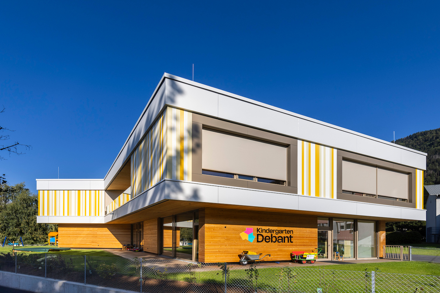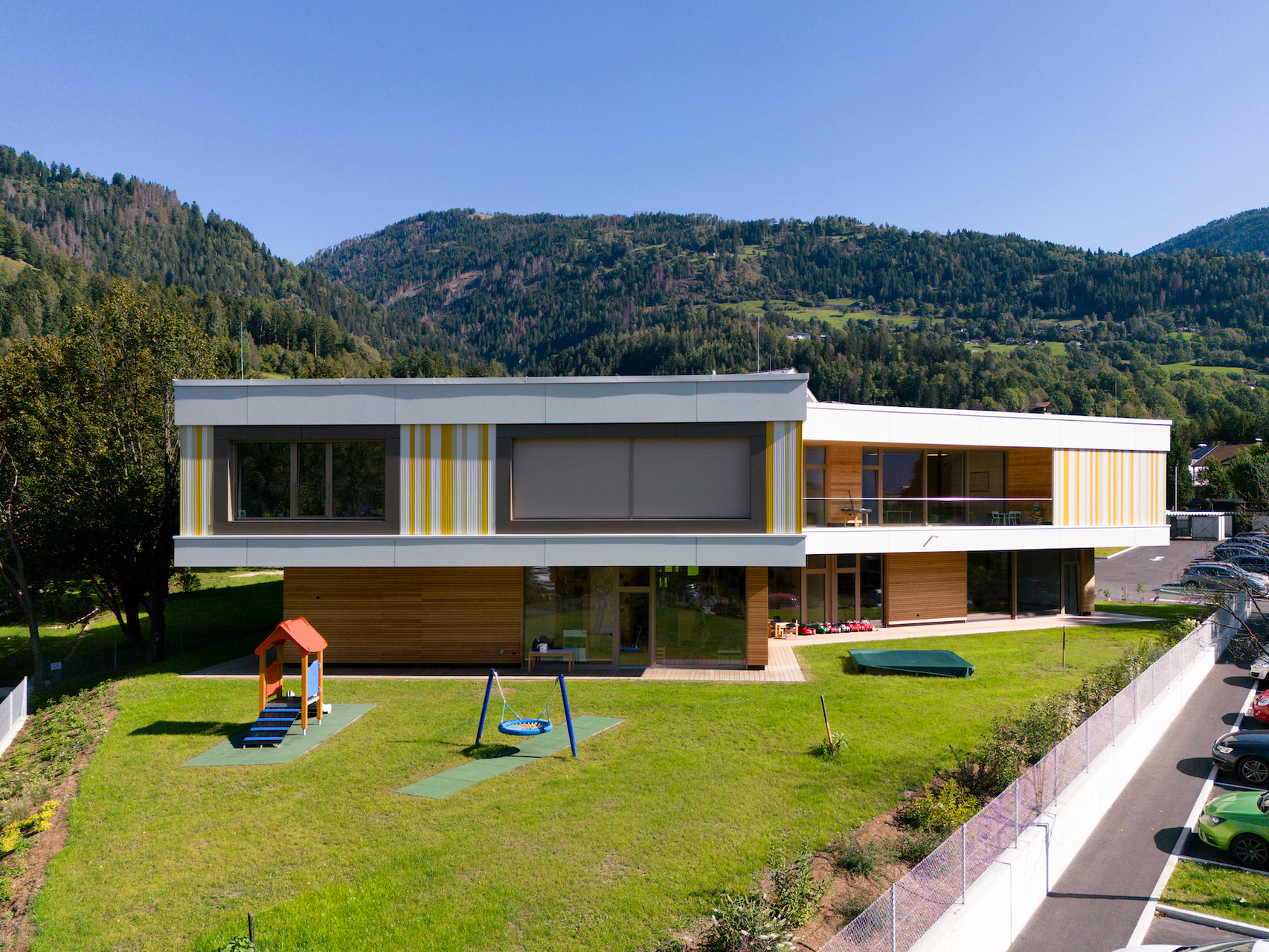 Der flächenmäßig größere 4-gruppige Kindergarten befindet sich im allseitig auskragenden Obergeschoß, das so auch vor den Krippenräumen geschützte Terrassen und überdachte Eingänge bildet. Den beiden Kindergarten-Clustenr sind große, witterungsgeschützte Loggien zugeordnet, wodurch jeder Gruppen- und Teilungsraum einen direkten Außenbezug erhält. Den modernen pädagogischen Anforderungen folgend entstand eine Lernlandschaft in kindgerechten Dimensionen, in der sich Nischen, unterschiedlich große Räume, enge und weite Durch- und Einblicke abwechseln und fließend in die zentralen Kommunikationsflächen für Spiel und Bewegung übergehen. (Text: Claudia Wedekind, nach einem Text der Architekten)