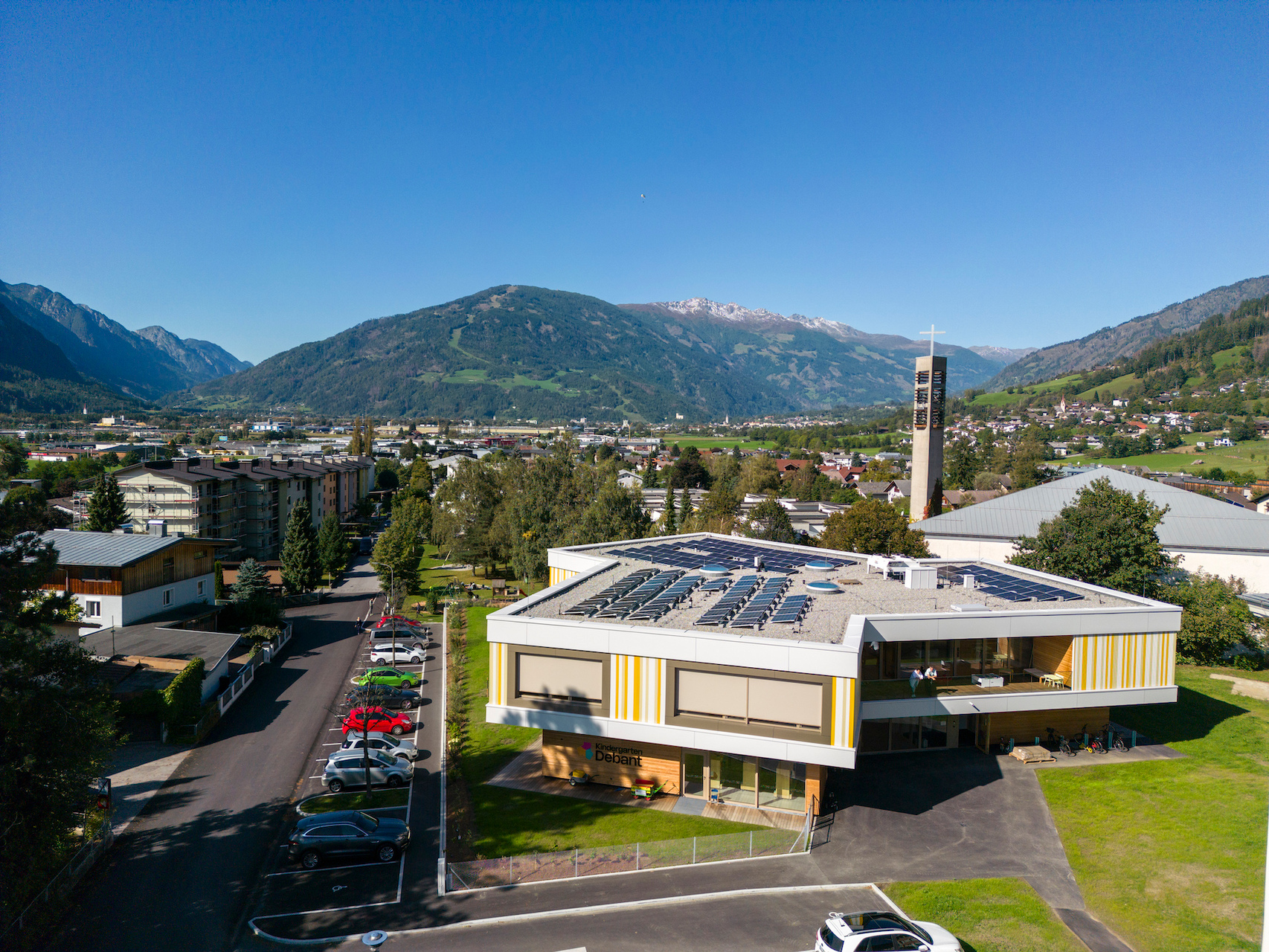 Das aus einem Wettbewerb hervorgegangene Projekt reagiert auf diese herausfordernde städtebauliche Situation mit einem sternförmig konzipierten, im südlichen Grundstücksteil errichteten Baukörper. Dieser wurde so in das Baufeld gesetzt, dass im Zusammenspiel mit den Bestandsgebäuden gut proportionierte und differenziert nutzbare Außenräume entstehen. Die Struktur aus drei, windradartig angeordneten Flügeln ermöglichte es einerseits, das Volumen kleinteilig aufzulösen und die Kantenlängen an die dorfräumlich üblichen anzupassen. Andererseits wird im Inneren durch das Aufbrechen der orthogonalen Anordnung der Funktionsbereiche ein optimal nutzbares Zentrum (Marktplatz) geschaffen und eine gute Belichtung sämtlicher Flächen gewährleistet.