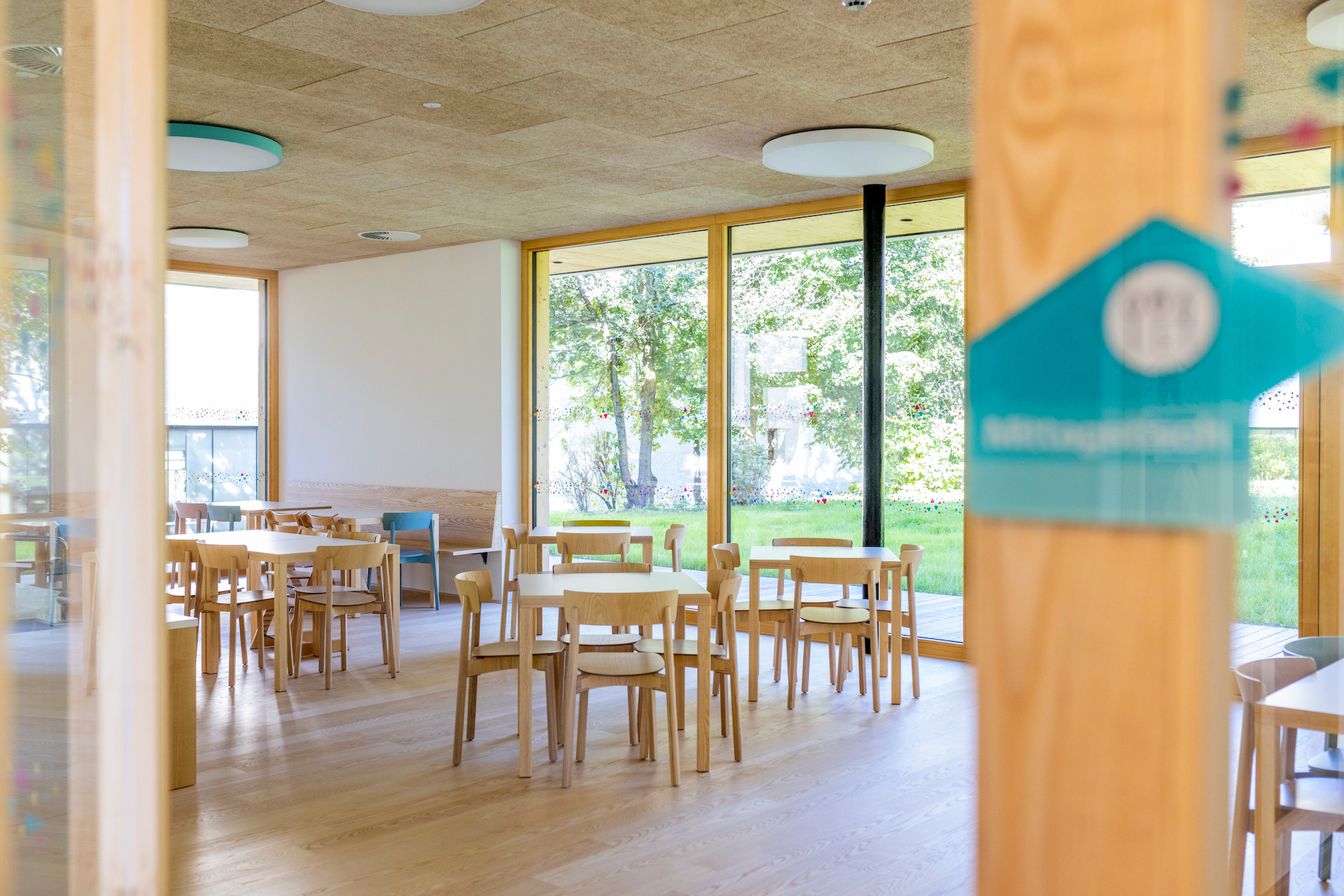 Im Erdgeschoß liegen die Räume der Kinderkrippe, die zentrale Garderobe sowie der Mittagstisch, der auch von der Schule mitgenutzt wird. Nach der Idee eines transparenten Pavillons im Grünen gestaltet, bietet dieser Bereich eine hohe Aufenthaltsqualität, die sich deutlich von der in Unterrichtsräumen vorherrschenden Atmosphäre unterscheidet und somit auch räumlich eine Abwechslung im Tagesablauf darstellt.