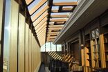 Der Innenraum des Domcenters mit seinem Café, Info- und Shop-Point wird durch einen langen Tresen definiert, der die Besucher:innen zu den verschiedenen Funktionen leitet. Das Domcenter kann auch als Versammlungsraum und Treffpunkt für kirchliche und nichtkirchliche Veranstaltungen genutzt werden. Der gesamte neue Raumbereich unter dem auskragenden Baldachindach und der ehemalige Ausspracheraum sind unterkellert. Dort sind ein Technikraum, Toiletten, Spinde und Lagerflächen untergebracht. Diese Räume werden durch eine Treppe und einen Lift erschlossen. Der Lift verbindet barrierefrei alle drei Ebenen — Kirchenebene, Platzebene und Keller — und ermöglicht ein Zuschalten von verschiedenen Aktivitäten im und um den Dom.
