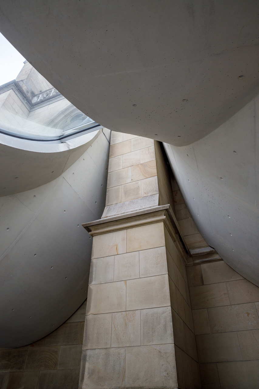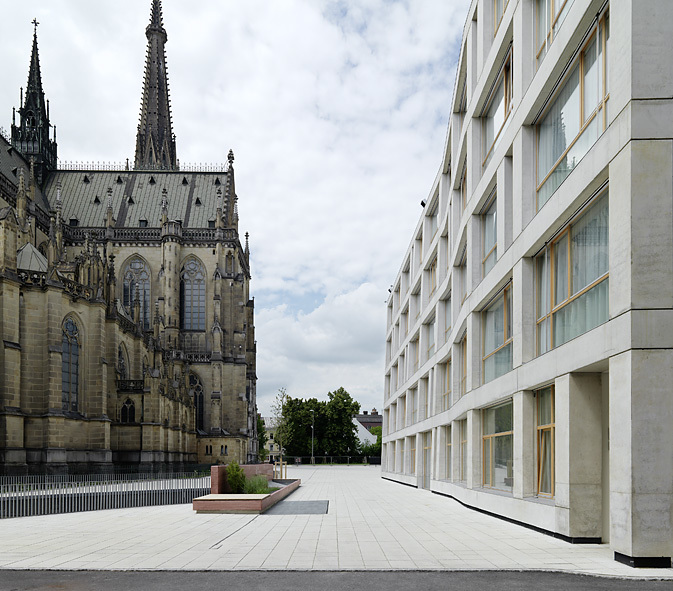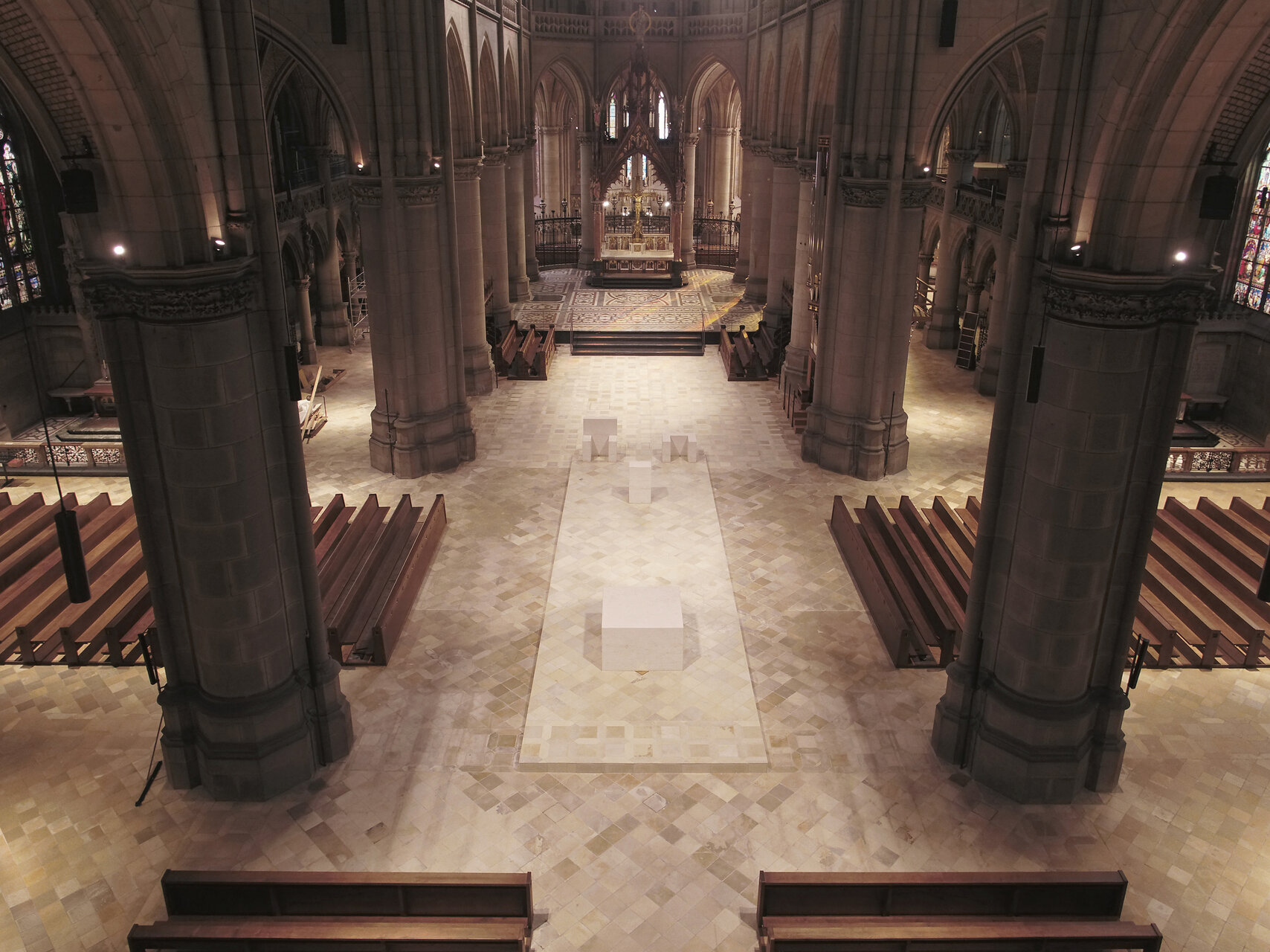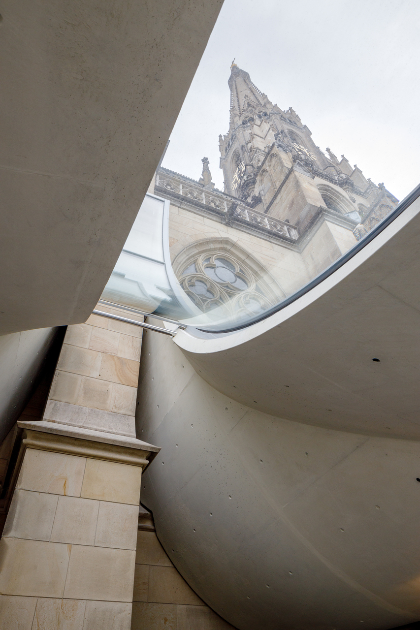Im Kirchenraum selbst werden einzelne Kunstwerke durch multimediale Angebote präsentiert. In der linken Turmkapelle sind einige besonders wertvolle Objekte des Domschatzes ausgestellt. Entlang einer zweigeschossigen, begehbaren Ausstellungsarchitektur werden diese wertvollen Kunstgegenstände in analoger und digitaler Form präsentiert. Eine interaktive Vitrine und ein integrierter Lift, der die Besucher:innen auf die Fensterebene der ehemaligen Kapelle hebt, bieten neue Einblicke in historische kirchliche Kunst. Den Grundriss des Ausstellungsturms bildet eine Platte in Form des Einsteinmusters. Die Grundform des „Einsteins“ kann lückenlos ohne starre Wiederholungen zusammengefügt werden. Dieses Motiv findet sich in allen Ausstellungsvitrinen innerhalb des Mariendoms und auch im neuen Domcenter wieder. (Text: Architekt:innen, bearbeitet)