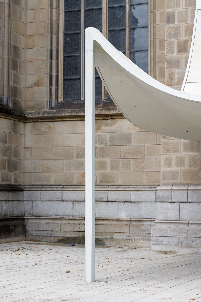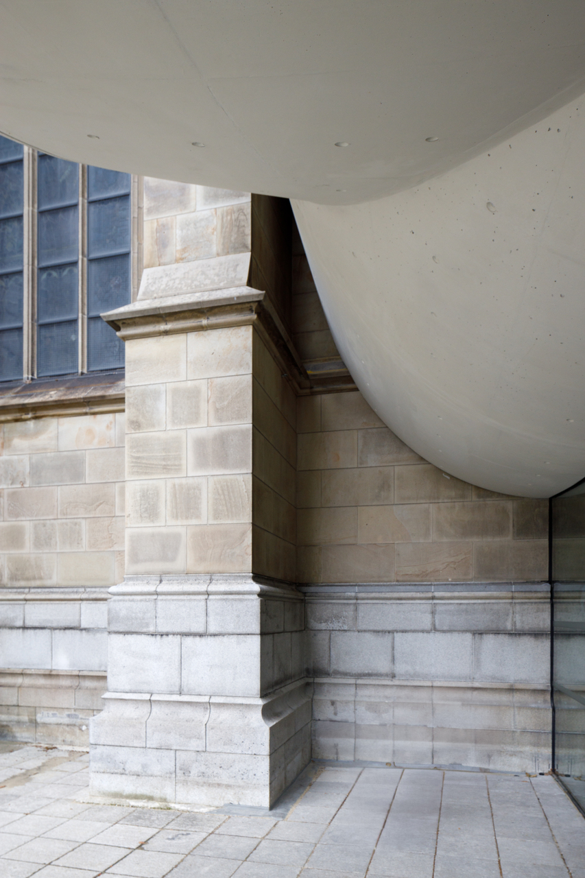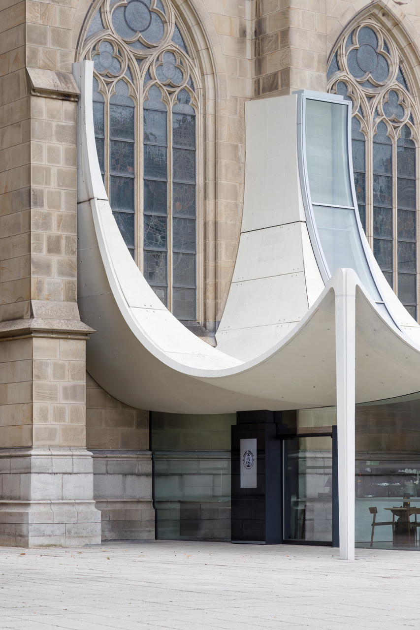 Die Architektur des Domcenters knüpft formal an die Tradition leichter Zeltdächer an. Sie besteht aus drei Baldachinen, die wie von der Fassade des Domes abgehängt wirken. Ihre Form erinnert an umgekehrte Gewölbekonstruktionen und wirkt damit sehr leicht. Entsprechend der steinernen Hülle des Domes wurde eine technologisch höchst anspruchsvolle, frei geformte Betonkonstruktion gewählt. Diese ermöglicht eine schlanke Profilierung. Aus denkmalpflegerischen Gründen durfte der Anbau an keiner Stelle konstruktiv mit dem Dom verbunden werden, weshalb die drei Schalenkonstruktionen auf jeweils einer Stütze stehen. Die Schalen ragen vor der Fassade nach oben und nähern sich dabei der Fassade des Domes, ohne diesen zu berühren. Die Baldachinstützen übernehmen lediglich Zugfunktionen, um ein Kippen zum Dom hin zu verhindern. Die Konstruktion der Baldachine besteht aus einer Doppelschale: Die untere, tragende Schale ist dreidimensional gekrümmt, um im Inneren eine weiche, angenehme Atmosphäre zu schaffen. Die obere, auf einer Zwischendämmung aufgelegte Schale ist nur zweidimensional gebogen und entspricht somit der Umkehrung der Spitzgewölbe in den Seitenschiffen des historischen Domes.