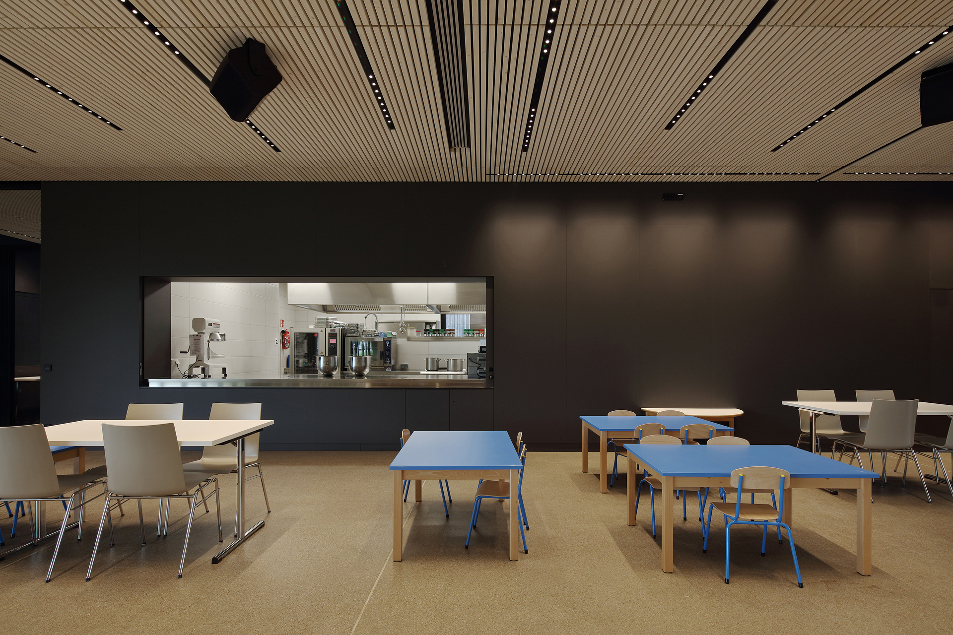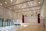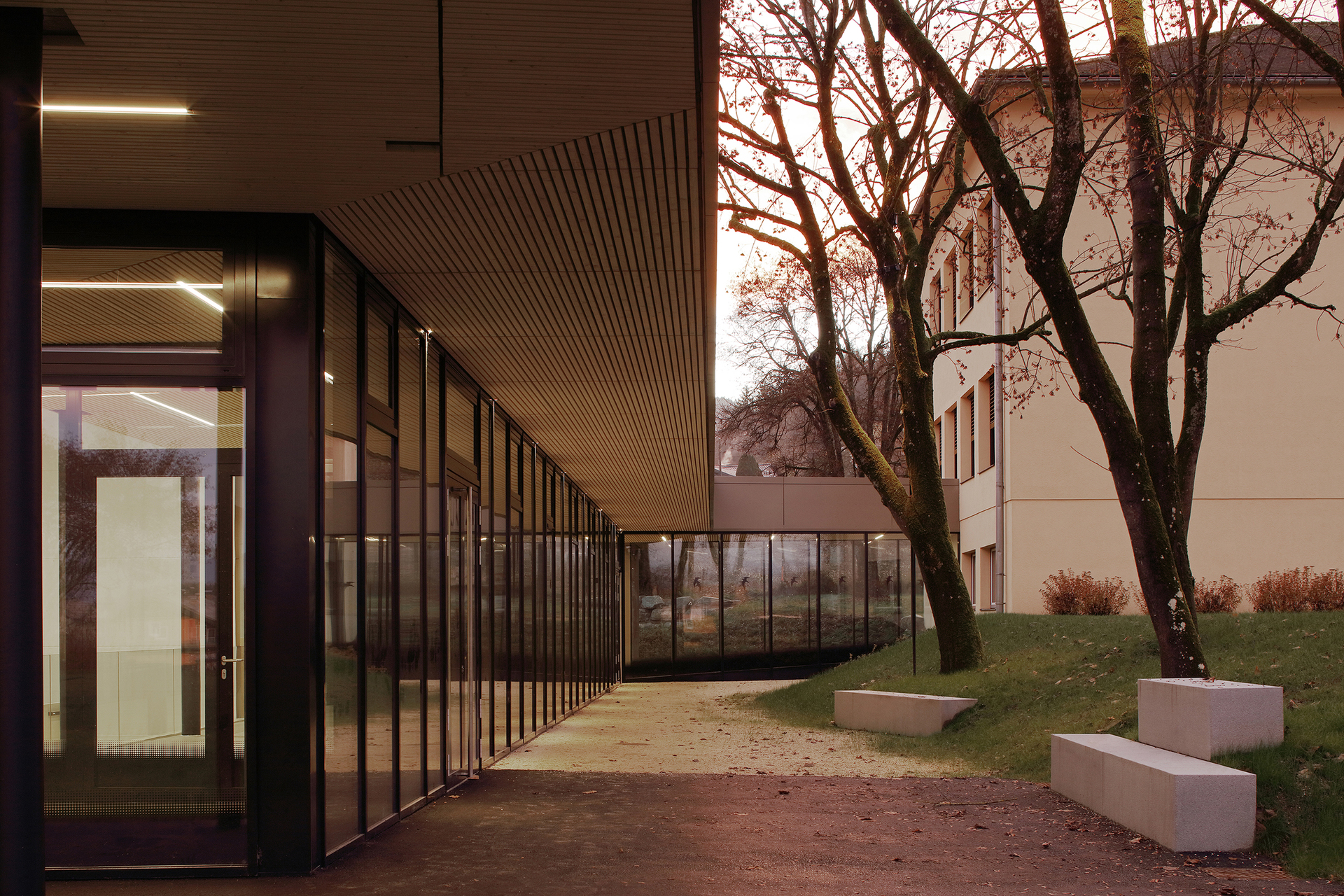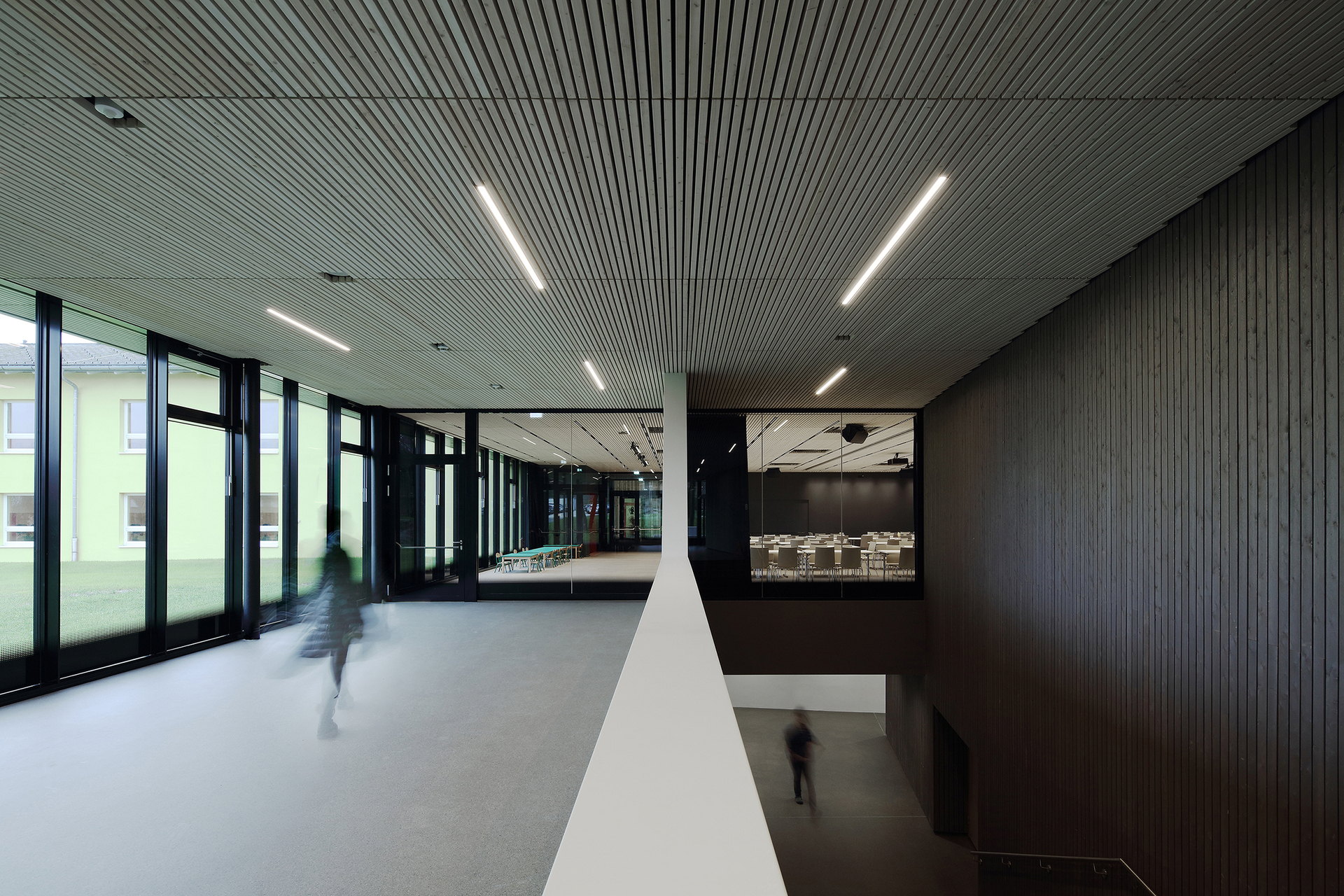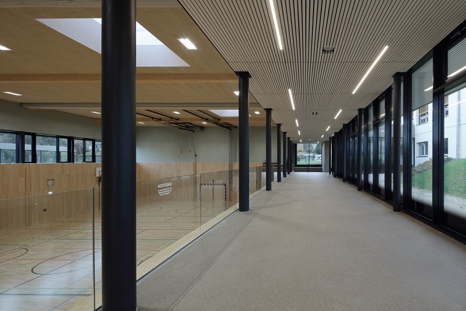 Die Aufschließung der Turnhalle erfolgt jeweils nördlich und südlich über einen entsprechenden Windfang und Foyer. Den Foyers sind Garderoben zugeordnet, welche für die Nutzung außerhalb des Schulbetriebs gedacht sind. Der Zugang für Schüler erfolgt über die jeweils bestehenden Schulgebäude. Die neue Turnhalle wird über eine zentrale Treppe in das Untergeschoss erschlossen. Die Halle wird durch Trennvorhänge dreifach teilbar ausgeführt.
