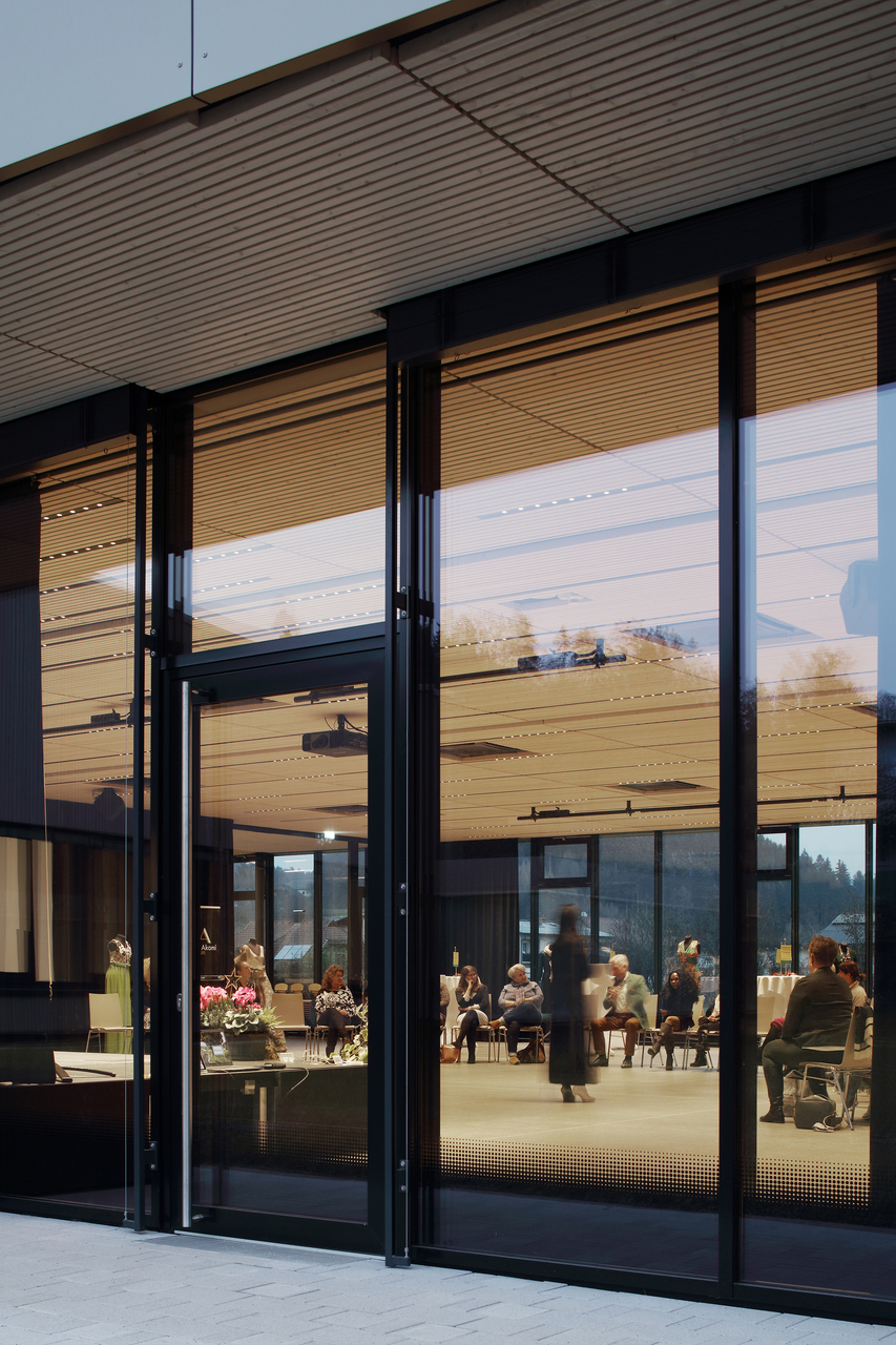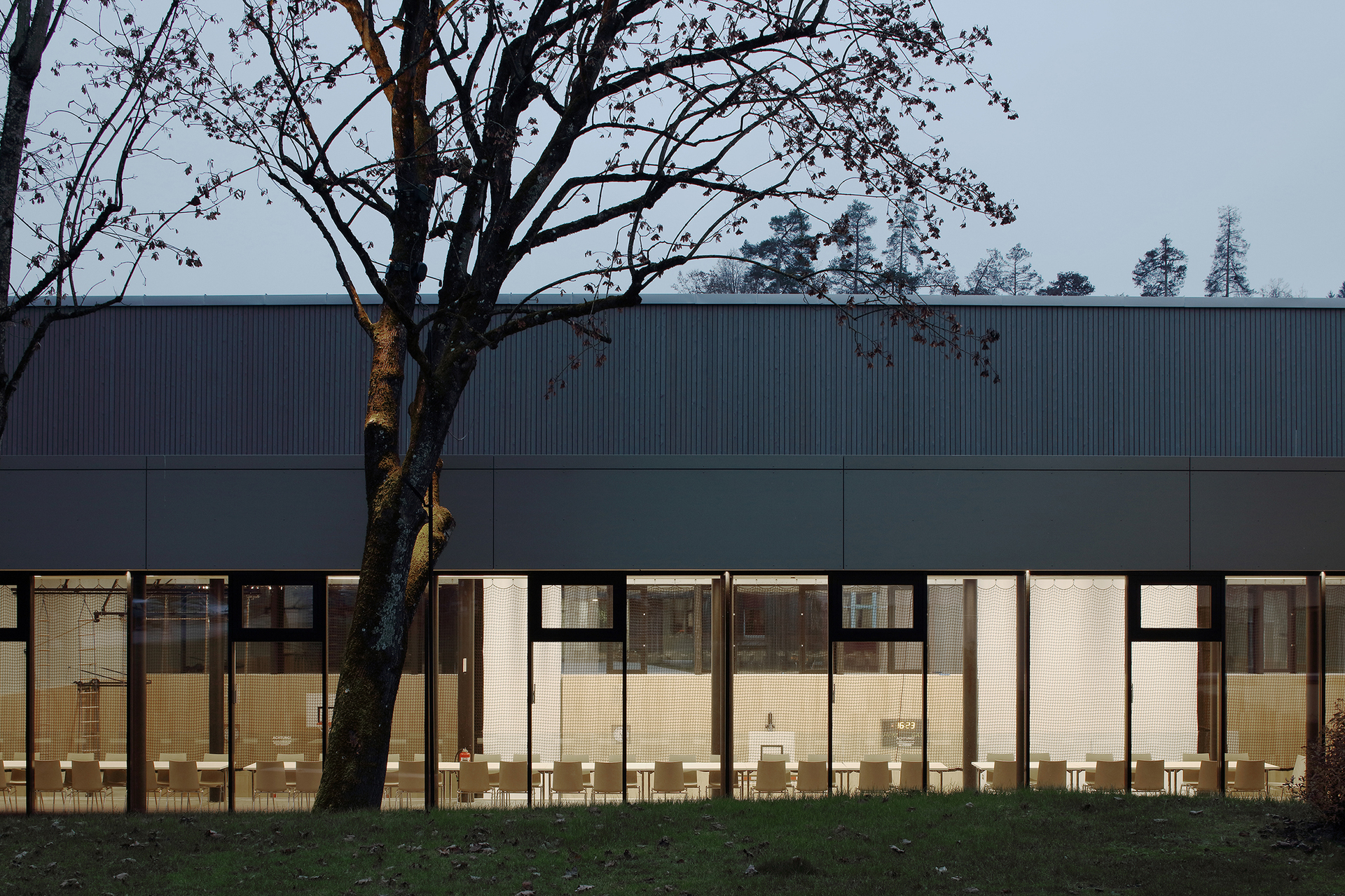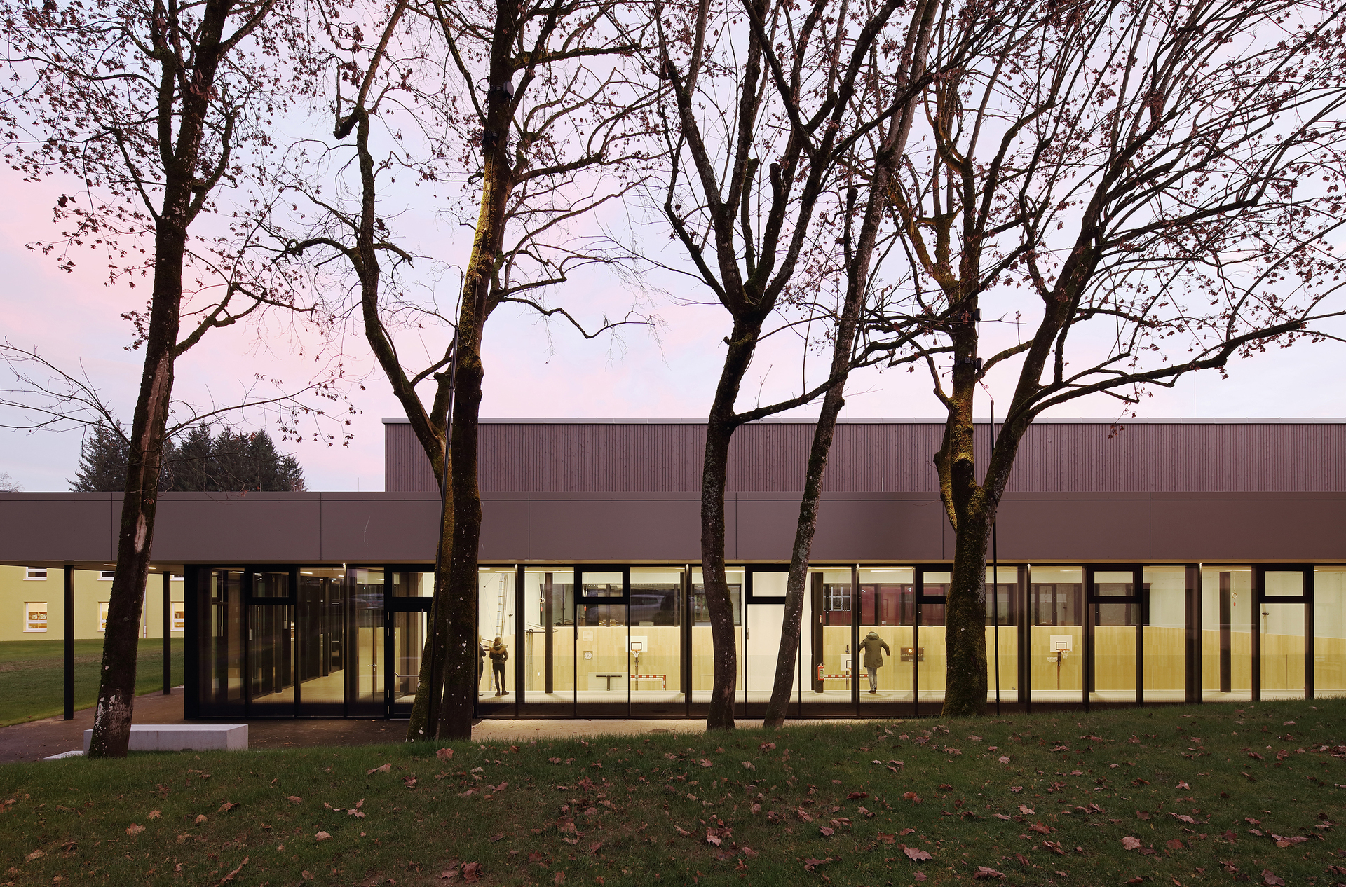 Der Neubau wird in Massivbauweise ausgeführt. Die Dachkonstruktion der Turnhalle mit Leimholzträgern als Primär- und Holz-Werkstoffplatten als Sekundärkonstruktion. Die Fassadenkonstruktion der Turnhalle besteht aus einer hinterlüfteten Holzfassade. Die Fassade des Verbindungsbaus wird mittels Pfosten-Riegel-Konstruktion verglast sowie als hinterlüftete Konstruktion mit Alu-Verbundplatten ausgeführt. (Text: Architekten, bearbeitet)